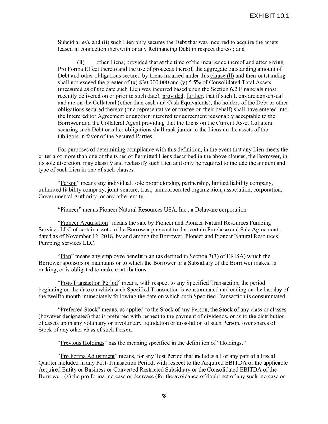 Subsidiaries), and (ii) such Lien only secures the Debt that was incurred to acquire the assets leased in connection therewith or any Refinancing Debt in respect thereof; and (ll) other Liens; provided that at the time of the incurrence thereof and after giving Pro Forma Effect thereto and the use of proceeds thereof, the aggregate outstanding amount of Debt and other obligations secured by Liens incurred under this clause (ll) and then-outstanding shall not exceed the greater of (x) $30,000,000 and (y) 5.5% of Consolidated Total Assets (measured as of the date such Lien was incurred based upon the Section 6.2 Financials most recently delivered on or prior to such date); provided, further, that if such Liens are consensual and are on the Collateral (other than cash and Cash Equivalents), the holders of the Debt or other obligations secured thereby (or a representative or trustee on their behalf) shall have entered into the Intercreditor Agreement or another intercreditor agreement reasonably acceptable to the Borrower and the Collateral Agent providing that the Liens on the Current Asset Collateral securing such Debt or other obligations shall rank junior to the Liens on the assets of the Obligors in favor of the Secured Parties. For purposes of determining compliance with this definition, in the event that any Lien meets the criteria of more than one of the types of Permitted Liens described in the above clauses, the Borrower, in its sole discretion, may classify and reclassify such Lien and only be required to include the amount and type of such Lien in one of such clauses. “Person” means any individual, sole proprietorship, partnership, limited liability company, unlimited liability company, joint venture, trust, unincorporated organization, association, corporation, Governmental Authority, or any other entity. “Pioneer” means Pioneer Natural Resources USA, Inc., a Delaware corporation. “Pioneer Acquisition” means the sale by Pioneer and Pioneer Natural Resources Pumping Services LLC of certain assets to the Borrower pursuant to that certain Purchase and Sale Agreement, dated as of November 12, 2018, by and among the Borrower, Pioneer and Pioneer Natural Resources Pumping Services LLC. “Plan” means any employee benefit plan (as defined in Section 3(3) of ERISA) which the Borrower sponsors or maintains or to which the Borrower or a Subsidiary of the Borrower makes, is making, or is obligated to make contributions. “Post-Transaction Period” means, with respect to any Specified Transaction, the period beginning on the date on which such Specified Transaction is consummated and ending on the last day of the twelfth month immediately following the date on which such Specified Transaction is consummated. “Preferred Stock” means, as applied to the Stock of any Person, the Stock of any class or classes (however designated) that is preferred with respect to the payment of dividends, or as to the distribution of assets upon any voluntary or involuntary liquidation or dissolution of such Person, over shares of Stock of any other class of such Person. “Previous Holdings” has the meaning specified in the definition of “Holdings.” “Pro Forma Adjustment” means, for any Test Period that includes all or any part of a Fiscal Quarter included in any Post-Transaction Period, with respect to the Acquired EBITDA of the applicable Acquired Entity or Business or Converted Restricted Subsidiary or the Consolidated EBITDA of the Borrower, (a) the pro forma increase or decrease (for the avoidance of doubt net of any such increase or 58 EXHIBIT 10.1