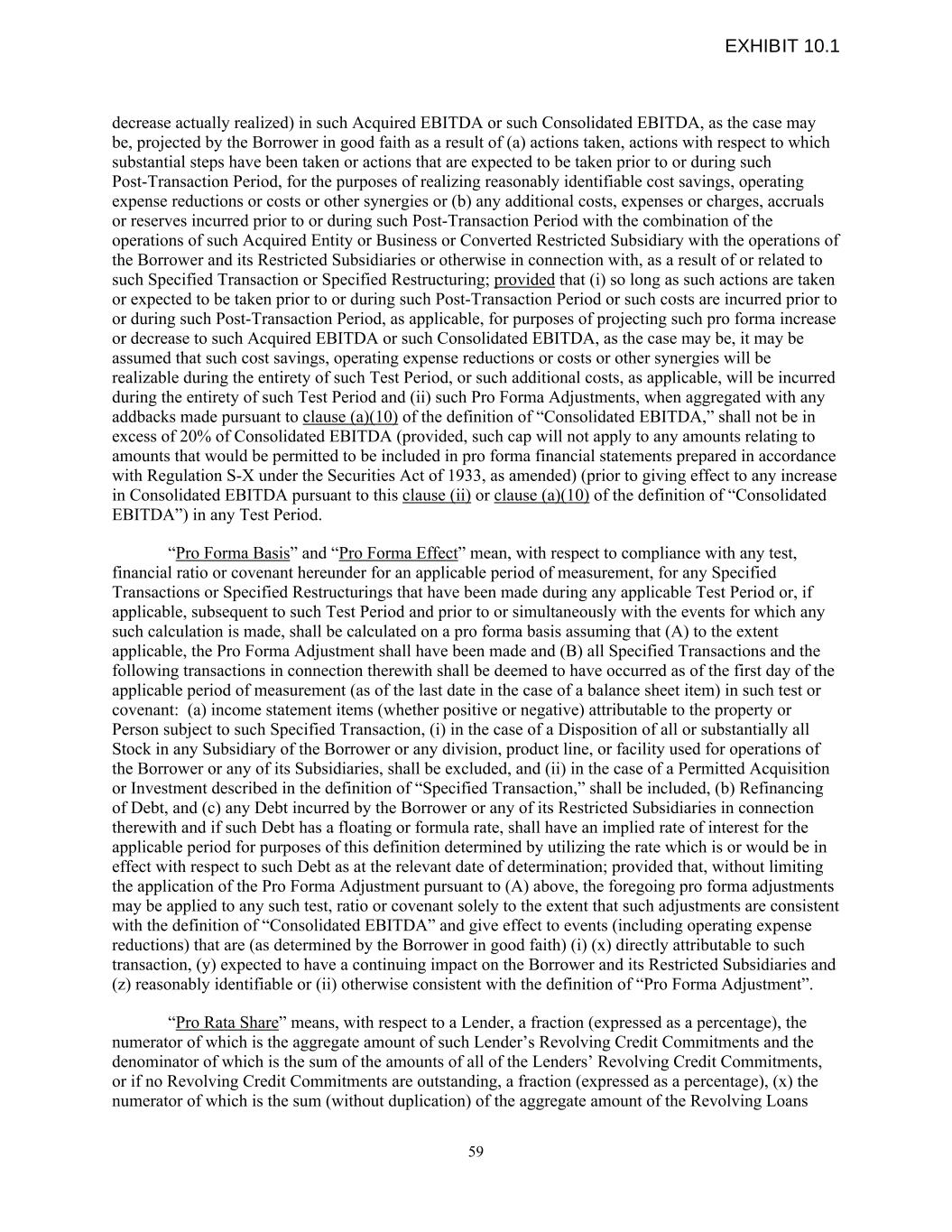 decrease actually realized) in such Acquired EBITDA or such Consolidated EBITDA, as the case may be, projected by the Borrower in good faith as a result of (a) actions taken, actions with respect to which substantial steps have been taken or actions that are expected to be taken prior to or during such Post-Transaction Period, for the purposes of realizing reasonably identifiable cost savings, operating expense reductions or costs or other synergies or (b) any additional costs, expenses or charges, accruals or reserves incurred prior to or during such Post-Transaction Period with the combination of the operations of such Acquired Entity or Business or Converted Restricted Subsidiary with the operations of the Borrower and its Restricted Subsidiaries or otherwise in connection with, as a result of or related to such Specified Transaction or Specified Restructuring; provided that (i) so long as such actions are taken or expected to be taken prior to or during such Post-Transaction Period or such costs are incurred prior to or during such Post-Transaction Period, as applicable, for purposes of projecting such pro forma increase or decrease to such Acquired EBITDA or such Consolidated EBITDA, as the case may be, it may be assumed that such cost savings, operating expense reductions or costs or other synergies will be realizable during the entirety of such Test Period, or such additional costs, as applicable, will be incurred during the entirety of such Test Period and (ii) such Pro Forma Adjustments, when aggregated with any addbacks made pursuant to clause (a)(10) of the definition of “Consolidated EBITDA,” shall not be in excess of 20% of Consolidated EBITDA (provided, such cap will not apply to any amounts relating to amounts that would be permitted to be included in pro forma financial statements prepared in accordance with Regulation S-X under the Securities Act of 1933, as amended) (prior to giving effect to any increase in Consolidated EBITDA pursuant to this clause (ii) or clause (a)(10) of the definition of “Consolidated EBITDA”) in any Test Period. “Pro Forma Basis” and “Pro Forma Effect” mean, with respect to compliance with any test, financial ratio or covenant hereunder for an applicable period of measurement, for any Specified Transactions or Specified Restructurings that have been made during any applicable Test Period or, if applicable, subsequent to such Test Period and prior to or simultaneously with the events for which any such calculation is made, shall be calculated on a pro forma basis assuming that (A) to the extent applicable, the Pro Forma Adjustment shall have been made and (B) all Specified Transactions and the following transactions in connection therewith shall be deemed to have occurred as of the first day of the applicable period of measurement (as of the last date in the case of a balance sheet item) in such test or covenant: (a) income statement items (whether positive or negative) attributable to the property or Person subject to such Specified Transaction, (i) in the case of a Disposition of all or substantially all Stock in any Subsidiary of the Borrower or any division, product line, or facility used for operations of the Borrower or any of its Subsidiaries, shall be excluded, and (ii) in the case of a Permitted Acquisition or Investment described in the definition of “Specified Transaction,” shall be included, (b) Refinancing of Debt, and (c) any Debt incurred by the Borrower or any of its Restricted Subsidiaries in connection therewith and if such Debt has a floating or formula rate, shall have an implied rate of interest for the applicable period for purposes of this definition determined by utilizing the rate which is or would be in effect with respect to such Debt as at the relevant date of determination; provided that, without limiting the application of the Pro Forma Adjustment pursuant to (A) above, the foregoing pro forma adjustments may be applied to any such test, ratio or covenant solely to the extent that such adjustments are consistent with the definition of “Consolidated EBITDA” and give effect to events (including operating expense reductions) that are (as determined by the Borrower in good faith) (i) (x) directly attributable to such transaction, (y) expected to have a continuing impact on the Borrower and its Restricted Subsidiaries and (z) reasonably identifiable or (ii) otherwise consistent with the definition of “Pro Forma Adjustment”. “Pro Rata Share” means, with respect to a Lender, a fraction (expressed as a percentage), the numerator of which is the aggregate amount of such Lender’s Revolving Credit Commitments and the denominator of which is the sum of the amounts of all of the Lenders’ Revolving Credit Commitments, or if no Revolving Credit Commitments are outstanding, a fraction (expressed as a percentage), (x) the numerator of which is the sum (without duplication) of the aggregate amount of the Revolving Loans 59 EXHIBIT 10.1