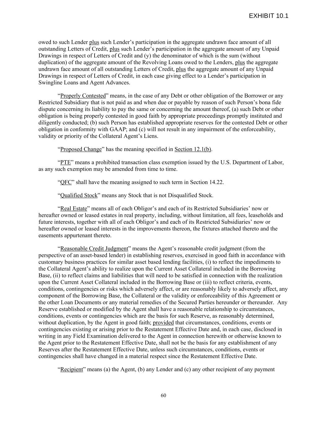 owed to such Lender plus such Lender’s participation in the aggregate undrawn face amount of all outstanding Letters of Credit, plus such Lender’s participation in the aggregate amount of any Unpaid Drawings in respect of Letters of Credit and (y) the denominator of which is the sum (without duplication) of the aggregate amount of the Revolving Loans owed to the Lenders, plus the aggregate undrawn face amount of all outstanding Letters of Credit, plus the aggregate amount of any Unpaid Drawings in respect of Letters of Credit, in each case giving effect to a Lender’s participation in Swingline Loans and Agent Advances. “Properly Contested” means, in the case of any Debt or other obligation of the Borrower or any Restricted Subsidiary that is not paid as and when due or payable by reason of such Person’s bona fide dispute concerning its liability to pay the same or concerning the amount thereof, (a) such Debt or other obligation is being properly contested in good faith by appropriate proceedings promptly instituted and diligently conducted; (b) such Person has established appropriate reserves for the contested Debt or other obligation in conformity with GAAP; and (c) will not result in any impairment of the enforceability, validity or priority of the Collateral Agent’s Liens. “Proposed Change” has the meaning specified in Section 12.1(b). “PTE” means a prohibited transaction class exemption issued by the U.S. Department of Labor, as any such exemption may be amended from time to time. “QFC” shall have the meaning assigned to such term in Section 14.22. “Qualified Stock” means any Stock that is not Disqualified Stock. “Real Estate” means all of each Obligor’s and each of its Restricted Subsidiaries’ now or hereafter owned or leased estates in real property, including, without limitation, all fees, leaseholds and future interests, together with all of each Obligor’s and each of its Restricted Subsidiaries’ now or hereafter owned or leased interests in the improvements thereon, the fixtures attached thereto and the easements appurtenant thereto. “Reasonable Credit Judgment” means the Agent’s reasonable credit judgment (from the perspective of an asset-based lender) in establishing reserves, exercised in good faith in accordance with customary business practices for similar asset based lending facilities, (i) to reflect the impediments to the Collateral Agent’s ability to realize upon the Current Asset Collateral included in the Borrowing Base, (ii) to reflect claims and liabilities that will need to be satisfied in connection with the realization upon the Current Asset Collateral included in the Borrowing Base or (iii) to reflect criteria, events, conditions, contingencies or risks which adversely affect, or are reasonably likely to adversely affect, any component of the Borrowing Base, the Collateral or the validity or enforceability of this Agreement or the other Loan Documents or any material remedies of the Secured Parties hereunder or thereunder. Any Reserve established or modified by the Agent shall have a reasonable relationship to circumstances, conditions, events or contingencies which are the basis for such Reserve, as reasonably determined, without duplication, by the Agent in good faith; provided that circumstances, conditions, events or contingencies existing or arising prior to the Restatement Effective Date and, in each case, disclosed in writing in any Field Examination delivered to the Agent in connection herewith or otherwise known to the Agent prior to the Restatement Effective Date, shall not be the basis for any establishment of any Reserves after the Restatement Effective Date, unless such circumstances, conditions, events or contingencies shall have changed in a material respect since the Restatement Effective Date. “Recipient” means (a) the Agent, (b) any Lender and (c) any other recipient of any payment 60 EXHIBIT 10.1