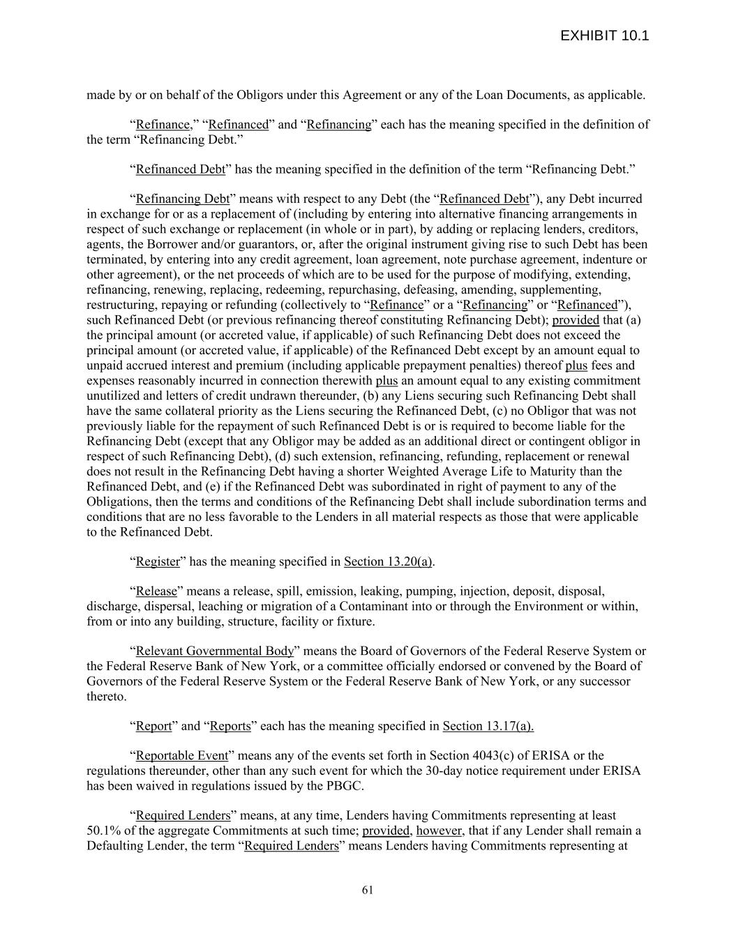 made by or on behalf of the Obligors under this Agreement or any of the Loan Documents, as applicable. “Refinance,” “Refinanced” and “Refinancing” each has the meaning specified in the definition of the term “Refinancing Debt.” “Refinanced Debt” has the meaning specified in the definition of the term “Refinancing Debt.” “Refinancing Debt” means with respect to any Debt (the “Refinanced Debt”), any Debt incurred in exchange for or as a replacement of (including by entering into alternative financing arrangements in respect of such exchange or replacement (in whole or in part), by adding or replacing lenders, creditors, agents, the Borrower and/or guarantors, or, after the original instrument giving rise to such Debt has been terminated, by entering into any credit agreement, loan agreement, note purchase agreement, indenture or other agreement), or the net proceeds of which are to be used for the purpose of modifying, extending, refinancing, renewing, replacing, redeeming, repurchasing, defeasing, amending, supplementing, restructuring, repaying or refunding (collectively to “Refinance” or a “Refinancing” or “Refinanced”), such Refinanced Debt (or previous refinancing thereof constituting Refinancing Debt); provided that (a) the principal amount (or accreted value, if applicable) of such Refinancing Debt does not exceed the principal amount (or accreted value, if applicable) of the Refinanced Debt except by an amount equal to unpaid accrued interest and premium (including applicable prepayment penalties) thereof plus fees and expenses reasonably incurred in connection therewith plus an amount equal to any existing commitment unutilized and letters of credit undrawn thereunder, (b) any Liens securing such Refinancing Debt shall have the same collateral priority as the Liens securing the Refinanced Debt, (c) no Obligor that was not previously liable for the repayment of such Refinanced Debt is or is required to become liable for the Refinancing Debt (except that any Obligor may be added as an additional direct or contingent obligor in respect of such Refinancing Debt), (d) such extension, refinancing, refunding, replacement or renewal does not result in the Refinancing Debt having a shorter Weighted Average Life to Maturity than the Refinanced Debt, and (e) if the Refinanced Debt was subordinated in right of payment to any of the Obligations, then the terms and conditions of the Refinancing Debt shall include subordination terms and conditions that are no less favorable to the Lenders in all material respects as those that were applicable to the Refinanced Debt. “Register” has the meaning specified in Section 13.20(a). “Release” means a release, spill, emission, leaking, pumping, injection, deposit, disposal, discharge, dispersal, leaching or migration of a Contaminant into or through the Environment or within, from or into any building, structure, facility or fixture. “Relevant Governmental Body” means the Board of Governors of the Federal Reserve System or the Federal Reserve Bank of New York, or a committee officially endorsed or convened by the Board of Governors of the Federal Reserve System or the Federal Reserve Bank of New York, or any successor thereto. “Report” and “Reports” each has the meaning specified in Section 13.17(a). “Reportable Event” means any of the events set forth in Section 4043(c) of ERISA or the regulations thereunder, other than any such event for which the 30-day notice requirement under ERISA has been waived in regulations issued by the PBGC. “Required Lenders” means, at any time, Lenders having Commitments representing at least 50.1% of the aggregate Commitments at such time; provided, however, that if any Lender shall remain a Defaulting Lender, the term “Required Lenders” means Lenders having Commitments representing at 61 EXHIBIT 10.1