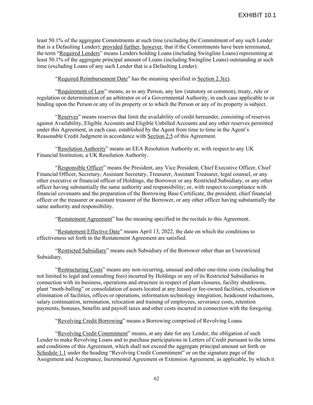 least 50.1% of the aggregate Commitments at such time (excluding the Commitment of any such Lender that is a Defaulting Lender); provided further, however, that if the Commitments have been terminated, the term “Required Lenders” means Lenders holding Loans (including Swingline Loans) representing at least 50.1% of the aggregate principal amount of Loans (including Swingline Loans) outstanding at such time (excluding Loans of any such Lender that is a Defaulting Lender). “Required Reimbursement Date” has the meaning specified in Section 2.3(e). “Requirement of Law” means, as to any Person, any law (statutory or common), treaty, rule or regulation or determination of an arbitrator or of a Governmental Authority, in each case applicable to or binding upon the Person or any of its property or to which the Person or any of its property is subject. “Reserves” means reserves that limit the availability of credit hereunder, consisting of reserves against Availability, Eligible Accounts and Eligible Unbilled Accounts and any other reserves permitted under this Agreement, in each case, established by the Agent from time to time in the Agent’s Reasonable Credit Judgment in accordance with Section 2.5 of this Agreement. “Resolution Authority” means an EEA Resolution Authority or, with respect to any UK Financial Institution, a UK Resolution Authority. “Responsible Officer” means the President, any Vice President, Chief Executive Officer, Chief Financial Officer, Secretary, Assistant Secretary, Treasurer, Assistant Treasurer, legal counsel, or any other executive or financial officer of Holdings, the Borrower or any Restricted Subsidiary, or any other officer having substantially the same authority and responsibility; or, with respect to compliance with financial covenants and the preparation of the Borrowing Base Certificate, the president, chief financial officer or the treasurer or assistant treasurer of the Borrower, or any other officer having substantially the same authority and responsibility. “Restatement Agreement” has the meaning specified in the recitals to this Agreement. “Restatement Effective Date” means April 13, 2022, the date on which the conditions to effectiveness set forth in the Restatement Agreement are satisfied. “Restricted Subsidiary” means each Subsidiary of the Borrower other than an Unrestricted Subsidiary. “Restructuring Costs” means any non-recurring, unusual and other one-time costs (including but not limited to legal and consulting fees) incurred by Holdings or any of its Restricted Subsidiaries in connection with its business, operations and structure in respect of plant closures, facility shutdowns, plant “moth-balling” or consolidation of assets located at any leased or fee-owned facilities, relocation or elimination of facilities, offices or operations, information technology integration, headcount reductions, salary continuation, termination, relocation and training of employees, severance costs, retention payments, bonuses, benefits and payroll taxes and other costs incurred in connection with the foregoing. “Revolving Credit Borrowing” means a Borrowing comprised of Revolving Loans. “Revolving Credit Commitment” means, at any date for any Lender, the obligation of such Lender to make Revolving Loans and to purchase participations in Letters of Credit pursuant to the terms and conditions of this Agreement, which shall not exceed the aggregate principal amount set forth on Schedule 1.1 under the heading “Revolving Credit Commitment” or on the signature page of the Assignment and Acceptance, Incremental Agreement or Extension Agreement, as applicable, by which it 62 EXHIBIT 10.1
