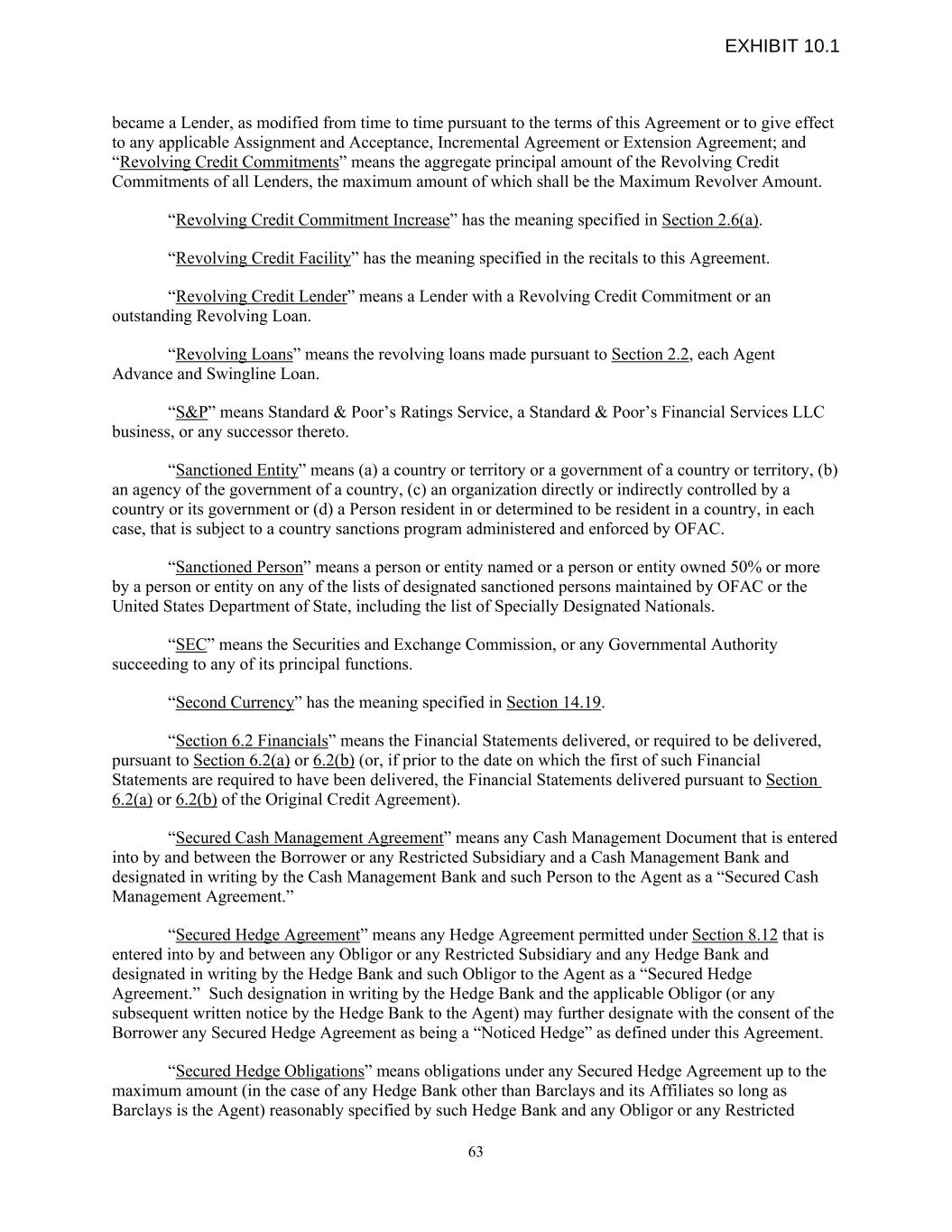 became a Lender, as modified from time to time pursuant to the terms of this Agreement or to give effect to any applicable Assignment and Acceptance, Incremental Agreement or Extension Agreement; and “Revolving Credit Commitments” means the aggregate principal amount of the Revolving Credit Commitments of all Lenders, the maximum amount of which shall be the Maximum Revolver Amount. “Revolving Credit Commitment Increase” has the meaning specified in Section 2.6(a). “Revolving Credit Facility” has the meaning specified in the recitals to this Agreement. “Revolving Credit Lender” means a Lender with a Revolving Credit Commitment or an outstanding Revolving Loan. “Revolving Loans” means the revolving loans made pursuant to Section 2.2, each Agent Advance and Swingline Loan. “S&P” means Standard & Poor’s Ratings Service, a Standard & Poor’s Financial Services LLC business, or any successor thereto. “Sanctioned Entity” means (a) a country or territory or a government of a country or territory, (b) an agency of the government of a country, (c) an organization directly or indirectly controlled by a country or its government or (d) a Person resident in or determined to be resident in a country, in each case, that is subject to a country sanctions program administered and enforced by OFAC. “Sanctioned Person” means a person or entity named or a person or entity owned 50% or more by a person or entity on any of the lists of designated sanctioned persons maintained by OFAC or the United States Department of State, including the list of Specially Designated Nationals. “SEC” means the Securities and Exchange Commission, or any Governmental Authority succeeding to any of its principal functions. “Second Currency” has the meaning specified in Section 14.19. “Section 6.2 Financials” means the Financial Statements delivered, or required to be delivered, pursuant to Section 6.2(a) or 6.2(b) (or, if prior to the date on which the first of such Financial Statements are required to have been delivered, the Financial Statements delivered pursuant to Section 6.2(a) or 6.2(b) of the Original Credit Agreement). “Secured Cash Management Agreement” means any Cash Management Document that is entered into by and between the Borrower or any Restricted Subsidiary and a Cash Management Bank and designated in writing by the Cash Management Bank and such Person to the Agent as a “Secured Cash Management Agreement.” “Secured Hedge Agreement” means any Hedge Agreement permitted under Section 8.12 that is entered into by and between any Obligor or any Restricted Subsidiary and any Hedge Bank and designated in writing by the Hedge Bank and such Obligor to the Agent as a “Secured Hedge Agreement.” Such designation in writing by the Hedge Bank and the applicable Obligor (or any subsequent written notice by the Hedge Bank to the Agent) may further designate with the consent of the Borrower any Secured Hedge Agreement as being a “Noticed Hedge” as defined under this Agreement. “Secured Hedge Obligations” means obligations under any Secured Hedge Agreement up to the maximum amount (in the case of any Hedge Bank other than Barclays and its Affiliates so long as Barclays is the Agent) reasonably specified by such Hedge Bank and any Obligor or any Restricted 63 EXHIBIT 10.1