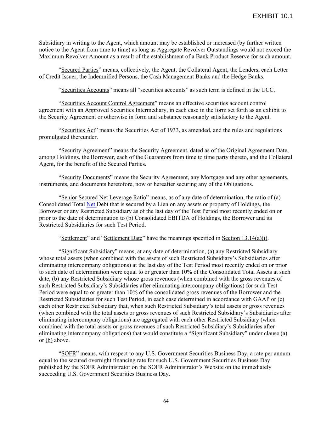 Subsidiary in writing to the Agent, which amount may be established or increased (by further written notice to the Agent from time to time) as long as Aggregate Revolver Outstandings would not exceed the Maximum Revolver Amount as a result of the establishment of a Bank Product Reserve for such amount. “Secured Parties” means, collectively, the Agent, the Collateral Agent, the Lenders, each Letter of Credit Issuer, the Indemnified Persons, the Cash Management Banks and the Hedge Banks. “Securities Accounts” means all “securities accounts” as such term is defined in the UCC. “Securities Account Control Agreement” means an effective securities account control agreement with an Approved Securities Intermediary, in each case in the form set forth as an exhibit to the Security Agreement or otherwise in form and substance reasonably satisfactory to the Agent. “Securities Act” means the Securities Act of 1933, as amended, and the rules and regulations promulgated thereunder. “Security Agreement” means the Security Agreement, dated as of the Original Agreement Date, among Holdings, the Borrower, each of the Guarantors from time to time party thereto, and the Collateral Agent, for the benefit of the Secured Parties. “Security Documents” means the Security Agreement, any Mortgage and any other agreements, instruments, and documents heretofore, now or hereafter securing any of the Obligations. “Senior Secured Net Leverage Ratio” means, as of any date of determination, the ratio of (a) Consolidated Total Net Debt that is secured by a Lien on any assets or property of Holdings, the Borrower or any Restricted Subsidiary as of the last day of the Test Period most recently ended on or prior to the date of determination to (b) Consolidated EBITDA of Holdings, the Borrower and its Restricted Subsidiaries for such Test Period. “Settlement” and “Settlement Date” have the meanings specified in Section 13.14(a)(i). “Significant Subsidiary” means, at any date of determination, (a) any Restricted Subsidiary whose total assets (when combined with the assets of such Restricted Subsidiary’s Subsidiaries after eliminating intercompany obligations) at the last day of the Test Period most recently ended on or prior to such date of determination were equal to or greater than 10% of the Consolidated Total Assets at such date, (b) any Restricted Subsidiary whose gross revenues (when combined with the gross revenues of such Restricted Subsidiary’s Subsidiaries after eliminating intercompany obligations) for such Test Period were equal to or greater than 10% of the consolidated gross revenues of the Borrower and the Restricted Subsidiaries for such Test Period, in each case determined in accordance with GAAP or (c) each other Restricted Subsidiary that, when such Restricted Subsidiary’s total assets or gross revenues (when combined with the total assets or gross revenues of such Restricted Subsidiary’s Subsidiaries after eliminating intercompany obligations) are aggregated with each other Restricted Subsidiary (when combined with the total assets or gross revenues of such Restricted Subsidiary’s Subsidiaries after eliminating intercompany obligations) that would constitute a “Significant Subsidiary” under clause (a) or (b) above. “SOFR” means, with respect to any U.S. Government Securities Business Day, a rate per annum equal to the secured overnight financing rate for such U.S. Government Securities Business Day published by the SOFR Administrator on the SOFR Administrator’s Website on the immediately succeeding U.S. Government Securities Business Day. 64 EXHIBIT 10.1