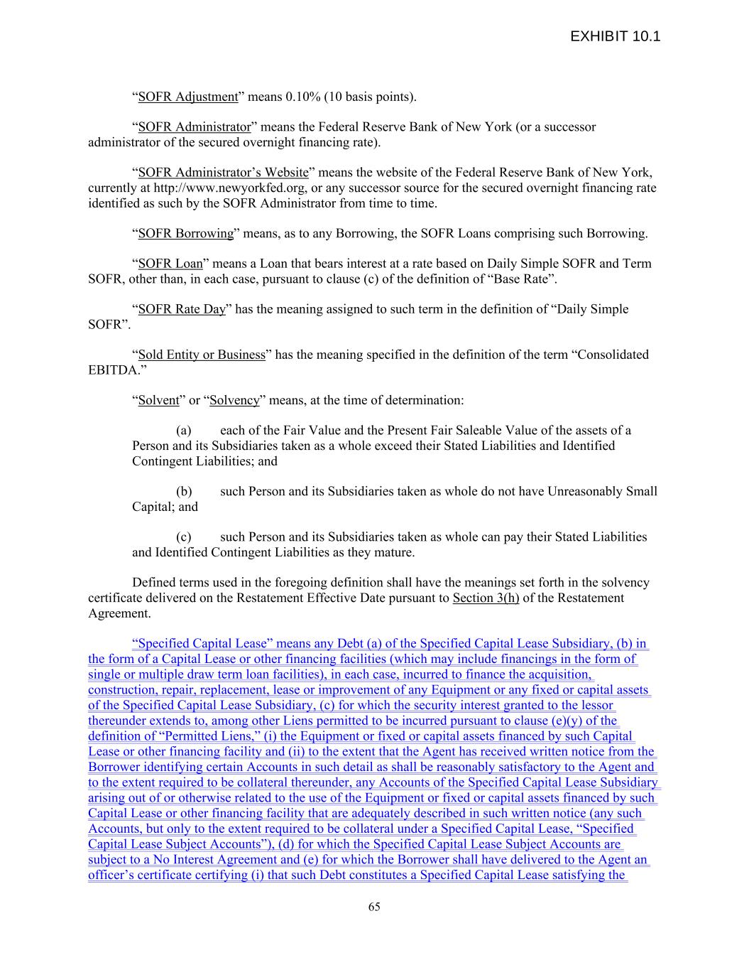 “SOFR Adjustment” means 0.10% (10 basis points). “SOFR Administrator” means the Federal Reserve Bank of New York (or a successor administrator of the secured overnight financing rate). “SOFR Administrator’s Website” means the website of the Federal Reserve Bank of New York, currently at http://www.newyorkfed.org, or any successor source for the secured overnight financing rate identified as such by the SOFR Administrator from time to time. “SOFR Borrowing” means, as to any Borrowing, the SOFR Loans comprising such Borrowing. “SOFR Loan” means a Loan that bears interest at a rate based on Daily Simple SOFR and Term SOFR, other than, in each case, pursuant to clause (c) of the definition of “Base Rate”. “SOFR Rate Day” has the meaning assigned to such term in the definition of “Daily Simple SOFR”. “Sold Entity or Business” has the meaning specified in the definition of the term “Consolidated EBITDA.” “Solvent” or “Solvency” means, at the time of determination: (a) each of the Fair Value and the Present Fair Saleable Value of the assets of a Person and its Subsidiaries taken as a whole exceed their Stated Liabilities and Identified Contingent Liabilities; and (b) such Person and its Subsidiaries taken as whole do not have Unreasonably Small Capital; and (c) such Person and its Subsidiaries taken as whole can pay their Stated Liabilities and Identified Contingent Liabilities as they mature. Defined terms used in the foregoing definition shall have the meanings set forth in the solvency certificate delivered on the Restatement Effective Date pursuant to Section 3(h) of the Restatement Agreement. “Specified Capital Lease” means any Debt (a) of the Specified Capital Lease Subsidiary, (b) in the form of a Capital Lease or other financing facilities (which may include financings in the form of single or multiple draw term loan facilities), in each case, incurred to finance the acquisition, construction, repair, replacement, lease or improvement of any Equipment or any fixed or capital assets of the Specified Capital Lease Subsidiary, (c) for which the security interest granted to the lessor thereunder extends to, among other Liens permitted to be incurred pursuant to clause (e)(y) of the definition of “Permitted Liens,” (i) the Equipment or fixed or capital assets financed by such Capital Lease or other financing facility and (ii) to the extent that the Agent has received written notice from the Borrower identifying certain Accounts in such detail as shall be reasonably satisfactory to the Agent and to the extent required to be collateral thereunder, any Accounts of the Specified Capital Lease Subsidiary arising out of or otherwise related to the use of the Equipment or fixed or capital assets financed by such Capital Lease or other financing facility that are adequately described in such written notice (any such Accounts, but only to the extent required to be collateral under a Specified Capital Lease, “Specified Capital Lease Subject Accounts”), (d) for which the Specified Capital Lease Subject Accounts are subject to a No Interest Agreement and (e) for which the Borrower shall have delivered to the Agent an officer’s certificate certifying (i) that such Debt constitutes a Specified Capital Lease satisfying the 65 EXHIBIT 10.1