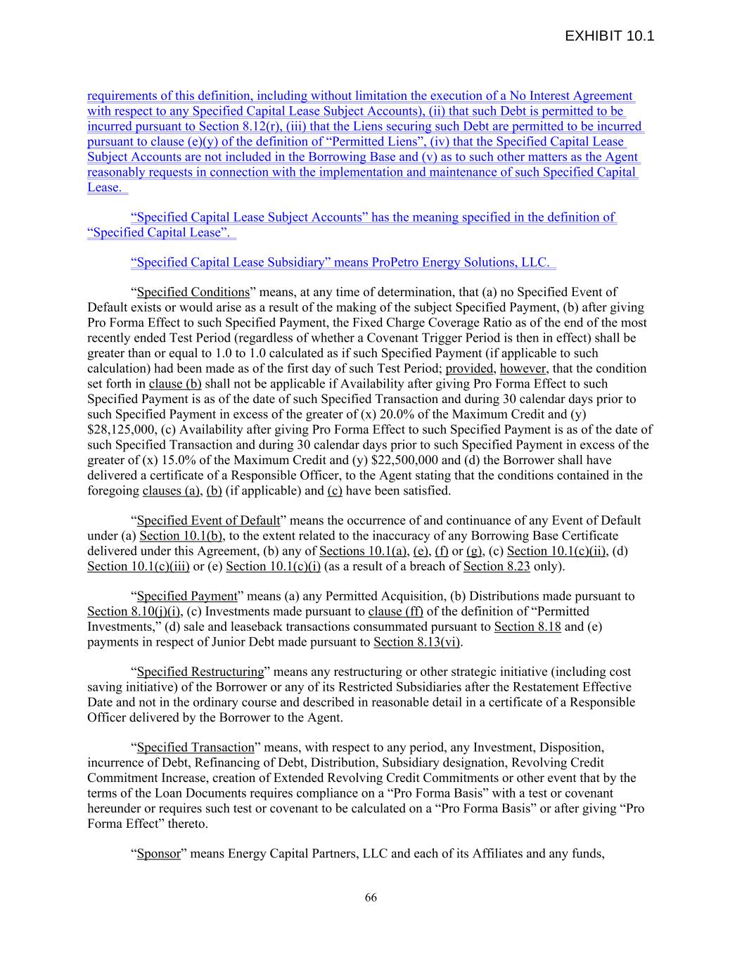 requirements of this definition, including without limitation the execution of a No Interest Agreement with respect to any Specified Capital Lease Subject Accounts), (ii) that such Debt is permitted to be incurred pursuant to Section 8.12(r), (iii) that the Liens securing such Debt are permitted to be incurred pursuant to clause (e)(y) of the definition of “Permitted Liens”, (iv) that the Specified Capital Lease Subject Accounts are not included in the Borrowing Base and (v) as to such other matters as the Agent reasonably requests in connection with the implementation and maintenance of such Specified Capital Lease. “Specified Capital Lease Subject Accounts” has the meaning specified in the definition of “Specified Capital Lease”. “Specified Capital Lease Subsidiary” means ProPetro Energy Solutions, LLC. “Specified Conditions” means, at any time of determination, that (a) no Specified Event of Default exists or would arise as a result of the making of the subject Specified Payment, (b) after giving Pro Forma Effect to such Specified Payment, the Fixed Charge Coverage Ratio as of the end of the most recently ended Test Period (regardless of whether a Covenant Trigger Period is then in effect) shall be greater than or equal to 1.0 to 1.0 calculated as if such Specified Payment (if applicable to such calculation) had been made as of the first day of such Test Period; provided, however, that the condition set forth in clause (b) shall not be applicable if Availability after giving Pro Forma Effect to such Specified Payment is as of the date of such Specified Transaction and during 30 calendar days prior to such Specified Payment in excess of the greater of (x) 20.0% of the Maximum Credit and (y) $28,125,000, (c) Availability after giving Pro Forma Effect to such Specified Payment is as of the date of such Specified Transaction and during 30 calendar days prior to such Specified Payment in excess of the greater of (x) 15.0% of the Maximum Credit and (y) $22,500,000 and (d) the Borrower shall have delivered a certificate of a Responsible Officer, to the Agent stating that the conditions contained in the foregoing clauses (a), (b) (if applicable) and (c) have been satisfied. “Specified Event of Default” means the occurrence of and continuance of any Event of Default under (a) Section 10.1(b), to the extent related to the inaccuracy of any Borrowing Base Certificate delivered under this Agreement, (b) any of Sections 10.1(a), (e), (f) or (g), (c) Section 10.1(c)(ii), (d) Section 10.1(c)(iii) or (e) Section 10.1(c)(i) (as a result of a breach of Section 8.23 only). “Specified Payment” means (a) any Permitted Acquisition, (b) Distributions made pursuant to Section 8.10(j)(i), (c) Investments made pursuant to clause (ff) of the definition of “Permitted Investments,” (d) sale and leaseback transactions consummated pursuant to Section 8.18 and (e) payments in respect of Junior Debt made pursuant to Section 8.13(vi). “Specified Restructuring” means any restructuring or other strategic initiative (including cost saving initiative) of the Borrower or any of its Restricted Subsidiaries after the Restatement Effective Date and not in the ordinary course and described in reasonable detail in a certificate of a Responsible Officer delivered by the Borrower to the Agent. “Specified Transaction” means, with respect to any period, any Investment, Disposition, incurrence of Debt, Refinancing of Debt, Distribution, Subsidiary designation, Revolving Credit Commitment Increase, creation of Extended Revolving Credit Commitments or other event that by the terms of the Loan Documents requires compliance on a “Pro Forma Basis” with a test or covenant hereunder or requires such test or covenant to be calculated on a “Pro Forma Basis” or after giving “Pro Forma Effect” thereto. “Sponsor” means Energy Capital Partners, LLC and each of its Affiliates and any funds, 66 EXHIBIT 10.1