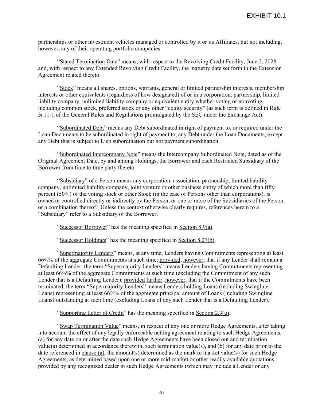 partnerships or other investment vehicles managed or controlled by it or its Affiliates, but not including, however, any of their operating portfolio companies. “Stated Termination Date” means, with respect to the Revolving Credit Facility, June 2, 2028 and, with respect to any Extended Revolving Credit Facility, the maturity date set forth in the Extension Agreement related thereto. “Stock” means all shares, options, warrants, general or limited partnership interests, membership interests or other equivalents (regardless of how designated) of or in a corporation, partnership, limited liability company, unlimited liability company or equivalent entity whether voting or nonvoting, including common stock, preferred stock or any other “equity security” (as such term is defined in Rule 3a11-1 of the General Rules and Regulations promulgated by the SEC under the Exchange Act). “Subordinated Debt” means any Debt subordinated in right of payment to, or required under the Loan Documents to be subordinated in right of payment to, any Debt under the Loan Documents, except any Debt that is subject to Lien subordination but not payment subordination. “Subordinated Intercompany Note” means the Intercompany Subordinated Note, dated as of the Original Agreement Date, by and among Holdings, the Borrower and each Restricted Subsidiary of the Borrower from time to time party thereto. “Subsidiary” of a Person means any corporation, association, partnership, limited liability company, unlimited liability company, joint venture or other business entity of which more than fifty percent (50%) of the voting stock or other Stock (in the case of Persons other than corporations), is owned or controlled directly or indirectly by the Person, or one or more of the Subsidiaries of the Person, or a combination thereof. Unless the context otherwise clearly requires, references herein to a “Subsidiary” refer to a Subsidiary of the Borrower. “Successor Borrower” has the meaning specified in Section 8.9(a). “Successor Holdings” has the meaning specified in Section 8.27(b). “Supermajority Lenders” means, at any time, Lenders having Commitments representing at least 66⅔% of the aggregate Commitments at such time; provided, however, that if any Lender shall remain a Defaulting Lender, the term “Supermajority Lenders” means Lenders having Commitments representing at least 66⅔% of the aggregate Commitments at such time (excluding the Commitment of any such Lender that is a Defaulting Lender); provided further, however, that if the Commitments have been terminated, the term “Supermajority Lenders” means Lenders holding Loans (including Swingline Loans) representing at least 66⅔% of the aggregate principal amount of Loans (including Swingline Loans) outstanding at such time (excluding Loans of any such Lender that is a Defaulting Lender). “Supporting Letter of Credit” has the meaning specified in Section 2.3(g). “Swap Termination Value” means, in respect of any one or more Hedge Agreements, after taking into account the effect of any legally enforceable netting agreement relating to such Hedge Agreements, (a) for any date on or after the date such Hedge Agreements have been closed out and termination value(s) determined in accordance therewith, such termination value(s), and (b) for any date prior to the date referenced in clause (a), the amount(s) determined as the mark to market value(s) for such Hedge Agreements, as determined based upon one or more mid-market or other readily available quotations provided by any recognized dealer in such Hedge Agreements (which may include a Lender or any 67 EXHIBIT 10.1