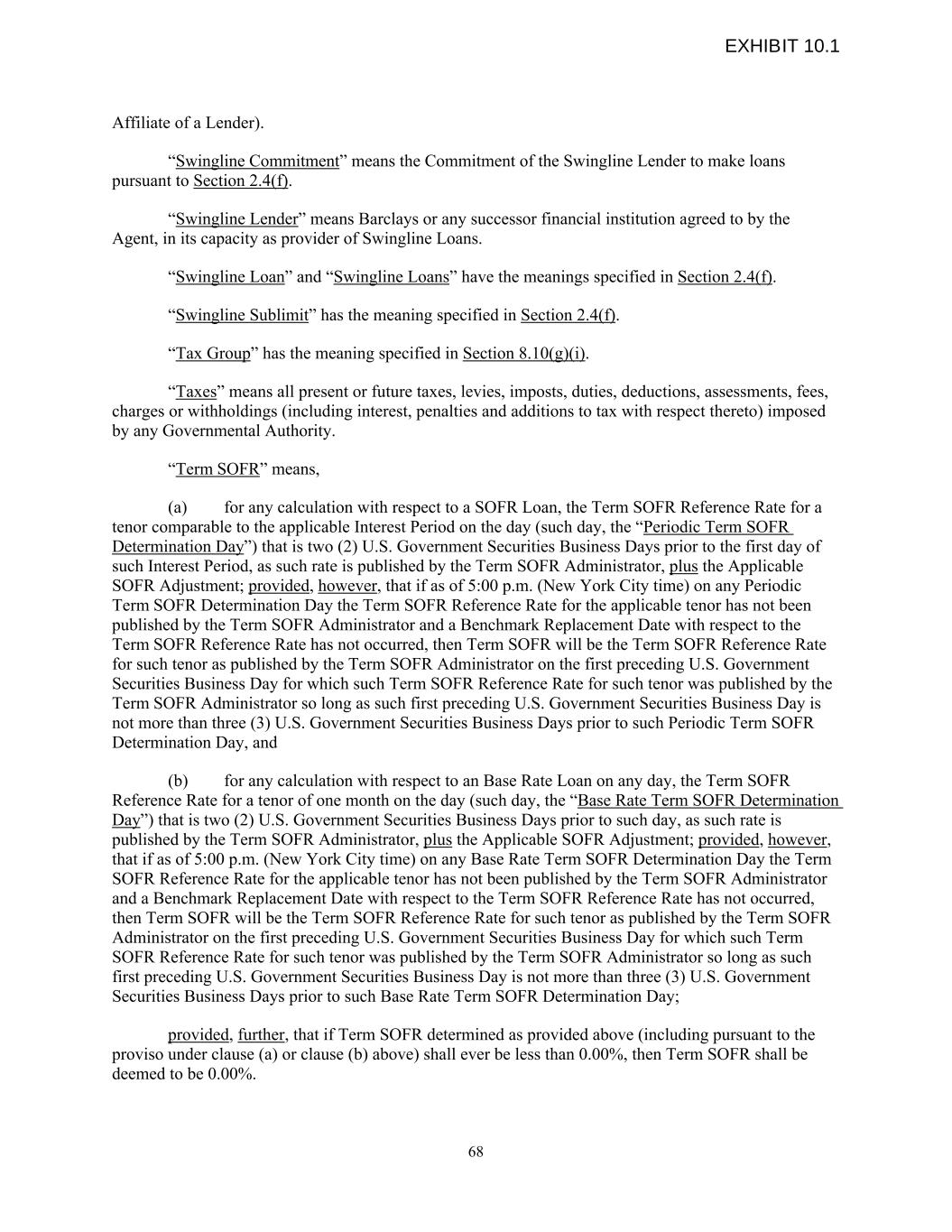 Affiliate of a Lender). “Swingline Commitment” means the Commitment of the Swingline Lender to make loans pursuant to Section 2.4(f). “Swingline Lender” means Barclays or any successor financial institution agreed to by the Agent, in its capacity as provider of Swingline Loans. “Swingline Loan” and “Swingline Loans” have the meanings specified in Section 2.4(f). “Swingline Sublimit” has the meaning specified in Section 2.4(f). “Tax Group” has the meaning specified in Section 8.10(g)(i). “Taxes” means all present or future taxes, levies, imposts, duties, deductions, assessments, fees, charges or withholdings (including interest, penalties and additions to tax with respect thereto) imposed by any Governmental Authority. “Term SOFR” means, (a) for any calculation with respect to a SOFR Loan, the Term SOFR Reference Rate for a tenor comparable to the applicable Interest Period on the day (such day, the “Periodic Term SOFR Determination Day”) that is two (2) U.S. Government Securities Business Days prior to the first day of such Interest Period, as such rate is published by the Term SOFR Administrator, plus the Applicable SOFR Adjustment; provided, however, that if as of 5:00 p.m. (New York City time) on any Periodic Term SOFR Determination Day the Term SOFR Reference Rate for the applicable tenor has not been published by the Term SOFR Administrator and a Benchmark Replacement Date with respect to the Term SOFR Reference Rate has not occurred, then Term SOFR will be the Term SOFR Reference Rate for such tenor as published by the Term SOFR Administrator on the first preceding U.S. Government Securities Business Day for which such Term SOFR Reference Rate for such tenor was published by the Term SOFR Administrator so long as such first preceding U.S. Government Securities Business Day is not more than three (3) U.S. Government Securities Business Days prior to such Periodic Term SOFR Determination Day, and (b) for any calculation with respect to an Base Rate Loan on any day, the Term SOFR Reference Rate for a tenor of one month on the day (such day, the “Base Rate Term SOFR Determination Day”) that is two (2) U.S. Government Securities Business Days prior to such day, as such rate is published by the Term SOFR Administrator, plus the Applicable SOFR Adjustment; provided, however, that if as of 5:00 p.m. (New York City time) on any Base Rate Term SOFR Determination Day the Term SOFR Reference Rate for the applicable tenor has not been published by the Term SOFR Administrator and a Benchmark Replacement Date with respect to the Term SOFR Reference Rate has not occurred, then Term SOFR will be the Term SOFR Reference Rate for such tenor as published by the Term SOFR Administrator on the first preceding U.S. Government Securities Business Day for which such Term SOFR Reference Rate for such tenor was published by the Term SOFR Administrator so long as such first preceding U.S. Government Securities Business Day is not more than three (3) U.S. Government Securities Business Days prior to such Base Rate Term SOFR Determination Day; provided, further, that if Term SOFR determined as provided above (including pursuant to the proviso under clause (a) or clause (b) above) shall ever be less than 0.00%, then Term SOFR shall be deemed to be 0.00%. 68 EXHIBIT 10.1