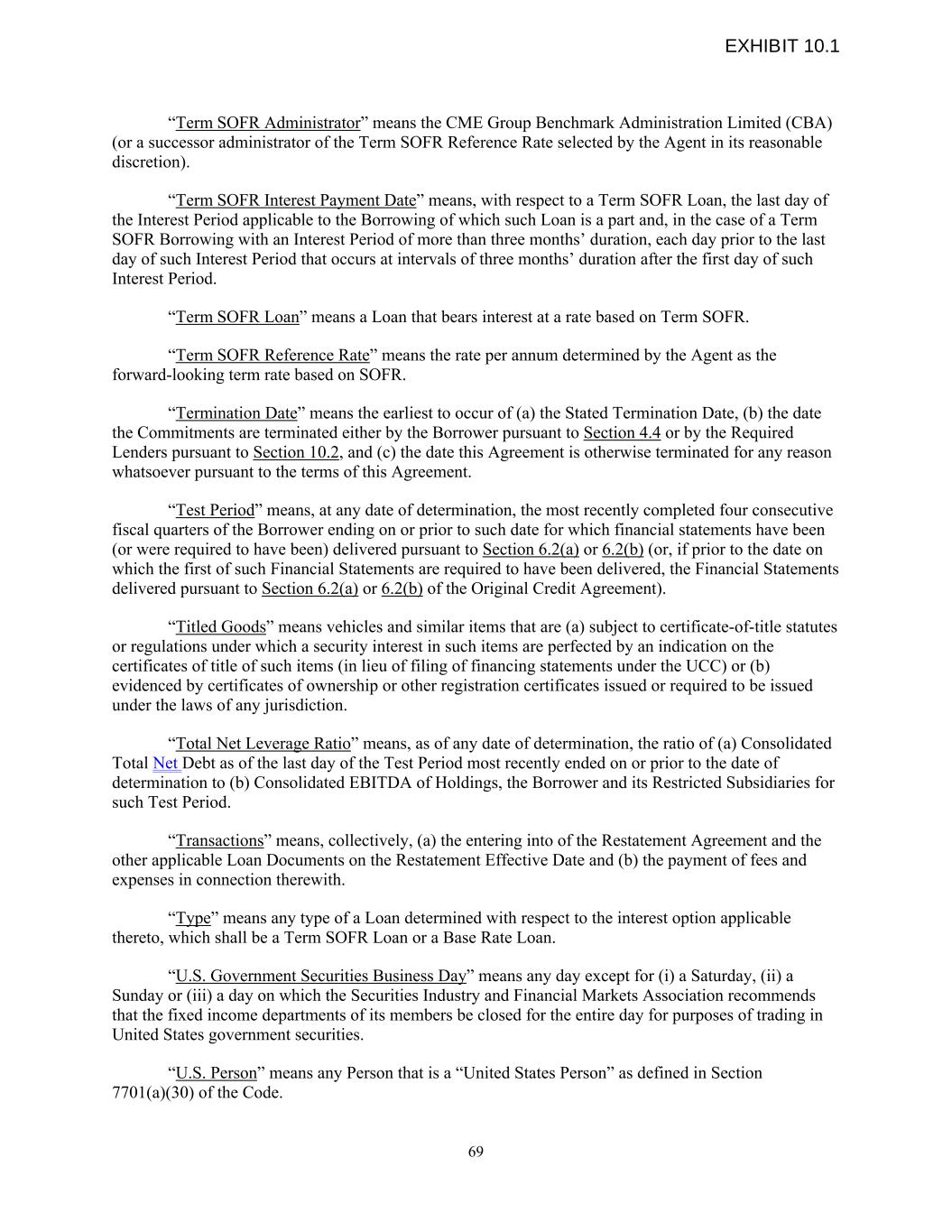 “Term SOFR Administrator” means the CME Group Benchmark Administration Limited (CBA) (or a successor administrator of the Term SOFR Reference Rate selected by the Agent in its reasonable discretion). “Term SOFR Interest Payment Date” means, with respect to a Term SOFR Loan, the last day of the Interest Period applicable to the Borrowing of which such Loan is a part and, in the case of a Term SOFR Borrowing with an Interest Period of more than three months’ duration, each day prior to the last day of such Interest Period that occurs at intervals of three months’ duration after the first day of such Interest Period. “Term SOFR Loan” means a Loan that bears interest at a rate based on Term SOFR. “Term SOFR Reference Rate” means the rate per annum determined by the Agent as the forward-looking term rate based on SOFR. “Termination Date” means the earliest to occur of (a) the Stated Termination Date, (b) the date the Commitments are terminated either by the Borrower pursuant to Section 4.4 or by the Required Lenders pursuant to Section 10.2, and (c) the date this Agreement is otherwise terminated for any reason whatsoever pursuant to the terms of this Agreement. “Test Period” means, at any date of determination, the most recently completed four consecutive fiscal quarters of the Borrower ending on or prior to such date for which financial statements have been (or were required to have been) delivered pursuant to Section 6.2(a) or 6.2(b) (or, if prior to the date on which the first of such Financial Statements are required to have been delivered, the Financial Statements delivered pursuant to Section 6.2(a) or 6.2(b) of the Original Credit Agreement). “Titled Goods” means vehicles and similar items that are (a) subject to certificate-of-title statutes or regulations under which a security interest in such items are perfected by an indication on the certificates of title of such items (in lieu of filing of financing statements under the UCC) or (b) evidenced by certificates of ownership or other registration certificates issued or required to be issued under the laws of any jurisdiction. “Total Net Leverage Ratio” means, as of any date of determination, the ratio of (a) Consolidated Total Net Debt as of the last day of the Test Period most recently ended on or prior to the date of determination to (b) Consolidated EBITDA of Holdings, the Borrower and its Restricted Subsidiaries for such Test Period. “Transactions” means, collectively, (a) the entering into of the Restatement Agreement and the other applicable Loan Documents on the Restatement Effective Date and (b) the payment of fees and expenses in connection therewith. “Type” means any type of a Loan determined with respect to the interest option applicable thereto, which shall be a Term SOFR Loan or a Base Rate Loan. “U.S. Government Securities Business Day” means any day except for (i) a Saturday, (ii) a Sunday or (iii) a day on which the Securities Industry and Financial Markets Association recommends that the fixed income departments of its members be closed for the entire day for purposes of trading in United States government securities. “U.S. Person” means any Person that is a “United States Person” as defined in Section 7701(a)(30) of the Code. 69 EXHIBIT 10.1