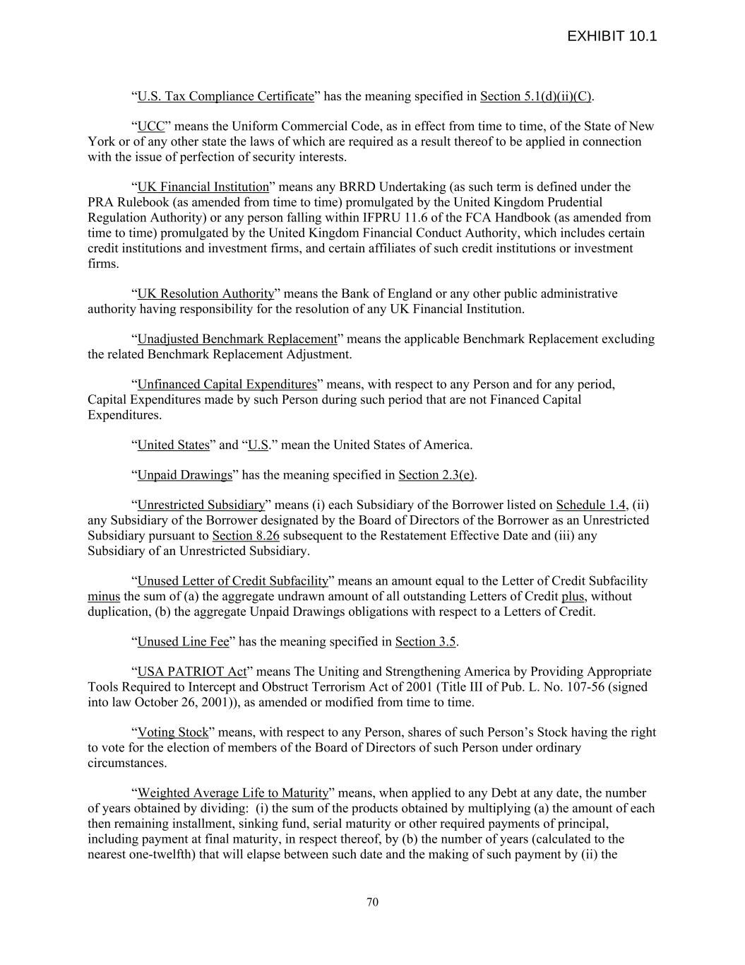 “U.S. Tax Compliance Certificate” has the meaning specified in Section 5.1(d)(ii)(C). “UCC” means the Uniform Commercial Code, as in effect from time to time, of the State of New York or of any other state the laws of which are required as a result thereof to be applied in connection with the issue of perfection of security interests. “UK Financial Institution” means any BRRD Undertaking (as such term is defined under the PRA Rulebook (as amended from time to time) promulgated by the United Kingdom Prudential Regulation Authority) or any person falling within IFPRU 11.6 of the FCA Handbook (as amended from time to time) promulgated by the United Kingdom Financial Conduct Authority, which includes certain credit institutions and investment firms, and certain affiliates of such credit institutions or investment firms. “UK Resolution Authority” means the Bank of England or any other public administrative authority having responsibility for the resolution of any UK Financial Institution. “Unadjusted Benchmark Replacement” means the applicable Benchmark Replacement excluding the related Benchmark Replacement Adjustment. “Unfinanced Capital Expenditures” means, with respect to any Person and for any period, Capital Expenditures made by such Person during such period that are not Financed Capital Expenditures. “United States” and “U.S.” mean the United States of America. “Unpaid Drawings” has the meaning specified in Section 2.3(e). “Unrestricted Subsidiary” means (i) each Subsidiary of the Borrower listed on Schedule 1.4, (ii) any Subsidiary of the Borrower designated by the Board of Directors of the Borrower as an Unrestricted Subsidiary pursuant to Section 8.26 subsequent to the Restatement Effective Date and (iii) any Subsidiary of an Unrestricted Subsidiary. “Unused Letter of Credit Subfacility” means an amount equal to the Letter of Credit Subfacility minus the sum of (a) the aggregate undrawn amount of all outstanding Letters of Credit plus, without duplication, (b) the aggregate Unpaid Drawings obligations with respect to a Letters of Credit. “Unused Line Fee” has the meaning specified in Section 3.5. “USA PATRIOT Act” means The Uniting and Strengthening America by Providing Appropriate Tools Required to Intercept and Obstruct Terrorism Act of 2001 (Title III of Pub. L. No. 107-56 (signed into law October 26, 2001)), as amended or modified from time to time. “Voting Stock” means, with respect to any Person, shares of such Person’s Stock having the right to vote for the election of members of the Board of Directors of such Person under ordinary circumstances. “Weighted Average Life to Maturity” means, when applied to any Debt at any date, the number of years obtained by dividing: (i) the sum of the products obtained by multiplying (a) the amount of each then remaining installment, sinking fund, serial maturity or other required payments of principal, including payment at final maturity, in respect thereof, by (b) the number of years (calculated to the nearest one-twelfth) that will elapse between such date and the making of such payment by (ii) the 70 EXHIBIT 10.1