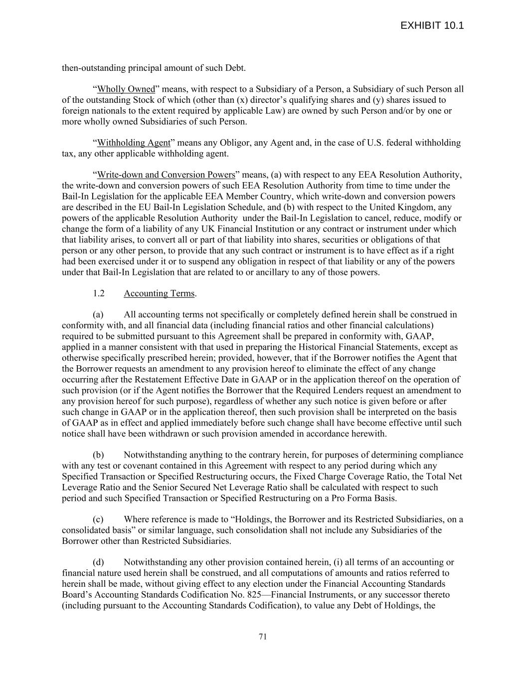 then-outstanding principal amount of such Debt. “Wholly Owned” means, with respect to a Subsidiary of a Person, a Subsidiary of such Person all of the outstanding Stock of which (other than (x) director’s qualifying shares and (y) shares issued to foreign nationals to the extent required by applicable Law) are owned by such Person and/or by one or more wholly owned Subsidiaries of such Person. “Withholding Agent” means any Obligor, any Agent and, in the case of U.S. federal withholding tax, any other applicable withholding agent. “Write-down and Conversion Powers” means, (a) with respect to any EEA Resolution Authority, the write-down and conversion powers of such EEA Resolution Authority from time to time under the Bail-In Legislation for the applicable EEA Member Country, which write-down and conversion powers are described in the EU Bail-In Legislation Schedule, and (b) with respect to the United Kingdom, any powers of the applicable Resolution Authority under the Bail-In Legislation to cancel, reduce, modify or change the form of a liability of any UK Financial Institution or any contract or instrument under which that liability arises, to convert all or part of that liability into shares, securities or obligations of that person or any other person, to provide that any such contract or instrument is to have effect as if a right had been exercised under it or to suspend any obligation in respect of that liability or any of the powers under that Bail-In Legislation that are related to or ancillary to any of those powers. 1.2 Accounting Terms. (a) All accounting terms not specifically or completely defined herein shall be construed in conformity with, and all financial data (including financial ratios and other financial calculations) required to be submitted pursuant to this Agreement shall be prepared in conformity with, GAAP, applied in a manner consistent with that used in preparing the Historical Financial Statements, except as otherwise specifically prescribed herein; provided, however, that if the Borrower notifies the Agent that the Borrower requests an amendment to any provision hereof to eliminate the effect of any change occurring after the Restatement Effective Date in GAAP or in the application thereof on the operation of such provision (or if the Agent notifies the Borrower that the Required Lenders request an amendment to any provision hereof for such purpose), regardless of whether any such notice is given before or after such change in GAAP or in the application thereof, then such provision shall be interpreted on the basis of GAAP as in effect and applied immediately before such change shall have become effective until such notice shall have been withdrawn or such provision amended in accordance herewith. (b) Notwithstanding anything to the contrary herein, for purposes of determining compliance with any test or covenant contained in this Agreement with respect to any period during which any Specified Transaction or Specified Restructuring occurs, the Fixed Charge Coverage Ratio, the Total Net Leverage Ratio and the Senior Secured Net Leverage Ratio shall be calculated with respect to such period and such Specified Transaction or Specified Restructuring on a Pro Forma Basis. (c) Where reference is made to “Holdings, the Borrower and its Restricted Subsidiaries, on a consolidated basis” or similar language, such consolidation shall not include any Subsidiaries of the Borrower other than Restricted Subsidiaries. (d) Notwithstanding any other provision contained herein, (i) all terms of an accounting or financial nature used herein shall be construed, and all computations of amounts and ratios referred to herein shall be made, without giving effect to any election under the Financial Accounting Standards Board’s Accounting Standards Codification No. 825—Financial Instruments, or any successor thereto (including pursuant to the Accounting Standards Codification), to value any Debt of Holdings, the 71 EXHIBIT 10.1