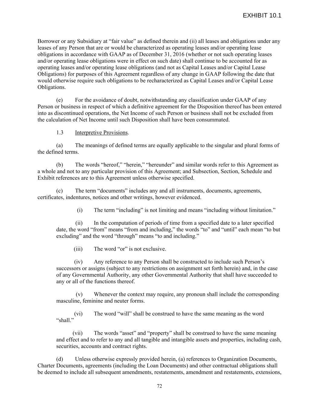 Borrower or any Subsidiary at “fair value” as defined therein and (ii) all leases and obligations under any leases of any Person that are or would be characterized as operating leases and/or operating lease obligations in accordance with GAAP as of December 31, 2016 (whether or not such operating leases and/or operating lease obligations were in effect on such date) shall continue to be accounted for as operating leases and/or operating lease obligations (and not as Capital Leases and/or Capital Lease Obligations) for purposes of this Agreement regardless of any change in GAAP following the date that would otherwise require such obligations to be recharacterized as Capital Leases and/or Capital Lease Obligations. (e) For the avoidance of doubt, notwithstanding any classification under GAAP of any Person or business in respect of which a definitive agreement for the Disposition thereof has been entered into as discontinued operations, the Net Income of such Person or business shall not be excluded from the calculation of Net Income until such Disposition shall have been consummated. 1.3 Interpretive Provisions. (a) The meanings of defined terms are equally applicable to the singular and plural forms of the defined terms. (b) The words “hereof,” “herein,” “hereunder” and similar words refer to this Agreement as a whole and not to any particular provision of this Agreement; and Subsection, Section, Schedule and Exhibit references are to this Agreement unless otherwise specified. (c) The term “documents” includes any and all instruments, documents, agreements, certificates, indentures, notices and other writings, however evidenced. (i) The term “including” is not limiting and means “including without limitation.” (ii) In the computation of periods of time from a specified date to a later specified date, the word “from” means “from and including,” the words “to” and “until” each mean “to but excluding” and the word “through” means “to and including.” (iii) The word “or” is not exclusive. (iv) Any reference to any Person shall be constructed to include such Person’s successors or assigns (subject to any restrictions on assignment set forth herein) and, in the case of any Governmental Authority, any other Governmental Authority that shall have succeeded to any or all of the functions thereof. (v) Whenever the context may require, any pronoun shall include the corresponding masculine, feminine and neuter forms. (vi) The word “will” shall be construed to have the same meaning as the word “shall.” (vii) The words “asset” and “property” shall be construed to have the same meaning and effect and to refer to any and all tangible and intangible assets and properties, including cash, securities, accounts and contract rights. (d) Unless otherwise expressly provided herein, (a) references to Organization Documents, Charter Documents, agreements (including the Loan Documents) and other contractual obligations shall be deemed to include all subsequent amendments, restatements, amendment and restatements, extensions, 72 EXHIBIT 10.1