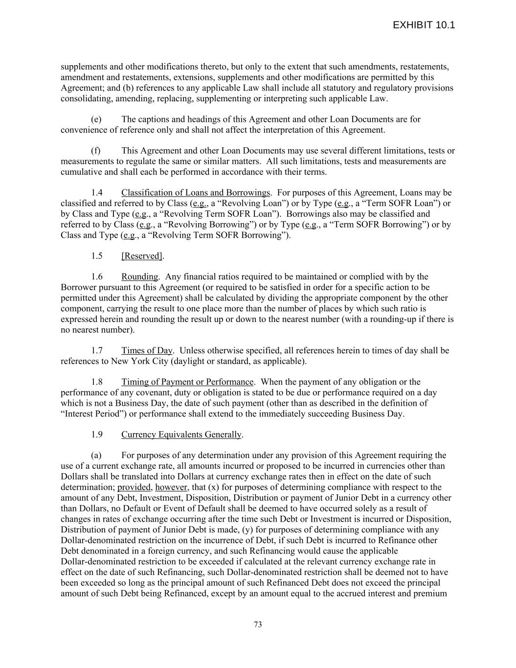 supplements and other modifications thereto, but only to the extent that such amendments, restatements, amendment and restatements, extensions, supplements and other modifications are permitted by this Agreement; and (b) references to any applicable Law shall include all statutory and regulatory provisions consolidating, amending, replacing, supplementing or interpreting such applicable Law. (e) The captions and headings of this Agreement and other Loan Documents are for convenience of reference only and shall not affect the interpretation of this Agreement. (f) This Agreement and other Loan Documents may use several different limitations, tests or measurements to regulate the same or similar matters. All such limitations, tests and measurements are cumulative and shall each be performed in accordance with their terms. 1.4 Classification of Loans and Borrowings. For purposes of this Agreement, Loans may be classified and referred to by Class (e.g., a “Revolving Loan”) or by Type (e.g., a “Term SOFR Loan”) or by Class and Type (e.g., a “Revolving Term SOFR Loan”). Borrowings also may be classified and referred to by Class (e.g., a “Revolving Borrowing”) or by Type (e.g., a “Term SOFR Borrowing”) or by Class and Type (e.g., a “Revolving Term SOFR Borrowing”). 1.5 [Reserved]. 1.6 Rounding. Any financial ratios required to be maintained or complied with by the Borrower pursuant to this Agreement (or required to be satisfied in order for a specific action to be permitted under this Agreement) shall be calculated by dividing the appropriate component by the other component, carrying the result to one place more than the number of places by which such ratio is expressed herein and rounding the result up or down to the nearest number (with a rounding-up if there is no nearest number). 1.7 Times of Day. Unless otherwise specified, all references herein to times of day shall be references to New York City (daylight or standard, as applicable). 1.8 Timing of Payment or Performance. When the payment of any obligation or the performance of any covenant, duty or obligation is stated to be due or performance required on a day which is not a Business Day, the date of such payment (other than as described in the definition of “Interest Period”) or performance shall extend to the immediately succeeding Business Day. 1.9 Currency Equivalents Generally. (a) For purposes of any determination under any provision of this Agreement requiring the use of a current exchange rate, all amounts incurred or proposed to be incurred in currencies other than Dollars shall be translated into Dollars at currency exchange rates then in effect on the date of such determination; provided, however, that (x) for purposes of determining compliance with respect to the amount of any Debt, Investment, Disposition, Distribution or payment of Junior Debt in a currency other than Dollars, no Default or Event of Default shall be deemed to have occurred solely as a result of changes in rates of exchange occurring after the time such Debt or Investment is incurred or Disposition, Distribution of payment of Junior Debt is made, (y) for purposes of determining compliance with any Dollar-denominated restriction on the incurrence of Debt, if such Debt is incurred to Refinance other Debt denominated in a foreign currency, and such Refinancing would cause the applicable Dollar-denominated restriction to be exceeded if calculated at the relevant currency exchange rate in effect on the date of such Refinancing, such Dollar-denominated restriction shall be deemed not to have been exceeded so long as the principal amount of such Refinanced Debt does not exceed the principal amount of such Debt being Refinanced, except by an amount equal to the accrued interest and premium 73 EXHIBIT 10.1