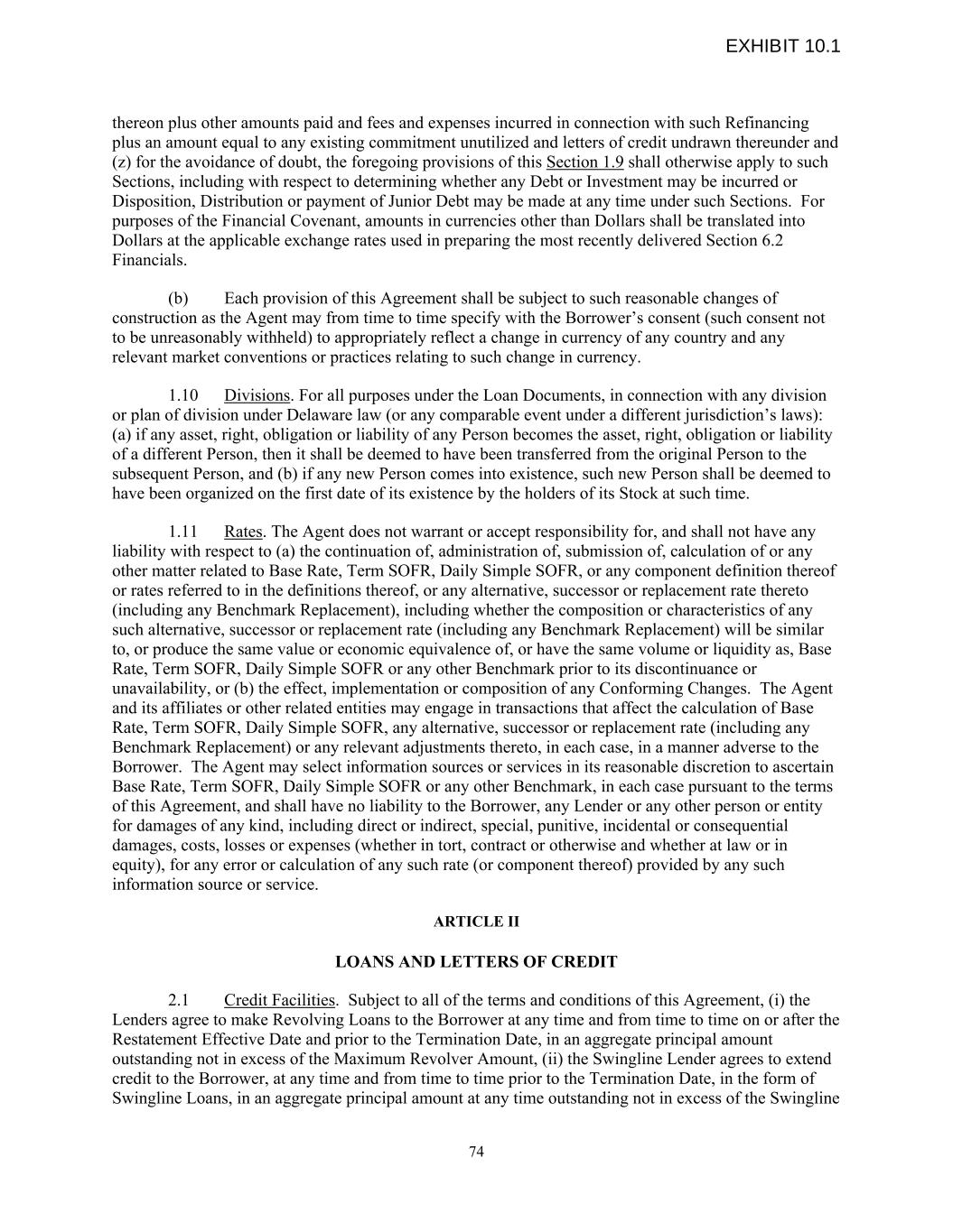 thereon plus other amounts paid and fees and expenses incurred in connection with such Refinancing plus an amount equal to any existing commitment unutilized and letters of credit undrawn thereunder and (z) for the avoidance of doubt, the foregoing provisions of this Section 1.9 shall otherwise apply to such Sections, including with respect to determining whether any Debt or Investment may be incurred or Disposition, Distribution or payment of Junior Debt may be made at any time under such Sections. For purposes of the Financial Covenant, amounts in currencies other than Dollars shall be translated into Dollars at the applicable exchange rates used in preparing the most recently delivered Section 6.2 Financials. (b) Each provision of this Agreement shall be subject to such reasonable changes of construction as the Agent may from time to time specify with the Borrower’s consent (such consent not to be unreasonably withheld) to appropriately reflect a change in currency of any country and any relevant market conventions or practices relating to such change in currency. 1.10 Divisions. For all purposes under the Loan Documents, in connection with any division or plan of division under Delaware law (or any comparable event under a different jurisdiction’s laws): (a) if any asset, right, obligation or liability of any Person becomes the asset, right, obligation or liability of a different Person, then it shall be deemed to have been transferred from the original Person to the subsequent Person, and (b) if any new Person comes into existence, such new Person shall be deemed to have been organized on the first date of its existence by the holders of its Stock at such time. 1.11 Rates. The Agent does not warrant or accept responsibility for, and shall not have any liability with respect to (a) the continuation of, administration of, submission of, calculation of or any other matter related to Base Rate, Term SOFR, Daily Simple SOFR, or any component definition thereof or rates referred to in the definitions thereof, or any alternative, successor or replacement rate thereto (including any Benchmark Replacement), including whether the composition or characteristics of any such alternative, successor or replacement rate (including any Benchmark Replacement) will be similar to, or produce the same value or economic equivalence of, or have the same volume or liquidity as, Base Rate, Term SOFR, Daily Simple SOFR or any other Benchmark prior to its discontinuance or unavailability, or (b) the effect, implementation or composition of any Conforming Changes. The Agent and its affiliates or other related entities may engage in transactions that affect the calculation of Base Rate, Term SOFR, Daily Simple SOFR, any alternative, successor or replacement rate (including any Benchmark Replacement) or any relevant adjustments thereto, in each case, in a manner adverse to the Borrower. The Agent may select information sources or services in its reasonable discretion to ascertain Base Rate, Term SOFR, Daily Simple SOFR or any other Benchmark, in each case pursuant to the terms of this Agreement, and shall have no liability to the Borrower, any Lender or any other person or entity for damages of any kind, including direct or indirect, special, punitive, incidental or consequential damages, costs, losses or expenses (whether in tort, contract or otherwise and whether at law or in equity), for any error or calculation of any such rate (or component thereof) provided by any such information source or service. ARTICLE II LOANS AND LETTERS OF CREDIT 2.1 Credit Facilities. Subject to all of the terms and conditions of this Agreement, (i) the Lenders agree to make Revolving Loans to the Borrower at any time and from time to time on or after the Restatement Effective Date and prior to the Termination Date, in an aggregate principal amount outstanding not in excess of the Maximum Revolver Amount, (ii) the Swingline Lender agrees to extend credit to the Borrower, at any time and from time to time prior to the Termination Date, in the form of Swingline Loans, in an aggregate principal amount at any time outstanding not in excess of the Swingline 74 EXHIBIT 10.1