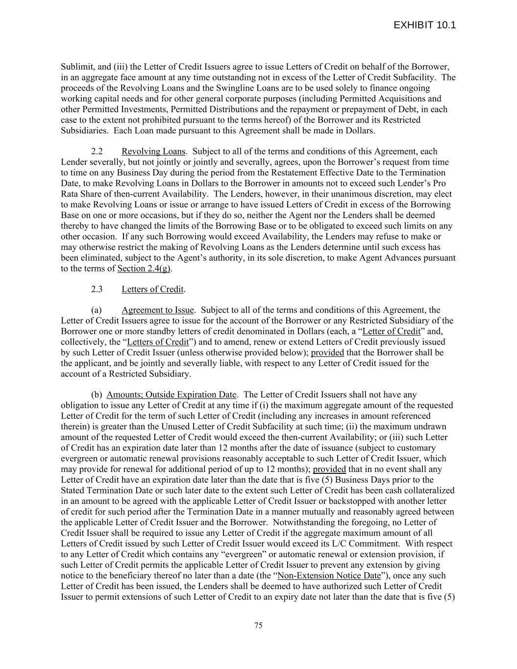 Sublimit, and (iii) the Letter of Credit Issuers agree to issue Letters of Credit on behalf of the Borrower, in an aggregate face amount at any time outstanding not in excess of the Letter of Credit Subfacility. The proceeds of the Revolving Loans and the Swingline Loans are to be used solely to finance ongoing working capital needs and for other general corporate purposes (including Permitted Acquisitions and other Permitted Investments, Permitted Distributions and the repayment or prepayment of Debt, in each case to the extent not prohibited pursuant to the terms hereof) of the Borrower and its Restricted Subsidiaries. Each Loan made pursuant to this Agreement shall be made in Dollars. 2.2 Revolving Loans. Subject to all of the terms and conditions of this Agreement, each Lender severally, but not jointly or jointly and severally, agrees, upon the Borrower’s request from time to time on any Business Day during the period from the Restatement Effective Date to the Termination Date, to make Revolving Loans in Dollars to the Borrower in amounts not to exceed such Lender’s Pro Rata Share of then-current Availability. The Lenders, however, in their unanimous discretion, may elect to make Revolving Loans or issue or arrange to have issued Letters of Credit in excess of the Borrowing Base on one or more occasions, but if they do so, neither the Agent nor the Lenders shall be deemed thereby to have changed the limits of the Borrowing Base or to be obligated to exceed such limits on any other occasion. If any such Borrowing would exceed Availability, the Lenders may refuse to make or may otherwise restrict the making of Revolving Loans as the Lenders determine until such excess has been eliminated, subject to the Agent’s authority, in its sole discretion, to make Agent Advances pursuant to the terms of Section 2.4(g). 2.3 Letters of Credit. (a) Agreement to Issue. Subject to all of the terms and conditions of this Agreement, the Letter of Credit Issuers agree to issue for the account of the Borrower or any Restricted Subsidiary of the Borrower one or more standby letters of credit denominated in Dollars (each, a “Letter of Credit” and, collectively, the “Letters of Credit”) and to amend, renew or extend Letters of Credit previously issued by such Letter of Credit Issuer (unless otherwise provided below); provided that the Borrower shall be the applicant, and be jointly and severally liable, with respect to any Letter of Credit issued for the account of a Restricted Subsidiary. (b) Amounts; Outside Expiration Date. The Letter of Credit Issuers shall not have any obligation to issue any Letter of Credit at any time if (i) the maximum aggregate amount of the requested Letter of Credit for the term of such Letter of Credit (including any increases in amount referenced therein) is greater than the Unused Letter of Credit Subfacility at such time; (ii) the maximum undrawn amount of the requested Letter of Credit would exceed the then-current Availability; or (iii) such Letter of Credit has an expiration date later than 12 months after the date of issuance (subject to customary evergreen or automatic renewal provisions reasonably acceptable to such Letter of Credit Issuer, which may provide for renewal for additional period of up to 12 months); provided that in no event shall any Letter of Credit have an expiration date later than the date that is five (5) Business Days prior to the Stated Termination Date or such later date to the extent such Letter of Credit has been cash collateralized in an amount to be agreed with the applicable Letter of Credit Issuer or backstopped with another letter of credit for such period after the Termination Date in a manner mutually and reasonably agreed between the applicable Letter of Credit Issuer and the Borrower. Notwithstanding the foregoing, no Letter of Credit Issuer shall be required to issue any Letter of Credit if the aggregate maximum amount of all Letters of Credit issued by such Letter of Credit Issuer would exceed its L/C Commitment. With respect to any Letter of Credit which contains any “evergreen” or automatic renewal or extension provision, if such Letter of Credit permits the applicable Letter of Credit Issuer to prevent any extension by giving notice to the beneficiary thereof no later than a date (the “Non-Extension Notice Date”), once any such Letter of Credit has been issued, the Lenders shall be deemed to have authorized such Letter of Credit Issuer to permit extensions of such Letter of Credit to an expiry date not later than the date that is five (5) 75 EXHIBIT 10.1