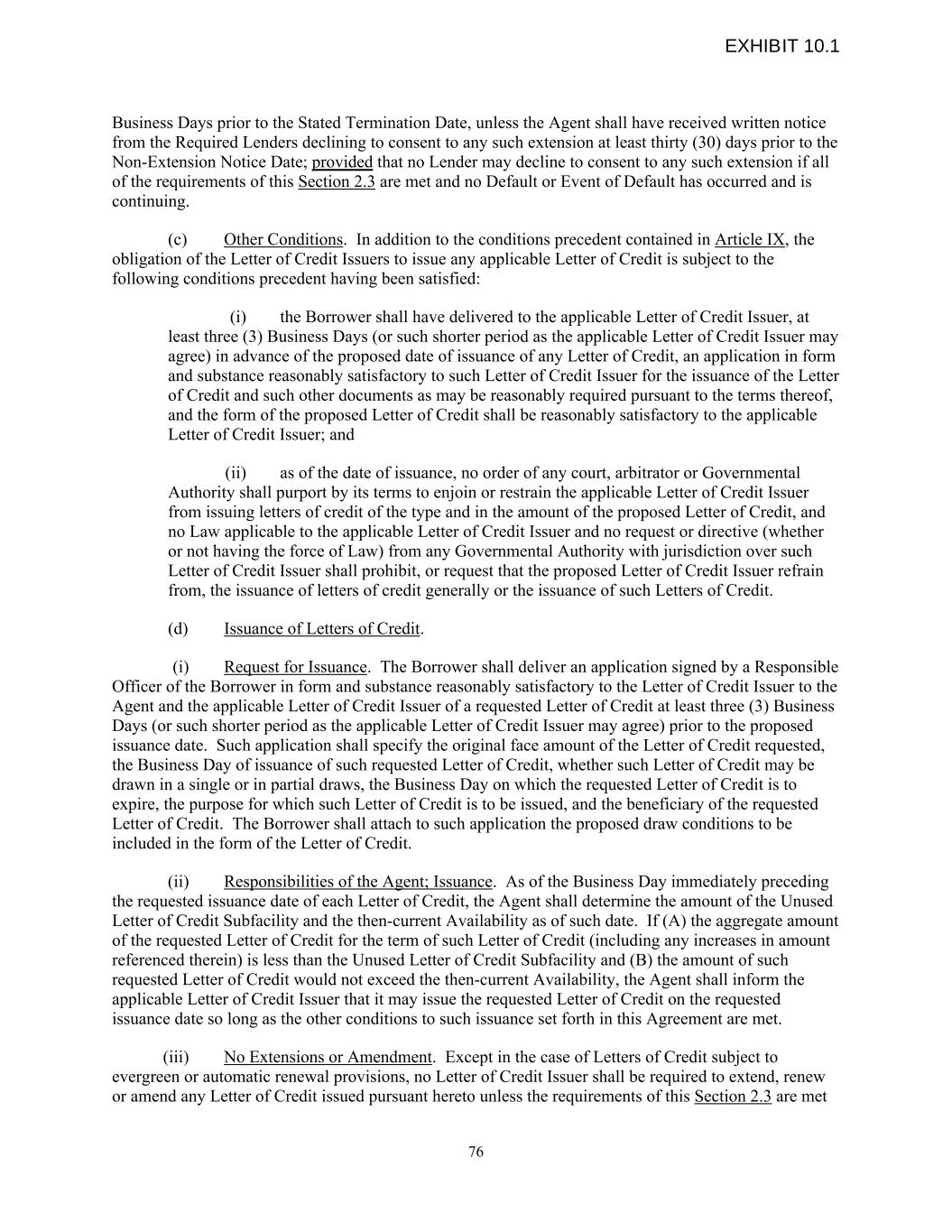 Business Days prior to the Stated Termination Date, unless the Agent shall have received written notice from the Required Lenders declining to consent to any such extension at least thirty (30) days prior to the Non-Extension Notice Date; provided that no Lender may decline to consent to any such extension if all of the requirements of this Section 2.3 are met and no Default or Event of Default has occurred and is continuing. (c) Other Conditions. In addition to the conditions precedent contained in Article IX, the obligation of the Letter of Credit Issuers to issue any applicable Letter of Credit is subject to the following conditions precedent having been satisfied: (i) the Borrower shall have delivered to the applicable Letter of Credit Issuer, at least three (3) Business Days (or such shorter period as the applicable Letter of Credit Issuer may agree) in advance of the proposed date of issuance of any Letter of Credit, an application in form and substance reasonably satisfactory to such Letter of Credit Issuer for the issuance of the Letter of Credit and such other documents as may be reasonably required pursuant to the terms thereof, and the form of the proposed Letter of Credit shall be reasonably satisfactory to the applicable Letter of Credit Issuer; and (ii) as of the date of issuance, no order of any court, arbitrator or Governmental Authority shall purport by its terms to enjoin or restrain the applicable Letter of Credit Issuer from issuing letters of credit of the type and in the amount of the proposed Letter of Credit, and no Law applicable to the applicable Letter of Credit Issuer and no request or directive (whether or not having the force of Law) from any Governmental Authority with jurisdiction over such Letter of Credit Issuer shall prohibit, or request that the proposed Letter of Credit Issuer refrain from, the issuance of letters of credit generally or the issuance of such Letters of Credit. (d) Issuance of Letters of Credit. (i) Request for Issuance. The Borrower shall deliver an application signed by a Responsible Officer of the Borrower in form and substance reasonably satisfactory to the Letter of Credit Issuer to the Agent and the applicable Letter of Credit Issuer of a requested Letter of Credit at least three (3) Business Days (or such shorter period as the applicable Letter of Credit Issuer may agree) prior to the proposed issuance date. Such application shall specify the original face amount of the Letter of Credit requested, the Business Day of issuance of such requested Letter of Credit, whether such Letter of Credit may be drawn in a single or in partial draws, the Business Day on which the requested Letter of Credit is to expire, the purpose for which such Letter of Credit is to be issued, and the beneficiary of the requested Letter of Credit. The Borrower shall attach to such application the proposed draw conditions to be included in the form of the Letter of Credit. (ii) Responsibilities of the Agent; Issuance. As of the Business Day immediately preceding the requested issuance date of each Letter of Credit, the Agent shall determine the amount of the Unused Letter of Credit Subfacility and the then-current Availability as of such date. If (A) the aggregate amount of the requested Letter of Credit for the term of such Letter of Credit (including any increases in amount referenced therein) is less than the Unused Letter of Credit Subfacility and (B) the amount of such requested Letter of Credit would not exceed the then-current Availability, the Agent shall inform the applicable Letter of Credit Issuer that it may issue the requested Letter of Credit on the requested issuance date so long as the other conditions to such issuance set forth in this Agreement are met. (iii) No Extensions or Amendment. Except in the case of Letters of Credit subject to evergreen or automatic renewal provisions, no Letter of Credit Issuer shall be required to extend, renew or amend any Letter of Credit issued pursuant hereto unless the requirements of this Section 2.3 are met 76 EXHIBIT 10.1