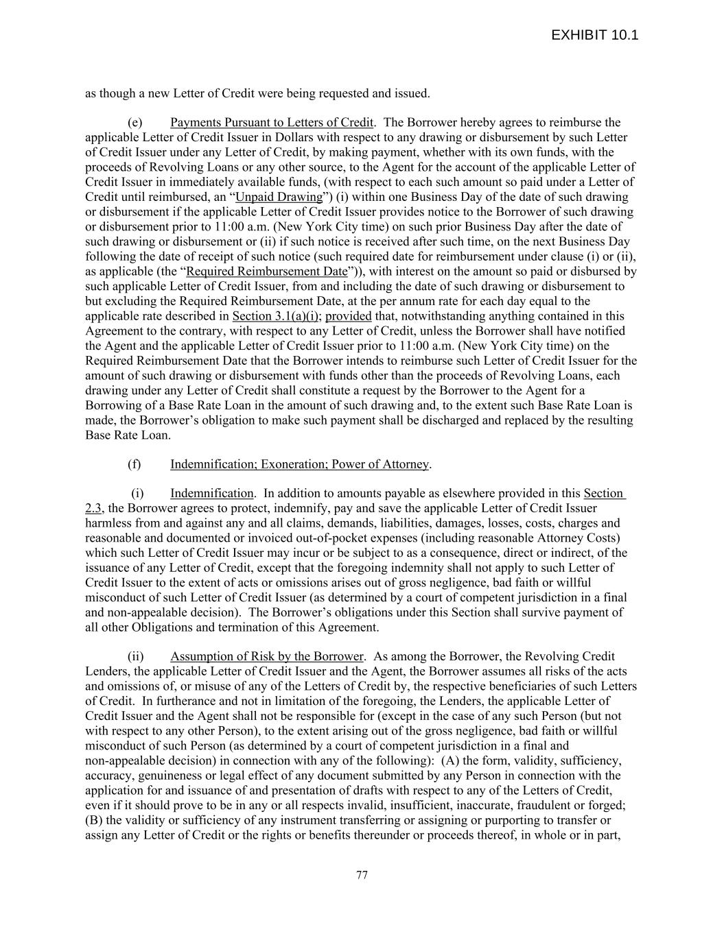 as though a new Letter of Credit were being requested and issued. (e) Payments Pursuant to Letters of Credit. The Borrower hereby agrees to reimburse the applicable Letter of Credit Issuer in Dollars with respect to any drawing or disbursement by such Letter of Credit Issuer under any Letter of Credit, by making payment, whether with its own funds, with the proceeds of Revolving Loans or any other source, to the Agent for the account of the applicable Letter of Credit Issuer in immediately available funds, (with respect to each such amount so paid under a Letter of Credit until reimbursed, an “Unpaid Drawing”) (i) within one Business Day of the date of such drawing or disbursement if the applicable Letter of Credit Issuer provides notice to the Borrower of such drawing or disbursement prior to 11:00 a.m. (New York City time) on such prior Business Day after the date of such drawing or disbursement or (ii) if such notice is received after such time, on the next Business Day following the date of receipt of such notice (such required date for reimbursement under clause (i) or (ii), as applicable (the “Required Reimbursement Date”)), with interest on the amount so paid or disbursed by such applicable Letter of Credit Issuer, from and including the date of such drawing or disbursement to but excluding the Required Reimbursement Date, at the per annum rate for each day equal to the applicable rate described in Section 3.1(a)(i); provided that, notwithstanding anything contained in this Agreement to the contrary, with respect to any Letter of Credit, unless the Borrower shall have notified the Agent and the applicable Letter of Credit Issuer prior to 11:00 a.m. (New York City time) on the Required Reimbursement Date that the Borrower intends to reimburse such Letter of Credit Issuer for the amount of such drawing or disbursement with funds other than the proceeds of Revolving Loans, each drawing under any Letter of Credit shall constitute a request by the Borrower to the Agent for a Borrowing of a Base Rate Loan in the amount of such drawing and, to the extent such Base Rate Loan is made, the Borrower’s obligation to make such payment shall be discharged and replaced by the resulting Base Rate Loan. (f) Indemnification; Exoneration; Power of Attorney. (i) Indemnification. In addition to amounts payable as elsewhere provided in this Section 2.3, the Borrower agrees to protect, indemnify, pay and save the applicable Letter of Credit Issuer harmless from and against any and all claims, demands, liabilities, damages, losses, costs, charges and reasonable and documented or invoiced out-of-pocket expenses (including reasonable Attorney Costs) which such Letter of Credit Issuer may incur or be subject to as a consequence, direct or indirect, of the issuance of any Letter of Credit, except that the foregoing indemnity shall not apply to such Letter of Credit Issuer to the extent of acts or omissions arises out of gross negligence, bad faith or willful misconduct of such Letter of Credit Issuer (as determined by a court of competent jurisdiction in a final and non-appealable decision). The Borrower’s obligations under this Section shall survive payment of all other Obligations and termination of this Agreement. (ii) Assumption of Risk by the Borrower. As among the Borrower, the Revolving Credit Lenders, the applicable Letter of Credit Issuer and the Agent, the Borrower assumes all risks of the acts and omissions of, or misuse of any of the Letters of Credit by, the respective beneficiaries of such Letters of Credit. In furtherance and not in limitation of the foregoing, the Lenders, the applicable Letter of Credit Issuer and the Agent shall not be responsible for (except in the case of any such Person (but not with respect to any other Person), to the extent arising out of the gross negligence, bad faith or willful misconduct of such Person (as determined by a court of competent jurisdiction in a final and non-appealable decision) in connection with any of the following): (A) the form, validity, sufficiency, accuracy, genuineness or legal effect of any document submitted by any Person in connection with the application for and issuance of and presentation of drafts with respect to any of the Letters of Credit, even if it should prove to be in any or all respects invalid, insufficient, inaccurate, fraudulent or forged; (B) the validity or sufficiency of any instrument transferring or assigning or purporting to transfer or assign any Letter of Credit or the rights or benefits thereunder or proceeds thereof, in whole or in part, 77 EXHIBIT 10.1