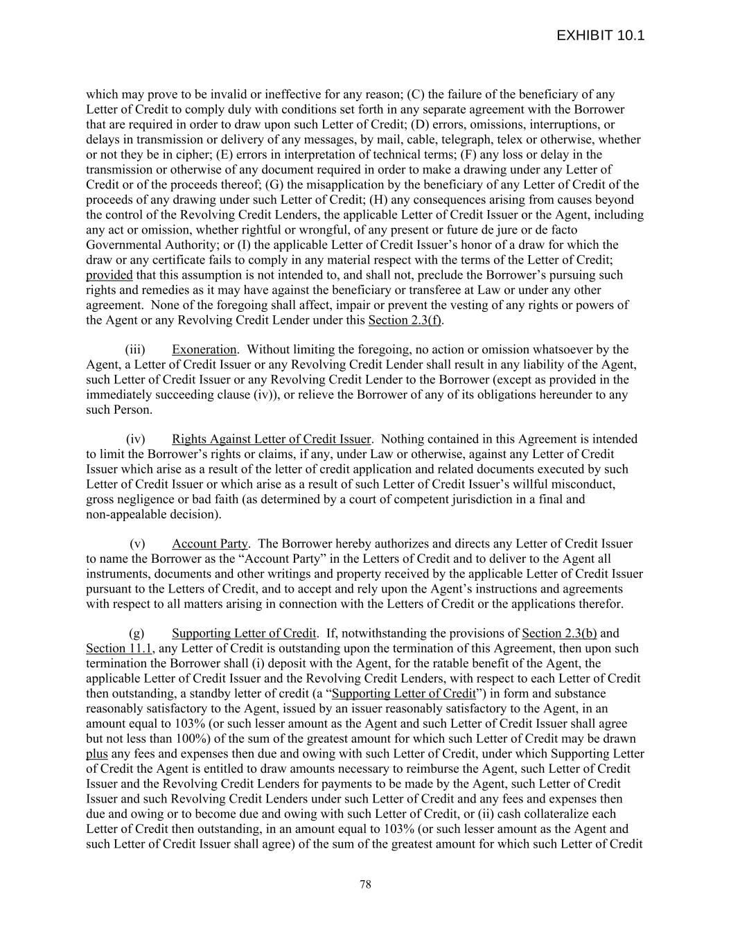 which may prove to be invalid or ineffective for any reason; (C) the failure of the beneficiary of any Letter of Credit to comply duly with conditions set forth in any separate agreement with the Borrower that are required in order to draw upon such Letter of Credit; (D) errors, omissions, interruptions, or delays in transmission or delivery of any messages, by mail, cable, telegraph, telex or otherwise, whether or not they be in cipher; (E) errors in interpretation of technical terms; (F) any loss or delay in the transmission or otherwise of any document required in order to make a drawing under any Letter of Credit or of the proceeds thereof; (G) the misapplication by the beneficiary of any Letter of Credit of the proceeds of any drawing under such Letter of Credit; (H) any consequences arising from causes beyond the control of the Revolving Credit Lenders, the applicable Letter of Credit Issuer or the Agent, including any act or omission, whether rightful or wrongful, of any present or future de jure or de facto Governmental Authority; or (I) the applicable Letter of Credit Issuer’s honor of a draw for which the draw or any certificate fails to comply in any material respect with the terms of the Letter of Credit; provided that this assumption is not intended to, and shall not, preclude the Borrower’s pursuing such rights and remedies as it may have against the beneficiary or transferee at Law or under any other agreement. None of the foregoing shall affect, impair or prevent the vesting of any rights or powers of the Agent or any Revolving Credit Lender under this Section 2.3(f). (iii) Exoneration. Without limiting the foregoing, no action or omission whatsoever by the Agent, a Letter of Credit Issuer or any Revolving Credit Lender shall result in any liability of the Agent, such Letter of Credit Issuer or any Revolving Credit Lender to the Borrower (except as provided in the immediately succeeding clause (iv)), or relieve the Borrower of any of its obligations hereunder to any such Person. (iv) Rights Against Letter of Credit Issuer. Nothing contained in this Agreement is intended to limit the Borrower’s rights or claims, if any, under Law or otherwise, against any Letter of Credit Issuer which arise as a result of the letter of credit application and related documents executed by such Letter of Credit Issuer or which arise as a result of such Letter of Credit Issuer’s willful misconduct, gross negligence or bad faith (as determined by a court of competent jurisdiction in a final and non-appealable decision). (v) Account Party. The Borrower hereby authorizes and directs any Letter of Credit Issuer to name the Borrower as the “Account Party” in the Letters of Credit and to deliver to the Agent all instruments, documents and other writings and property received by the applicable Letter of Credit Issuer pursuant to the Letters of Credit, and to accept and rely upon the Agent’s instructions and agreements with respect to all matters arising in connection with the Letters of Credit or the applications therefor. (g) Supporting Letter of Credit. If, notwithstanding the provisions of Section 2.3(b) and Section 11.1, any Letter of Credit is outstanding upon the termination of this Agreement, then upon such termination the Borrower shall (i) deposit with the Agent, for the ratable benefit of the Agent, the applicable Letter of Credit Issuer and the Revolving Credit Lenders, with respect to each Letter of Credit then outstanding, a standby letter of credit (a “Supporting Letter of Credit”) in form and substance reasonably satisfactory to the Agent, issued by an issuer reasonably satisfactory to the Agent, in an amount equal to 103% (or such lesser amount as the Agent and such Letter of Credit Issuer shall agree but not less than 100%) of the sum of the greatest amount for which such Letter of Credit may be drawn plus any fees and expenses then due and owing with such Letter of Credit, under which Supporting Letter of Credit the Agent is entitled to draw amounts necessary to reimburse the Agent, such Letter of Credit Issuer and the Revolving Credit Lenders for payments to be made by the Agent, such Letter of Credit Issuer and such Revolving Credit Lenders under such Letter of Credit and any fees and expenses then due and owing or to become due and owing with such Letter of Credit, or (ii) cash collateralize each Letter of Credit then outstanding, in an amount equal to 103% (or such lesser amount as the Agent and such Letter of Credit Issuer shall agree) of the sum of the greatest amount for which such Letter of Credit 78 EXHIBIT 10.1