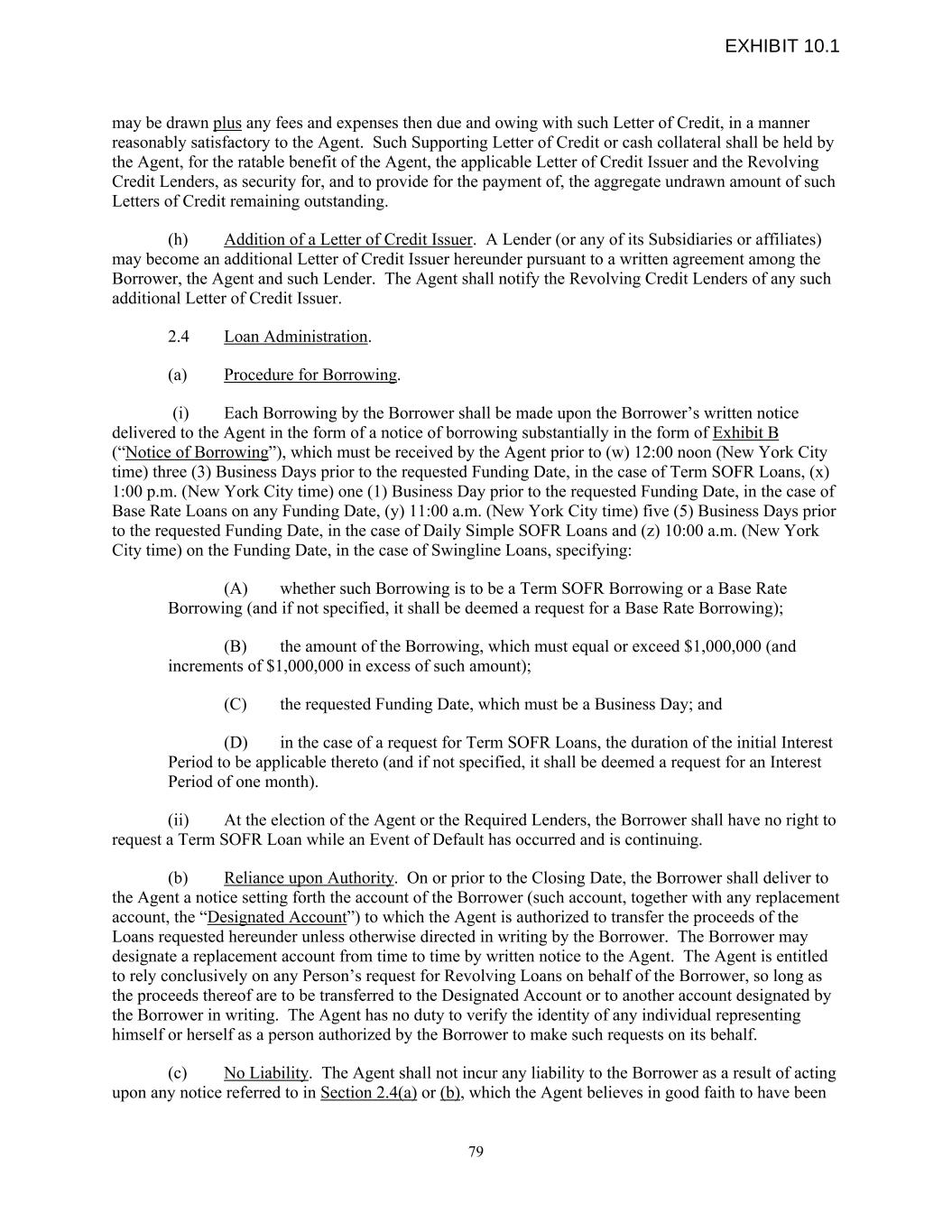 may be drawn plus any fees and expenses then due and owing with such Letter of Credit, in a manner reasonably satisfactory to the Agent. Such Supporting Letter of Credit or cash collateral shall be held by the Agent, for the ratable benefit of the Agent, the applicable Letter of Credit Issuer and the Revolving Credit Lenders, as security for, and to provide for the payment of, the aggregate undrawn amount of such Letters of Credit remaining outstanding. (h) Addition of a Letter of Credit Issuer. A Lender (or any of its Subsidiaries or affiliates) may become an additional Letter of Credit Issuer hereunder pursuant to a written agreement among the Borrower, the Agent and such Lender. The Agent shall notify the Revolving Credit Lenders of any such additional Letter of Credit Issuer. 2.4 Loan Administration. (a) Procedure for Borrowing. (i) Each Borrowing by the Borrower shall be made upon the Borrower’s written notice delivered to the Agent in the form of a notice of borrowing substantially in the form of Exhibit B (“Notice of Borrowing”), which must be received by the Agent prior to (w) 12:00 noon (New York City time) three (3) Business Days prior to the requested Funding Date, in the case of Term SOFR Loans, (x) 1:00 p.m. (New York City time) one (1) Business Day prior to the requested Funding Date, in the case of Base Rate Loans on any Funding Date, (y) 11:00 a.m. (New York City time) five (5) Business Days prior to the requested Funding Date, in the case of Daily Simple SOFR Loans and (z) 10:00 a.m. (New York City time) on the Funding Date, in the case of Swingline Loans, specifying: (A) whether such Borrowing is to be a Term SOFR Borrowing or a Base Rate Borrowing (and if not specified, it shall be deemed a request for a Base Rate Borrowing); (B) the amount of the Borrowing, which must equal or exceed $1,000,000 (and increments of $1,000,000 in excess of such amount); (C) the requested Funding Date, which must be a Business Day; and (D) in the case of a request for Term SOFR Loans, the duration of the initial Interest Period to be applicable thereto (and if not specified, it shall be deemed a request for an Interest Period of one month). (ii) At the election of the Agent or the Required Lenders, the Borrower shall have no right to request a Term SOFR Loan while an Event of Default has occurred and is continuing. (b) Reliance upon Authority. On or prior to the Closing Date, the Borrower shall deliver to the Agent a notice setting forth the account of the Borrower (such account, together with any replacement account, the “Designated Account”) to which the Agent is authorized to transfer the proceeds of the Loans requested hereunder unless otherwise directed in writing by the Borrower. The Borrower may designate a replacement account from time to time by written notice to the Agent. The Agent is entitled to rely conclusively on any Person’s request for Revolving Loans on behalf of the Borrower, so long as the proceeds thereof are to be transferred to the Designated Account or to another account designated by the Borrower in writing. The Agent has no duty to verify the identity of any individual representing himself or herself as a person authorized by the Borrower to make such requests on its behalf. (c) No Liability. The Agent shall not incur any liability to the Borrower as a result of acting upon any notice referred to in Section 2.4(a) or (b), which the Agent believes in good faith to have been 79 EXHIBIT 10.1