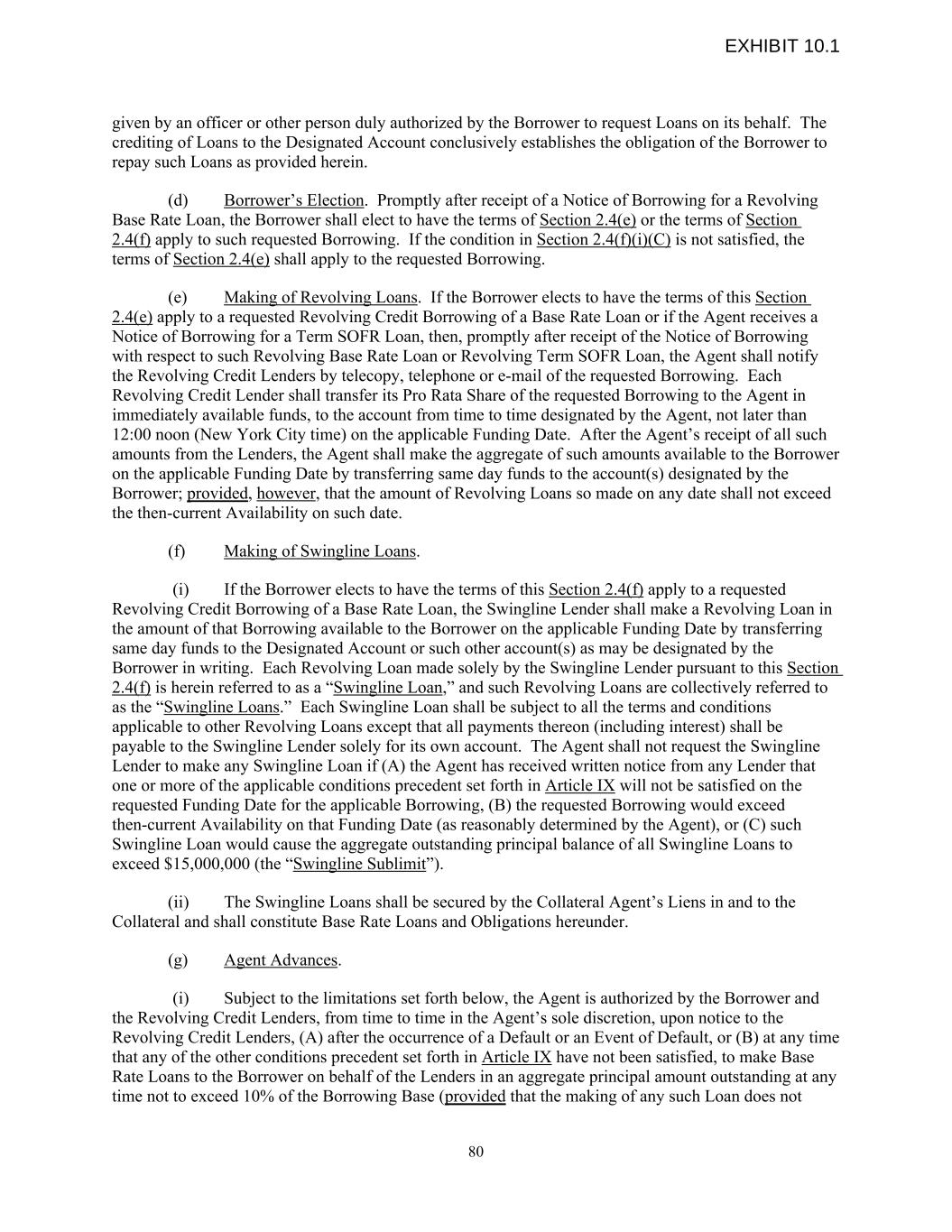 given by an officer or other person duly authorized by the Borrower to request Loans on its behalf. The crediting of Loans to the Designated Account conclusively establishes the obligation of the Borrower to repay such Loans as provided herein. (d) Borrower’s Election. Promptly after receipt of a Notice of Borrowing for a Revolving Base Rate Loan, the Borrower shall elect to have the terms of Section 2.4(e) or the terms of Section 2.4(f) apply to such requested Borrowing. If the condition in Section 2.4(f)(i)(C) is not satisfied, the terms of Section 2.4(e) shall apply to the requested Borrowing. (e) Making of Revolving Loans. If the Borrower elects to have the terms of this Section 2.4(e) apply to a requested Revolving Credit Borrowing of a Base Rate Loan or if the Agent receives a Notice of Borrowing for a Term SOFR Loan, then, promptly after receipt of the Notice of Borrowing with respect to such Revolving Base Rate Loan or Revolving Term SOFR Loan, the Agent shall notify the Revolving Credit Lenders by telecopy, telephone or e-mail of the requested Borrowing. Each Revolving Credit Lender shall transfer its Pro Rata Share of the requested Borrowing to the Agent in immediately available funds, to the account from time to time designated by the Agent, not later than 12:00 noon (New York City time) on the applicable Funding Date. After the Agent’s receipt of all such amounts from the Lenders, the Agent shall make the aggregate of such amounts available to the Borrower on the applicable Funding Date by transferring same day funds to the account(s) designated by the Borrower; provided, however, that the amount of Revolving Loans so made on any date shall not exceed the then-current Availability on such date. (f) Making of Swingline Loans. (i) If the Borrower elects to have the terms of this Section 2.4(f) apply to a requested Revolving Credit Borrowing of a Base Rate Loan, the Swingline Lender shall make a Revolving Loan in the amount of that Borrowing available to the Borrower on the applicable Funding Date by transferring same day funds to the Designated Account or such other account(s) as may be designated by the Borrower in writing. Each Revolving Loan made solely by the Swingline Lender pursuant to this Section 2.4(f) is herein referred to as a “Swingline Loan,” and such Revolving Loans are collectively referred to as the “Swingline Loans.” Each Swingline Loan shall be subject to all the terms and conditions applicable to other Revolving Loans except that all payments thereon (including interest) shall be payable to the Swingline Lender solely for its own account. The Agent shall not request the Swingline Lender to make any Swingline Loan if (A) the Agent has received written notice from any Lender that one or more of the applicable conditions precedent set forth in Article IX will not be satisfied on the requested Funding Date for the applicable Borrowing, (B) the requested Borrowing would exceed then-current Availability on that Funding Date (as reasonably determined by the Agent), or (C) such Swingline Loan would cause the aggregate outstanding principal balance of all Swingline Loans to exceed $15,000,000 (the “Swingline Sublimit”). (ii) The Swingline Loans shall be secured by the Collateral Agent’s Liens in and to the Collateral and shall constitute Base Rate Loans and Obligations hereunder. (g) Agent Advances. (i) Subject to the limitations set forth below, the Agent is authorized by the Borrower and the Revolving Credit Lenders, from time to time in the Agent’s sole discretion, upon notice to the Revolving Credit Lenders, (A) after the occurrence of a Default or an Event of Default, or (B) at any time that any of the other conditions precedent set forth in Article IX have not been satisfied, to make Base Rate Loans to the Borrower on behalf of the Lenders in an aggregate principal amount outstanding at any time not to exceed 10% of the Borrowing Base (provided that the making of any such Loan does not 80 EXHIBIT 10.1