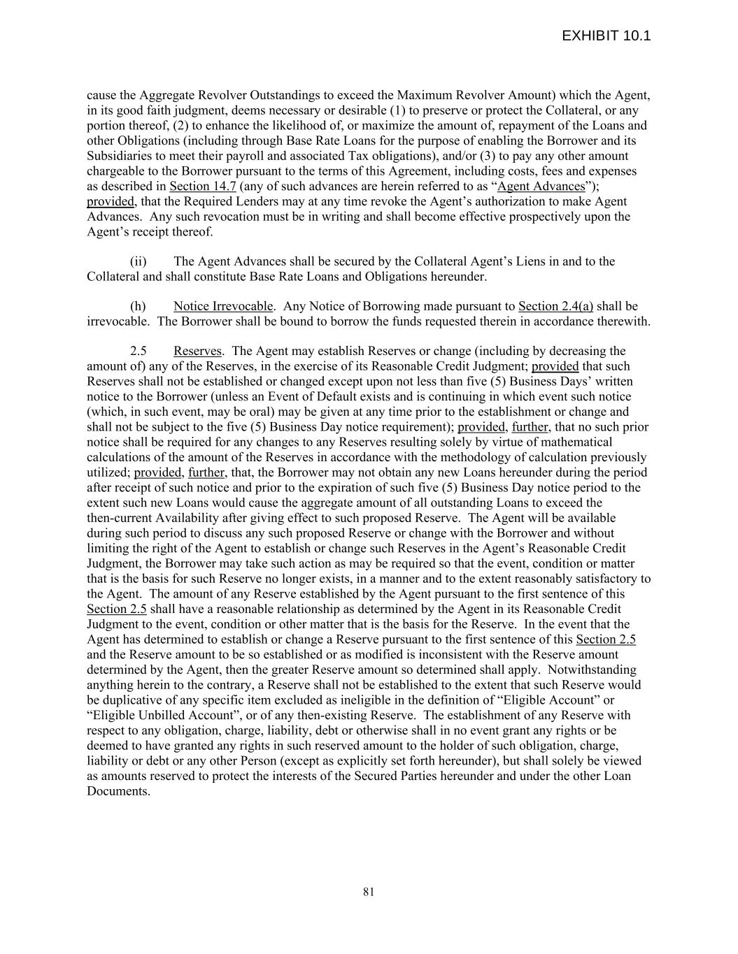 cause the Aggregate Revolver Outstandings to exceed the Maximum Revolver Amount) which the Agent, in its good faith judgment, deems necessary or desirable (1) to preserve or protect the Collateral, or any portion thereof, (2) to enhance the likelihood of, or maximize the amount of, repayment of the Loans and other Obligations (including through Base Rate Loans for the purpose of enabling the Borrower and its Subsidiaries to meet their payroll and associated Tax obligations), and/or (3) to pay any other amount chargeable to the Borrower pursuant to the terms of this Agreement, including costs, fees and expenses as described in Section 14.7 (any of such advances are herein referred to as “Agent Advances”); provided, that the Required Lenders may at any time revoke the Agent’s authorization to make Agent Advances. Any such revocation must be in writing and shall become effective prospectively upon the Agent’s receipt thereof. (ii) The Agent Advances shall be secured by the Collateral Agent’s Liens in and to the Collateral and shall constitute Base Rate Loans and Obligations hereunder. (h) Notice Irrevocable. Any Notice of Borrowing made pursuant to Section 2.4(a) shall be irrevocable. The Borrower shall be bound to borrow the funds requested therein in accordance therewith. 2.5 Reserves. The Agent may establish Reserves or change (including by decreasing the amount of) any of the Reserves, in the exercise of its Reasonable Credit Judgment; provided that such Reserves shall not be established or changed except upon not less than five (5) Business Days’ written notice to the Borrower (unless an Event of Default exists and is continuing in which event such notice (which, in such event, may be oral) may be given at any time prior to the establishment or change and shall not be subject to the five (5) Business Day notice requirement); provided, further, that no such prior notice shall be required for any changes to any Reserves resulting solely by virtue of mathematical calculations of the amount of the Reserves in accordance with the methodology of calculation previously utilized; provided, further, that, the Borrower may not obtain any new Loans hereunder during the period after receipt of such notice and prior to the expiration of such five (5) Business Day notice period to the extent such new Loans would cause the aggregate amount of all outstanding Loans to exceed the then-current Availability after giving effect to such proposed Reserve. The Agent will be available during such period to discuss any such proposed Reserve or change with the Borrower and without limiting the right of the Agent to establish or change such Reserves in the Agent’s Reasonable Credit Judgment, the Borrower may take such action as may be required so that the event, condition or matter that is the basis for such Reserve no longer exists, in a manner and to the extent reasonably satisfactory to the Agent. The amount of any Reserve established by the Agent pursuant to the first sentence of this Section 2.5 shall have a reasonable relationship as determined by the Agent in its Reasonable Credit Judgment to the event, condition or other matter that is the basis for the Reserve. In the event that the Agent has determined to establish or change a Reserve pursuant to the first sentence of this Section 2.5 and the Reserve amount to be so established or as modified is inconsistent with the Reserve amount determined by the Agent, then the greater Reserve amount so determined shall apply. Notwithstanding anything herein to the contrary, a Reserve shall not be established to the extent that such Reserve would be duplicative of any specific item excluded as ineligible in the definition of “Eligible Account” or “Eligible Unbilled Account”, or of any then-existing Reserve. The establishment of any Reserve with respect to any obligation, charge, liability, debt or otherwise shall in no event grant any rights or be deemed to have granted any rights in such reserved amount to the holder of such obligation, charge, liability or debt or any other Person (except as explicitly set forth hereunder), but shall solely be viewed as amounts reserved to protect the interests of the Secured Parties hereunder and under the other Loan Documents. 81 EXHIBIT 10.1
