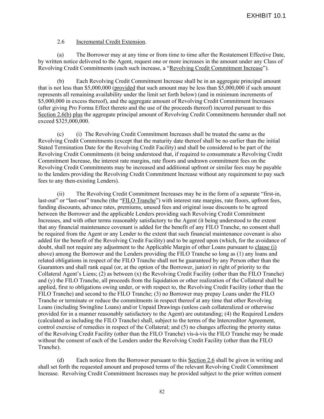 2.6 Incremental Credit Extension. (a) The Borrower may at any time or from time to time after the Restatement Effective Date, by written notice delivered to the Agent, request one or more increases in the amount under any Class of Revolving Credit Commitments (each such increase, a “Revolving Credit Commitment Increase”). (b) Each Revolving Credit Commitment Increase shall be in an aggregate principal amount that is not less than $5,000,000 (provided that such amount may be less than $5,000,000 if such amount represents all remaining availability under the limit set forth below) (and in minimum increments of $5,000,000 in excess thereof), and the aggregate amount of Revolving Credit Commitment Increases (after giving Pro Forma Effect thereto and the use of the proceeds thereof) incurred pursuant to this Section 2.6(b) plus the aggregate principal amount of Revolving Credit Commitments hereunder shall not exceed $325,000,000. (c) (i) The Revolving Credit Commitment Increases shall be treated the same as the Revolving Credit Commitments (except that the maturity date thereof shall be no earlier than the initial Stated Termination Date for the Revolving Credit Facility) and shall be considered to be part of the Revolving Credit Commitments (it being understood that, if required to consummate a Revolving Credit Commitment Increase, the interest rate margins, rate floors and undrawn commitment fees on the Revolving Credit Commitments may be increased and additional upfront or similar fees may be payable to the lenders providing the Revolving Credit Commitment Increase without any requirement to pay such fees to any then-existing Lenders). (ii) The Revolving Credit Commitment Increases may be in the form of a separate “first-in, last-out” or “last-out” tranche (the “FILO Tranche”) with interest rate margins, rate floors, upfront fees, funding discounts, advance rates, premiums, unused fees and original issue discounts to be agreed between the Borrower and the applicable Lenders providing such Revolving Credit Commitment Increases, and with other terms reasonably satisfactory to the Agent (it being understood to the extent that any financial maintenance covenant is added for the benefit of any FILO Tranche, no consent shall be required from the Agent or any Lender to the extent that such financial maintenance covenant is also added for the benefit of the Revolving Credit Facility) and to be agreed upon (which, for the avoidance of doubt, shall not require any adjustment to the Applicable Margin of other Loans pursuant to clause (i) above) among the Borrower and the Lenders providing the FILO Tranche so long as (1) any loans and related obligations in respect of the FILO Tranche shall not be guaranteed by any Person other than the Guarantors and shall rank equal (or, at the option of the Borrower, junior) in right of priority to the Collateral Agent’s Liens; (2) as between (x) the Revolving Credit Facility (other than the FILO Tranche) and (y) the FILO Tranche, all proceeds from the liquidation or other realization of the Collateral shall be applied, first to obligations owing under, or with respect to, the Revolving Credit Facility (other than the FILO Tranche) and second to the FILO Tranche; (3) no Borrower may prepay Loans under the FILO Tranche or terminate or reduce the commitments in respect thereof at any time that other Revolving Loans (including Swingline Loans) and/or Unpaid Drawings (unless cash collateralized or otherwise provided for in a manner reasonably satisfactory to the Agent) are outstanding; (4) the Required Lenders (calculated as including the FILO Tranche) shall, subject to the terms of the Intercreditor Agreement, control exercise of remedies in respect of the Collateral; and (5) no changes affecting the priority status of the Revolving Credit Facility (other than the FILO Tranche) vis-à-vis the FILO Tranche may be made without the consent of each of the Lenders under the Revolving Credit Facility (other than the FILO Tranche). (d) Each notice from the Borrower pursuant to this Section 2.6 shall be given in writing and shall set forth the requested amount and proposed terms of the relevant Revolving Credit Commitment Increase. Revolving Credit Commitment Increases may be provided subject to the prior written consent 82 EXHIBIT 10.1