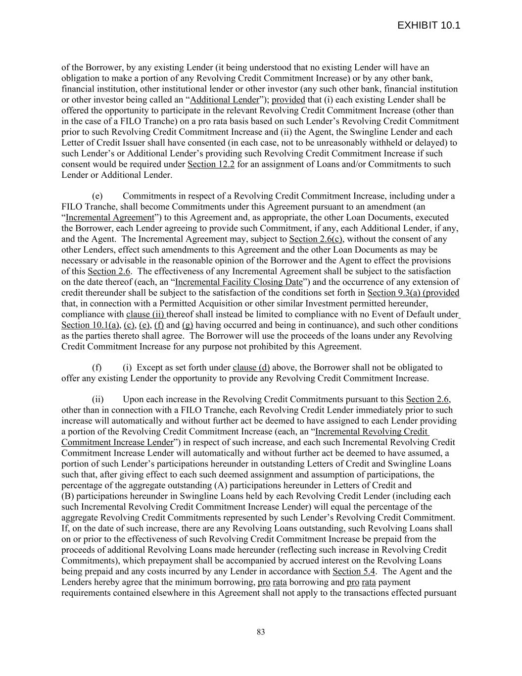 of the Borrower, by any existing Lender (it being understood that no existing Lender will have an obligation to make a portion of any Revolving Credit Commitment Increase) or by any other bank, financial institution, other institutional lender or other investor (any such other bank, financial institution or other investor being called an “Additional Lender”); provided that (i) each existing Lender shall be offered the opportunity to participate in the relevant Revolving Credit Commitment Increase (other than in the case of a FILO Tranche) on a pro rata basis based on such Lender’s Revolving Credit Commitment prior to such Revolving Credit Commitment Increase and (ii) the Agent, the Swingline Lender and each Letter of Credit Issuer shall have consented (in each case, not to be unreasonably withheld or delayed) to such Lender’s or Additional Lender’s providing such Revolving Credit Commitment Increase if such consent would be required under Section 12.2 for an assignment of Loans and/or Commitments to such Lender or Additional Lender. (e) Commitments in respect of a Revolving Credit Commitment Increase, including under a FILO Tranche, shall become Commitments under this Agreement pursuant to an amendment (an “Incremental Agreement”) to this Agreement and, as appropriate, the other Loan Documents, executed the Borrower, each Lender agreeing to provide such Commitment, if any, each Additional Lender, if any, and the Agent. The Incremental Agreement may, subject to Section 2.6(c), without the consent of any other Lenders, effect such amendments to this Agreement and the other Loan Documents as may be necessary or advisable in the reasonable opinion of the Borrower and the Agent to effect the provisions of this Section 2.6. The effectiveness of any Incremental Agreement shall be subject to the satisfaction on the date thereof (each, an “Incremental Facility Closing Date”) and the occurrence of any extension of credit thereunder shall be subject to the satisfaction of the conditions set forth in Section 9.3(a) (provided that, in connection with a Permitted Acquisition or other similar Investment permitted hereunder, compliance with clause (ii) thereof shall instead be limited to compliance with no Event of Default under Section 10.1(a), (c), (e), (f) and (g) having occurred and being in continuance), and such other conditions as the parties thereto shall agree. The Borrower will use the proceeds of the loans under any Revolving Credit Commitment Increase for any purpose not prohibited by this Agreement. (f) (i) Except as set forth under clause (d) above, the Borrower shall not be obligated to offer any existing Lender the opportunity to provide any Revolving Credit Commitment Increase. (ii) Upon each increase in the Revolving Credit Commitments pursuant to this Section 2.6, other than in connection with a FILO Tranche, each Revolving Credit Lender immediately prior to such increase will automatically and without further act be deemed to have assigned to each Lender providing a portion of the Revolving Credit Commitment Increase (each, an “Incremental Revolving Credit Commitment Increase Lender”) in respect of such increase, and each such Incremental Revolving Credit Commitment Increase Lender will automatically and without further act be deemed to have assumed, a portion of such Lender’s participations hereunder in outstanding Letters of Credit and Swingline Loans such that, after giving effect to each such deemed assignment and assumption of participations, the percentage of the aggregate outstanding (A) participations hereunder in Letters of Credit and (B) participations hereunder in Swingline Loans held by each Revolving Credit Lender (including each such Incremental Revolving Credit Commitment Increase Lender) will equal the percentage of the aggregate Revolving Credit Commitments represented by such Lender’s Revolving Credit Commitment. If, on the date of such increase, there are any Revolving Loans outstanding, such Revolving Loans shall on or prior to the effectiveness of such Revolving Credit Commitment Increase be prepaid from the proceeds of additional Revolving Loans made hereunder (reflecting such increase in Revolving Credit Commitments), which prepayment shall be accompanied by accrued interest on the Revolving Loans being prepaid and any costs incurred by any Lender in accordance with Section 5.4. The Agent and the Lenders hereby agree that the minimum borrowing, pro rata borrowing and pro rata payment requirements contained elsewhere in this Agreement shall not apply to the transactions effected pursuant 83 EXHIBIT 10.1