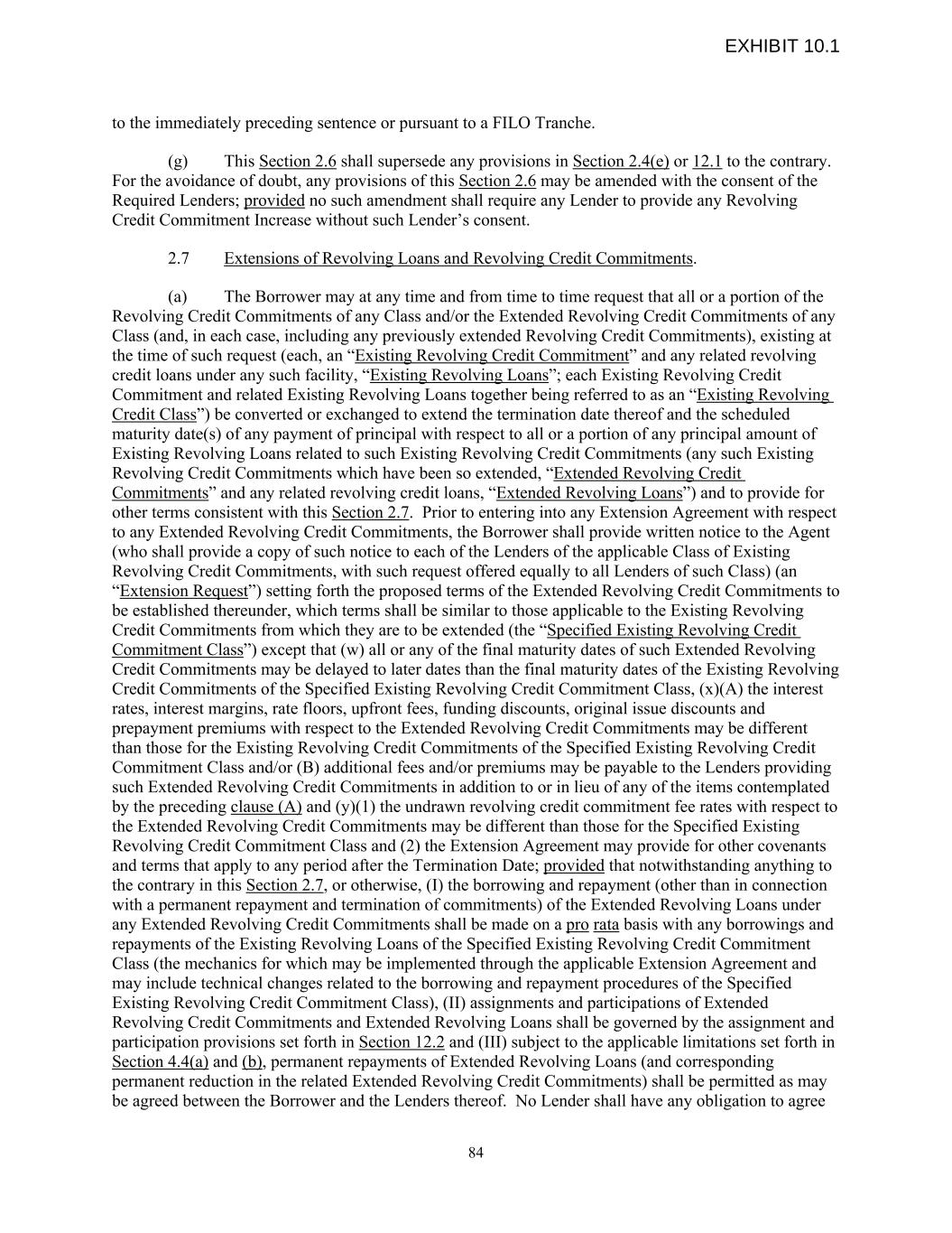 to the immediately preceding sentence or pursuant to a FILO Tranche. (g) This Section 2.6 shall supersede any provisions in Section 2.4(e) or 12.1 to the contrary. For the avoidance of doubt, any provisions of this Section 2.6 may be amended with the consent of the Required Lenders; provided no such amendment shall require any Lender to provide any Revolving Credit Commitment Increase without such Lender’s consent. 2.7 Extensions of Revolving Loans and Revolving Credit Commitments. (a) The Borrower may at any time and from time to time request that all or a portion of the Revolving Credit Commitments of any Class and/or the Extended Revolving Credit Commitments of any Class (and, in each case, including any previously extended Revolving Credit Commitments), existing at the time of such request (each, an “Existing Revolving Credit Commitment” and any related revolving credit loans under any such facility, “Existing Revolving Loans”; each Existing Revolving Credit Commitment and related Existing Revolving Loans together being referred to as an “Existing Revolving Credit Class”) be converted or exchanged to extend the termination date thereof and the scheduled maturity date(s) of any payment of principal with respect to all or a portion of any principal amount of Existing Revolving Loans related to such Existing Revolving Credit Commitments (any such Existing Revolving Credit Commitments which have been so extended, “Extended Revolving Credit Commitments” and any related revolving credit loans, “Extended Revolving Loans”) and to provide for other terms consistent with this Section 2.7. Prior to entering into any Extension Agreement with respect to any Extended Revolving Credit Commitments, the Borrower shall provide written notice to the Agent (who shall provide a copy of such notice to each of the Lenders of the applicable Class of Existing Revolving Credit Commitments, with such request offered equally to all Lenders of such Class) (an “Extension Request”) setting forth the proposed terms of the Extended Revolving Credit Commitments to be established thereunder, which terms shall be similar to those applicable to the Existing Revolving Credit Commitments from which they are to be extended (the “Specified Existing Revolving Credit Commitment Class”) except that (w) all or any of the final maturity dates of such Extended Revolving Credit Commitments may be delayed to later dates than the final maturity dates of the Existing Revolving Credit Commitments of the Specified Existing Revolving Credit Commitment Class, (x)(A) the interest rates, interest margins, rate floors, upfront fees, funding discounts, original issue discounts and prepayment premiums with respect to the Extended Revolving Credit Commitments may be different than those for the Existing Revolving Credit Commitments of the Specified Existing Revolving Credit Commitment Class and/or (B) additional fees and/or premiums may be payable to the Lenders providing such Extended Revolving Credit Commitments in addition to or in lieu of any of the items contemplated by the preceding clause (A) and (y)(1) the undrawn revolving credit commitment fee rates with respect to the Extended Revolving Credit Commitments may be different than those for the Specified Existing Revolving Credit Commitment Class and (2) the Extension Agreement may provide for other covenants and terms that apply to any period after the Termination Date; provided that notwithstanding anything to the contrary in this Section 2.7, or otherwise, (I) the borrowing and repayment (other than in connection with a permanent repayment and termination of commitments) of the Extended Revolving Loans under any Extended Revolving Credit Commitments shall be made on a pro rata basis with any borrowings and repayments of the Existing Revolving Loans of the Specified Existing Revolving Credit Commitment Class (the mechanics for which may be implemented through the applicable Extension Agreement and may include technical changes related to the borrowing and repayment procedures of the Specified Existing Revolving Credit Commitment Class), (II) assignments and participations of Extended Revolving Credit Commitments and Extended Revolving Loans shall be governed by the assignment and participation provisions set forth in Section 12.2 and (III) subject to the applicable limitations set forth in Section 4.4(a) and (b), permanent repayments of Extended Revolving Loans (and corresponding permanent reduction in the related Extended Revolving Credit Commitments) shall be permitted as may be agreed between the Borrower and the Lenders thereof. No Lender shall have any obligation to agree 84 EXHIBIT 10.1