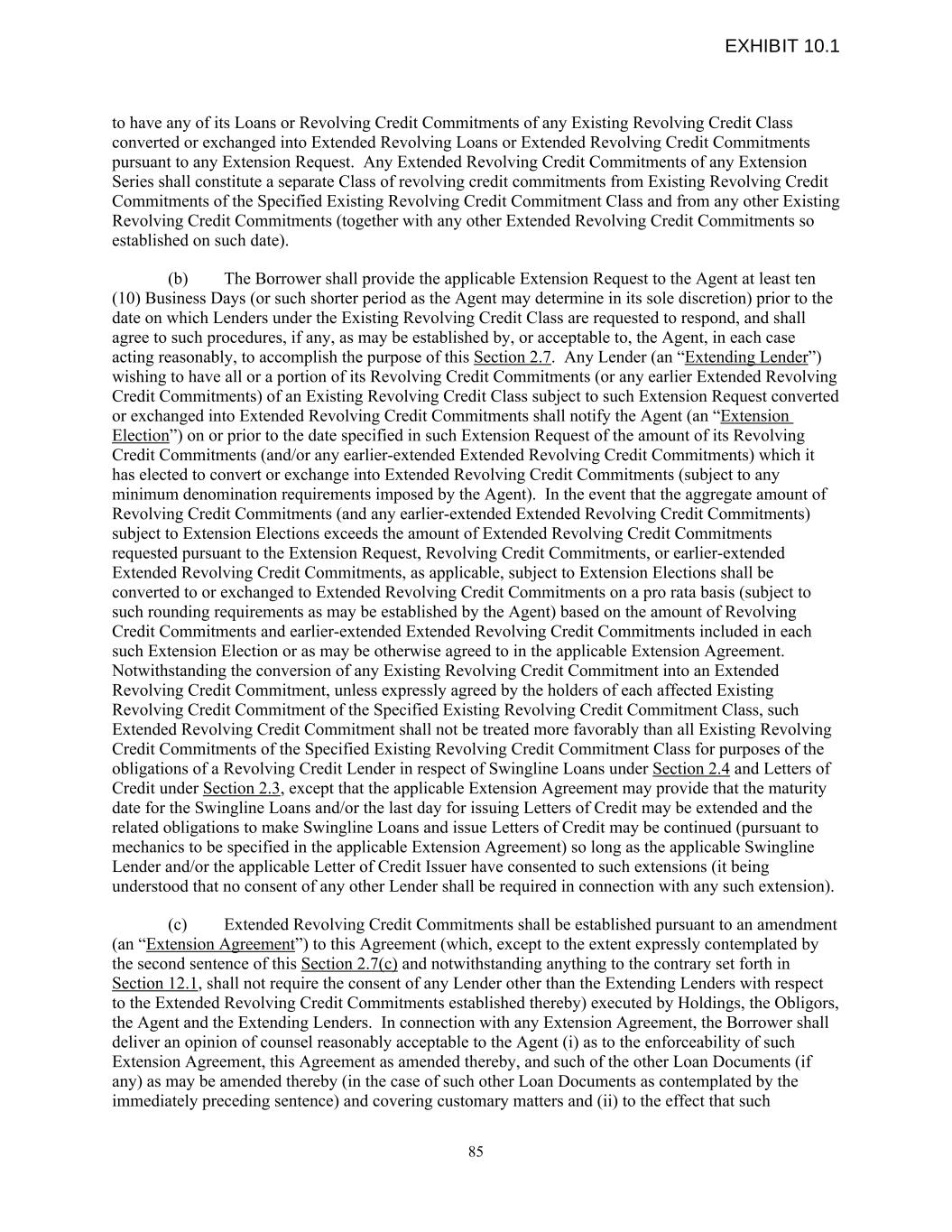 to have any of its Loans or Revolving Credit Commitments of any Existing Revolving Credit Class converted or exchanged into Extended Revolving Loans or Extended Revolving Credit Commitments pursuant to any Extension Request. Any Extended Revolving Credit Commitments of any Extension Series shall constitute a separate Class of revolving credit commitments from Existing Revolving Credit Commitments of the Specified Existing Revolving Credit Commitment Class and from any other Existing Revolving Credit Commitments (together with any other Extended Revolving Credit Commitments so established on such date). (b) The Borrower shall provide the applicable Extension Request to the Agent at least ten (10) Business Days (or such shorter period as the Agent may determine in its sole discretion) prior to the date on which Lenders under the Existing Revolving Credit Class are requested to respond, and shall agree to such procedures, if any, as may be established by, or acceptable to, the Agent, in each case acting reasonably, to accomplish the purpose of this Section 2.7. Any Lender (an “Extending Lender”) wishing to have all or a portion of its Revolving Credit Commitments (or any earlier Extended Revolving Credit Commitments) of an Existing Revolving Credit Class subject to such Extension Request converted or exchanged into Extended Revolving Credit Commitments shall notify the Agent (an “Extension Election”) on or prior to the date specified in such Extension Request of the amount of its Revolving Credit Commitments (and/or any earlier-extended Extended Revolving Credit Commitments) which it has elected to convert or exchange into Extended Revolving Credit Commitments (subject to any minimum denomination requirements imposed by the Agent). In the event that the aggregate amount of Revolving Credit Commitments (and any earlier-extended Extended Revolving Credit Commitments) subject to Extension Elections exceeds the amount of Extended Revolving Credit Commitments requested pursuant to the Extension Request, Revolving Credit Commitments, or earlier-extended Extended Revolving Credit Commitments, as applicable, subject to Extension Elections shall be converted to or exchanged to Extended Revolving Credit Commitments on a pro rata basis (subject to such rounding requirements as may be established by the Agent) based on the amount of Revolving Credit Commitments and earlier-extended Extended Revolving Credit Commitments included in each such Extension Election or as may be otherwise agreed to in the applicable Extension Agreement. Notwithstanding the conversion of any Existing Revolving Credit Commitment into an Extended Revolving Credit Commitment, unless expressly agreed by the holders of each affected Existing Revolving Credit Commitment of the Specified Existing Revolving Credit Commitment Class, such Extended Revolving Credit Commitment shall not be treated more favorably than all Existing Revolving Credit Commitments of the Specified Existing Revolving Credit Commitment Class for purposes of the obligations of a Revolving Credit Lender in respect of Swingline Loans under Section 2.4 and Letters of Credit under Section 2.3, except that the applicable Extension Agreement may provide that the maturity date for the Swingline Loans and/or the last day for issuing Letters of Credit may be extended and the related obligations to make Swingline Loans and issue Letters of Credit may be continued (pursuant to mechanics to be specified in the applicable Extension Agreement) so long as the applicable Swingline Lender and/or the applicable Letter of Credit Issuer have consented to such extensions (it being understood that no consent of any other Lender shall be required in connection with any such extension). (c) Extended Revolving Credit Commitments shall be established pursuant to an amendment (an “Extension Agreement”) to this Agreement (which, except to the extent expressly contemplated by the second sentence of this Section 2.7(c) and notwithstanding anything to the contrary set forth in Section 12.1, shall not require the consent of any Lender other than the Extending Lenders with respect to the Extended Revolving Credit Commitments established thereby) executed by Holdings, the Obligors, the Agent and the Extending Lenders. In connection with any Extension Agreement, the Borrower shall deliver an opinion of counsel reasonably acceptable to the Agent (i) as to the enforceability of such Extension Agreement, this Agreement as amended thereby, and such of the other Loan Documents (if any) as may be amended thereby (in the case of such other Loan Documents as contemplated by the immediately preceding sentence) and covering customary matters and (ii) to the effect that such 85 EXHIBIT 10.1