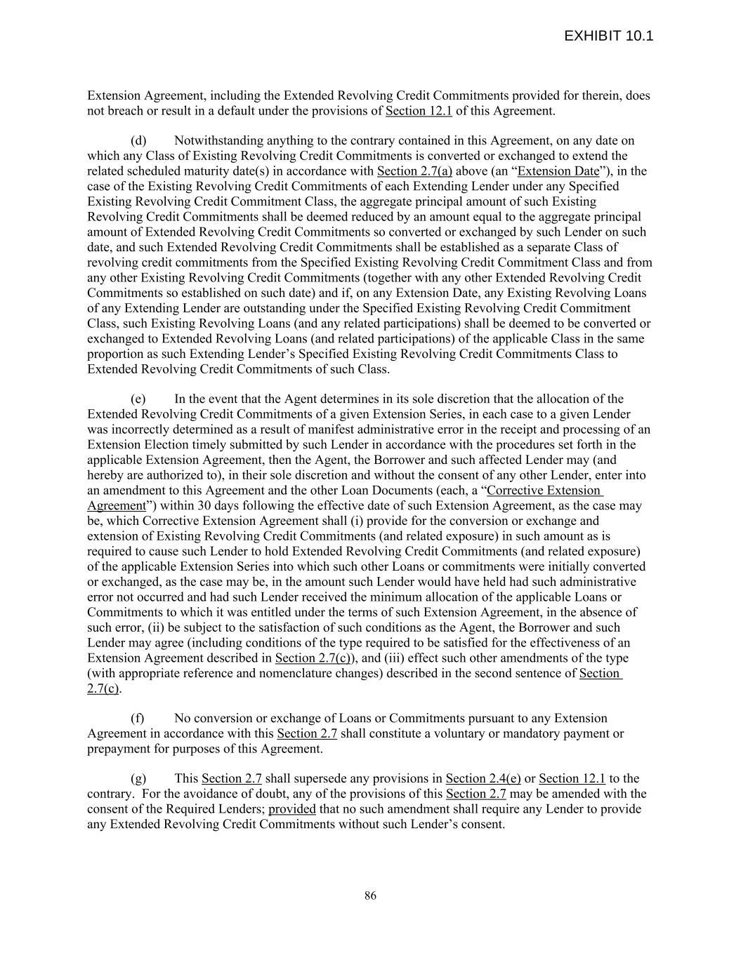Extension Agreement, including the Extended Revolving Credit Commitments provided for therein, does not breach or result in a default under the provisions of Section 12.1 of this Agreement. (d) Notwithstanding anything to the contrary contained in this Agreement, on any date on which any Class of Existing Revolving Credit Commitments is converted or exchanged to extend the related scheduled maturity date(s) in accordance with Section 2.7(a) above (an “Extension Date”), in the case of the Existing Revolving Credit Commitments of each Extending Lender under any Specified Existing Revolving Credit Commitment Class, the aggregate principal amount of such Existing Revolving Credit Commitments shall be deemed reduced by an amount equal to the aggregate principal amount of Extended Revolving Credit Commitments so converted or exchanged by such Lender on such date, and such Extended Revolving Credit Commitments shall be established as a separate Class of revolving credit commitments from the Specified Existing Revolving Credit Commitment Class and from any other Existing Revolving Credit Commitments (together with any other Extended Revolving Credit Commitments so established on such date) and if, on any Extension Date, any Existing Revolving Loans of any Extending Lender are outstanding under the Specified Existing Revolving Credit Commitment Class, such Existing Revolving Loans (and any related participations) shall be deemed to be converted or exchanged to Extended Revolving Loans (and related participations) of the applicable Class in the same proportion as such Extending Lender’s Specified Existing Revolving Credit Commitments Class to Extended Revolving Credit Commitments of such Class. (e) In the event that the Agent determines in its sole discretion that the allocation of the Extended Revolving Credit Commitments of a given Extension Series, in each case to a given Lender was incorrectly determined as a result of manifest administrative error in the receipt and processing of an Extension Election timely submitted by such Lender in accordance with the procedures set forth in the applicable Extension Agreement, then the Agent, the Borrower and such affected Lender may (and hereby are authorized to), in their sole discretion and without the consent of any other Lender, enter into an amendment to this Agreement and the other Loan Documents (each, a “Corrective Extension Agreement”) within 30 days following the effective date of such Extension Agreement, as the case may be, which Corrective Extension Agreement shall (i) provide for the conversion or exchange and extension of Existing Revolving Credit Commitments (and related exposure) in such amount as is required to cause such Lender to hold Extended Revolving Credit Commitments (and related exposure) of the applicable Extension Series into which such other Loans or commitments were initially converted or exchanged, as the case may be, in the amount such Lender would have held had such administrative error not occurred and had such Lender received the minimum allocation of the applicable Loans or Commitments to which it was entitled under the terms of such Extension Agreement, in the absence of such error, (ii) be subject to the satisfaction of such conditions as the Agent, the Borrower and such Lender may agree (including conditions of the type required to be satisfied for the effectiveness of an Extension Agreement described in Section 2.7(c)), and (iii) effect such other amendments of the type (with appropriate reference and nomenclature changes) described in the second sentence of Section 2.7(c). (f) No conversion or exchange of Loans or Commitments pursuant to any Extension Agreement in accordance with this Section 2.7 shall constitute a voluntary or mandatory payment or prepayment for purposes of this Agreement. (g) This Section 2.7 shall supersede any provisions in Section 2.4(e) or Section 12.1 to the contrary. For the avoidance of doubt, any of the provisions of this Section 2.7 may be amended with the consent of the Required Lenders; provided that no such amendment shall require any Lender to provide any Extended Revolving Credit Commitments without such Lender’s consent. 86 EXHIBIT 10.1