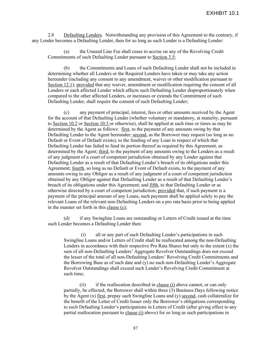 2.8 Defaulting Lenders. Notwithstanding any provision of this Agreement to the contrary, if any Lender becomes a Defaulting Lender, then for so long as such Lender is a Defaulting Lender: (a) the Unused Line Fee shall cease to accrue on any of the Revolving Credit Commitments of such Defaulting Lender pursuant to Section 3.5; (b) the Commitments and Loans of such Defaulting Lender shall not be included in determining whether all Lenders or the Required Lenders have taken or may take any action hereunder (including any consent to any amendment, waiver or other modification pursuant to Section 12.1); provided that any waiver, amendment or modification requiring the consent of all Lenders or each affected Lender which affects such Defaulting Lender disproportionately when compared to the other affected Lenders, or increases or extends the Commitment of such Defaulting Lender, shall require the consent of such Defaulting Lender; (c) any payment of principal, interest, fees or other amounts received by the Agent for the account of that Defaulting Lender (whether voluntary or mandatory, at maturity, pursuant to Section 10.2 or Section 10.3 or otherwise), shall be applied at such time or times as may be determined by the Agent as follows: first, to the payment of any amounts owing by that Defaulting Lender to the Agent hereunder; second, as the Borrower may request (so long as no Default or Event of Default exists), to the funding of any Loan in respect of which that Defaulting Lender has failed to fund its portion thereof as required by this Agreement, as determined by the Agent; third, to the payment of any amounts owing to the Lenders as a result of any judgment of a court of competent jurisdiction obtained by any Lender against that Defaulting Lender as a result of that Defaulting Lender’s breach of its obligations under this Agreement; fourth, so long as no Default or Event of Default exists, to the payment of any amounts owing to any Obligor as a result of any judgment of a court of competent jurisdiction obtained by any Obligor against that Defaulting Lender as a result of that Defaulting Lender’s breach of its obligations under this Agreement; and fifth, to that Defaulting Lender or as otherwise directed by a court of competent jurisdiction; provided that, if such payment is a payment of the principal amount of any Loans, such payment shall be applied solely to pay the relevant Loans of the relevant non-Defaulting Lenders on a pro rata basis prior to being applied in the manner set forth in this clause (c); (d) if any Swingline Loans are outstanding or Letters of Credit issued at the time such Lender becomes a Defaulting Lender then: (i) all or any part of such Defaulting Lender’s participations in such Swingline Loans and/or Letters of Credit shall be reallocated among the non-Defaulting Lenders in accordance with their respective Pro Rata Shares but only to the extent (x) the sum of all non-Defaulting Lenders’ Aggregate Revolver Outstandings does not exceed the lesser of the total of all non-Defaulting Lenders’ Revolving Credit Commitments and the Borrowing Base as of such date and (y) no such non-Defaulting Lender’s Aggregate Revolver Outstandings shall exceed such Lender’s Revolving Credit Commitment at such time; (ii) if the reallocation described in clause (i) above cannot, or can only partially, be effected, the Borrower shall within three (3) Business Days following notice by the Agent (x) first, prepay such Swingline Loans and (y) second, cash collateralize for the benefit of the Letter of Credit Issuer only the Borrower’s obligations corresponding to such Defaulting Lender’s participations in Letters of Credit (after giving effect to any partial reallocation pursuant to clause (i) above) for so long as such participations in 87 EXHIBIT 10.1