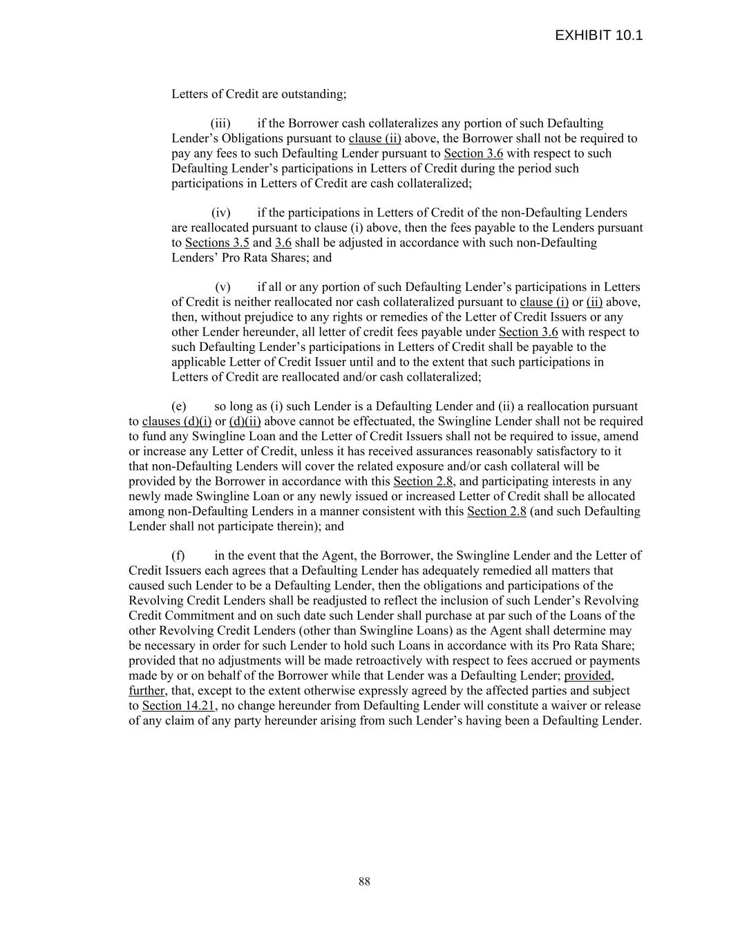 Letters of Credit are outstanding; (iii) if the Borrower cash collateralizes any portion of such Defaulting Lender’s Obligations pursuant to clause (ii) above, the Borrower shall not be required to pay any fees to such Defaulting Lender pursuant to Section 3.6 with respect to such Defaulting Lender’s participations in Letters of Credit during the period such participations in Letters of Credit are cash collateralized; (iv) if the participations in Letters of Credit of the non-Defaulting Lenders are reallocated pursuant to clause (i) above, then the fees payable to the Lenders pursuant to Sections 3.5 and 3.6 shall be adjusted in accordance with such non-Defaulting Lenders’ Pro Rata Shares; and (v) if all or any portion of such Defaulting Lender’s participations in Letters of Credit is neither reallocated nor cash collateralized pursuant to clause (i) or (ii) above, then, without prejudice to any rights or remedies of the Letter of Credit Issuers or any other Lender hereunder, all letter of credit fees payable under Section 3.6 with respect to such Defaulting Lender’s participations in Letters of Credit shall be payable to the applicable Letter of Credit Issuer until and to the extent that such participations in Letters of Credit are reallocated and/or cash collateralized; (e) so long as (i) such Lender is a Defaulting Lender and (ii) a reallocation pursuant to clauses (d)(i) or (d)(ii) above cannot be effectuated, the Swingline Lender shall not be required to fund any Swingline Loan and the Letter of Credit Issuers shall not be required to issue, amend or increase any Letter of Credit, unless it has received assurances reasonably satisfactory to it that non-Defaulting Lenders will cover the related exposure and/or cash collateral will be provided by the Borrower in accordance with this Section 2.8, and participating interests in any newly made Swingline Loan or any newly issued or increased Letter of Credit shall be allocated among non-Defaulting Lenders in a manner consistent with this Section 2.8 (and such Defaulting Lender shall not participate therein); and (f) in the event that the Agent, the Borrower, the Swingline Lender and the Letter of Credit Issuers each agrees that a Defaulting Lender has adequately remedied all matters that caused such Lender to be a Defaulting Lender, then the obligations and participations of the Revolving Credit Lenders shall be readjusted to reflect the inclusion of such Lender’s Revolving Credit Commitment and on such date such Lender shall purchase at par such of the Loans of the other Revolving Credit Lenders (other than Swingline Loans) as the Agent shall determine may be necessary in order for such Lender to hold such Loans in accordance with its Pro Rata Share; provided that no adjustments will be made retroactively with respect to fees accrued or payments made by or on behalf of the Borrower while that Lender was a Defaulting Lender; provided, further, that, except to the extent otherwise expressly agreed by the affected parties and subject to Section 14.21, no change hereunder from Defaulting Lender will constitute a waiver or release of any claim of any party hereunder arising from such Lender’s having been a Defaulting Lender. 88 EXHIBIT 10.1