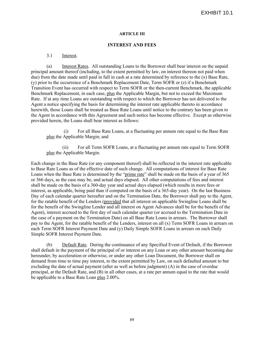 ARTICLE III INTEREST AND FEES 3.1 Interest. (a) Interest Rates. All outstanding Loans to the Borrower shall bear interest on the unpaid principal amount thereof (including, to the extent permitted by law, on interest thereon not paid when due) from the date made until paid in full in cash at a rate determined by reference to the (x) Base Rate, (y) prior to the occurrence of a Benchmark Replacement Date, Term SOFR or (z) if a Benchmark Transition Event has occurred with respect to Term SOFR or the then-current Benchmark, the applicable Benchmark Replacement, in each case, plus the Applicable Margin, but not to exceed the Maximum Rate. If at any time Loans are outstanding with respect to which the Borrower has not delivered to the Agent a notice specifying the basis for determining the interest rate applicable thereto in accordance herewith, those Loans shall be treated as Base Rate Loans until notice to the contrary has been given to the Agent in accordance with this Agreement and such notice has become effective. Except as otherwise provided herein, the Loans shall bear interest as follows: (i) For all Base Rate Loans, at a fluctuating per annum rate equal to the Base Rate plus the Applicable Margin; and (ii) For all Term SOFR Loans, at a fluctuating per annum rate equal to Term SOFR plus the Applicable Margin. Each change in the Base Rate (or any component thereof) shall be reflected in the interest rate applicable to Base Rate Loans as of the effective date of such change. All computations of interest for Base Rate Loans when the Base Rate is determined by the “prime rate” shall be made on the basis of a year of 365 or 366 days, as the case may be, and actual days elapsed. All other computations of fees and interest shall be made on the basis of a 360-day year and actual days elapsed (which results in more fees or interest, as applicable, being paid than if computed on the basis of a 365-day year). On the last Business Day of each calendar quarter hereafter and on the Termination Date, the Borrower shall pay to the Agent, for the ratable benefit of the Lenders (provided that all interest on applicable Swingline Loans shall be for the benefit of the Swingline Lender and all interest on Agent Advances shall be for the benefit of the Agent), interest accrued to the first day of such calendar quarter (or accrued to the Termination Date in the case of a payment on the Termination Date) on all Base Rate Loans in arrears. The Borrower shall pay to the Agent, for the ratable benefit of the Lenders, interest on all (x) Term SOFR Loans in arrears on each Term SOFR Interest Payment Date and (y) Daily Simple SOFR Loans in arrears on each Daily Simple SOFR Interest Payment Date. (b) Default Rate. During the continuance of any Specified Event of Default, if the Borrower shall default in the payment of the principal of or interest on any Loan or any other amount becoming due hereunder, by acceleration or otherwise, or under any other Loan Document, the Borrower shall on demand from time to time pay interest, to the extent permitted by Law, on such defaulted amount to but excluding the date of actual payment (after as well as before judgment) (A) in the case of overdue principal, at the Default Rate, and (B) in all other cases, at a rate per annum equal to the rate that would be applicable to a Base Rate Loan plus 2.00%. 89 EXHIBIT 10.1