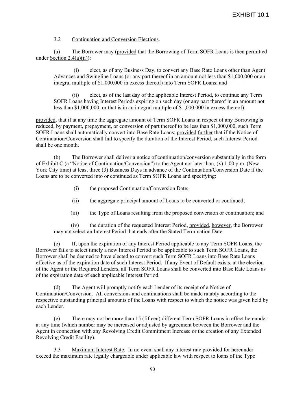3.2 Continuation and Conversion Elections. (a) The Borrower may (provided that the Borrowing of Term SOFR Loans is then permitted under Section 2.4(a)(ii)): (i) elect, as of any Business Day, to convert any Base Rate Loans other than Agent Advances and Swingline Loans (or any part thereof in an amount not less than $1,000,000 or an integral multiple of $1,000,000 in excess thereof) into Term SOFR Loans; and (ii) elect, as of the last day of the applicable Interest Period, to continue any Term SOFR Loans having Interest Periods expiring on such day (or any part thereof in an amount not less than $1,000,000, or that is in an integral multiple of $1,000,000 in excess thereof); provided, that if at any time the aggregate amount of Term SOFR Loans in respect of any Borrowing is reduced, by payment, prepayment, or conversion of part thereof to be less than $1,000,000, such Term SOFR Loans shall automatically convert into Base Rate Loans; provided further that if the Notice of Continuation/Conversion shall fail to specify the duration of the Interest Period, such Interest Period shall be one month. (b) The Borrower shall deliver a notice of continuation/conversion substantially in the form of Exhibit C (a “Notice of Continuation/Conversion”) to the Agent not later than, (x) 1:00 p.m. (New York City time) at least three (3) Business Days in advance of the Continuation/Conversion Date if the Loans are to be converted into or continued as Term SOFR Loans and specifying: (i) the proposed Continuation/Conversion Date; (ii) the aggregate principal amount of Loans to be converted or continued; (iii) the Type of Loans resulting from the proposed conversion or continuation; and (iv) the duration of the requested Interest Period, provided, however, the Borrower may not select an Interest Period that ends after the Stated Termination Date. (c) If, upon the expiration of any Interest Period applicable to any Term SOFR Loans, the Borrower fails to select timely a new Interest Period to be applicable to such Term SOFR Loans, the Borrower shall be deemed to have elected to convert such Term SOFR Loans into Base Rate Loans effective as of the expiration date of such Interest Period. If any Event of Default exists, at the election of the Agent or the Required Lenders, all Term SOFR Loans shall be converted into Base Rate Loans as of the expiration date of each applicable Interest Period. (d) The Agent will promptly notify each Lender of its receipt of a Notice of Continuation/Conversion. All conversions and continuations shall be made ratably according to the respective outstanding principal amounts of the Loans with respect to which the notice was given held by each Lender. (e) There may not be more than 15 (fifteen) different Term SOFR Loans in effect hereunder at any time (which number may be increased or adjusted by agreement between the Borrower and the Agent in connection with any Revolving Credit Commitment Increase or the creation of any Extended Revolving Credit Facility). 3.3 Maximum Interest Rate. In no event shall any interest rate provided for hereunder exceed the maximum rate legally chargeable under applicable law with respect to loans of the Type 90 EXHIBIT 10.1