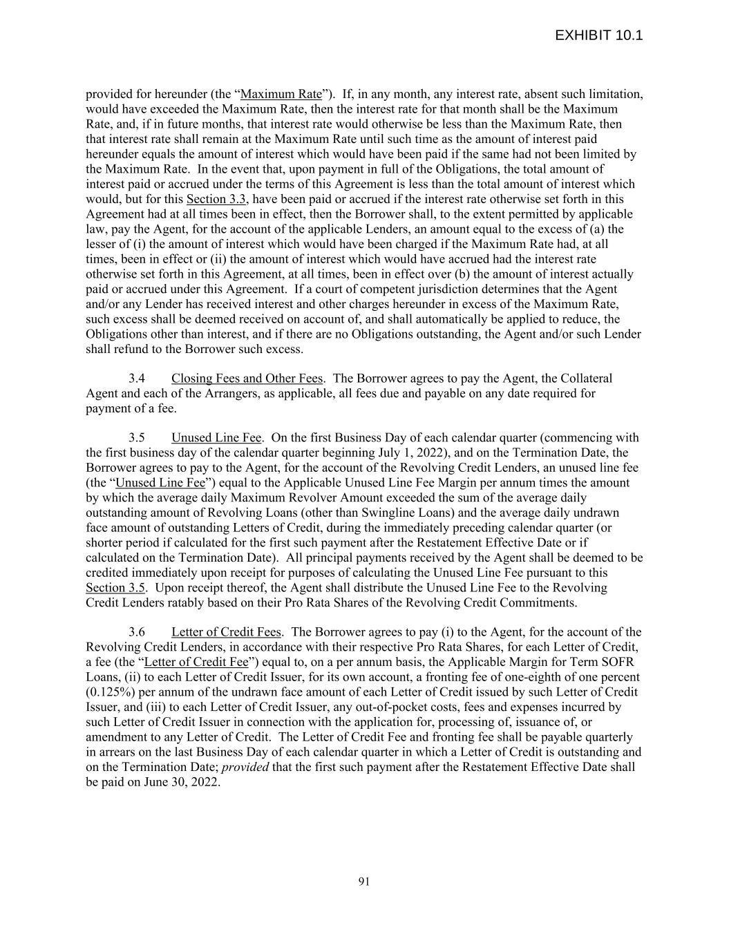 provided for hereunder (the “Maximum Rate”). If, in any month, any interest rate, absent such limitation, would have exceeded the Maximum Rate, then the interest rate for that month shall be the Maximum Rate, and, if in future months, that interest rate would otherwise be less than the Maximum Rate, then that interest rate shall remain at the Maximum Rate until such time as the amount of interest paid hereunder equals the amount of interest which would have been paid if the same had not been limited by the Maximum Rate. In the event that, upon payment in full of the Obligations, the total amount of interest paid or accrued under the terms of this Agreement is less than the total amount of interest which would, but for this Section 3.3, have been paid or accrued if the interest rate otherwise set forth in this Agreement had at all times been in effect, then the Borrower shall, to the extent permitted by applicable law, pay the Agent, for the account of the applicable Lenders, an amount equal to the excess of (a) the lesser of (i) the amount of interest which would have been charged if the Maximum Rate had, at all times, been in effect or (ii) the amount of interest which would have accrued had the interest rate otherwise set forth in this Agreement, at all times, been in effect over (b) the amount of interest actually paid or accrued under this Agreement. If a court of competent jurisdiction determines that the Agent and/or any Lender has received interest and other charges hereunder in excess of the Maximum Rate, such excess shall be deemed received on account of, and shall automatically be applied to reduce, the Obligations other than interest, and if there are no Obligations outstanding, the Agent and/or such Lender shall refund to the Borrower such excess. 3.4 Closing Fees and Other Fees. The Borrower agrees to pay the Agent, the Collateral Agent and each of the Arrangers, as applicable, all fees due and payable on any date required for payment of a fee. 3.5 Unused Line Fee. On the first Business Day of each calendar quarter (commencing with the first business day of the calendar quarter beginning July 1, 2022), and on the Termination Date, the Borrower agrees to pay to the Agent, for the account of the Revolving Credit Lenders, an unused line fee (the “Unused Line Fee”) equal to the Applicable Unused Line Fee Margin per annum times the amount by which the average daily Maximum Revolver Amount exceeded the sum of the average daily outstanding amount of Revolving Loans (other than Swingline Loans) and the average daily undrawn face amount of outstanding Letters of Credit, during the immediately preceding calendar quarter (or shorter period if calculated for the first such payment after the Restatement Effective Date or if calculated on the Termination Date). All principal payments received by the Agent shall be deemed to be credited immediately upon receipt for purposes of calculating the Unused Line Fee pursuant to this Section 3.5. Upon receipt thereof, the Agent shall distribute the Unused Line Fee to the Revolving Credit Lenders ratably based on their Pro Rata Shares of the Revolving Credit Commitments. 3.6 Letter of Credit Fees. The Borrower agrees to pay (i) to the Agent, for the account of the Revolving Credit Lenders, in accordance with their respective Pro Rata Shares, for each Letter of Credit, a fee (the “Letter of Credit Fee”) equal to, on a per annum basis, the Applicable Margin for Term SOFR Loans, (ii) to each Letter of Credit Issuer, for its own account, a fronting fee of one-eighth of one percent (0.125%) per annum of the undrawn face amount of each Letter of Credit issued by such Letter of Credit Issuer, and (iii) to each Letter of Credit Issuer, any out-of-pocket costs, fees and expenses incurred by such Letter of Credit Issuer in connection with the application for, processing of, issuance of, or amendment to any Letter of Credit. The Letter of Credit Fee and fronting fee shall be payable quarterly in arrears on the last Business Day of each calendar quarter in which a Letter of Credit is outstanding and on the Termination Date; provided that the first such payment after the Restatement Effective Date shall be paid on June 30, 2022. 91 EXHIBIT 10.1