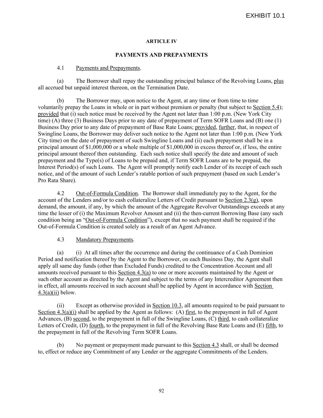 ARTICLE IV PAYMENTS AND PREPAYMENTS 4.1 Payments and Prepayments. (a) The Borrower shall repay the outstanding principal balance of the Revolving Loans, plus all accrued but unpaid interest thereon, on the Termination Date. (b) The Borrower may, upon notice to the Agent, at any time or from time to time voluntarily prepay the Loans in whole or in part without premium or penalty (but subject to Section 5.4); provided that (i) such notice must be received by the Agent not later than 1:00 p.m. (New York City time) (A) three (3) Business Days prior to any date of prepayment of Term SOFR Loans and (B) one (1) Business Day prior to any date of prepayment of Base Rate Loans; provided, further, that, in respect of Swingline Loans, the Borrower may deliver such notice to the Agent not later than 1:00 p.m. (New York City time) on the date of prepayment of such Swingline Loans and (ii) each prepayment shall be in a principal amount of $1,000,000 or a whole multiple of $1,000,000 in excess thereof or, if less, the entire principal amount thereof then outstanding. Each such notice shall specify the date and amount of such prepayment and the Type(s) of Loans to be prepaid and, if Term SOFR Loans are to be prepaid, the Interest Period(s) of such Loans. The Agent will promptly notify each Lender of its receipt of each such notice, and of the amount of such Lender’s ratable portion of such prepayment (based on such Lender’s Pro Rata Share). 4.2 Out-of-Formula Condition. The Borrower shall immediately pay to the Agent, for the account of the Lenders and/or to cash collateralize Letters of Credit pursuant to Section 2.3(g), upon demand, the amount, if any, by which the amount of the Aggregate Revolver Outstandings exceeds at any time the lesser of (i) the Maximum Revolver Amount and (ii) the then-current Borrowing Base (any such condition being an “Out-of-Formula Condition”), except that no such payment shall be required if the Out-of-Formula Condition is created solely as a result of an Agent Advance. 4.3 Mandatory Prepayments. (a) (i) At all times after the occurrence and during the continuance of a Cash Dominion Period and notification thereof by the Agent to the Borrower, on each Business Day, the Agent shall apply all same day funds (other than Excluded Funds) credited to the Concentration Account and all amounts received pursuant to this Section 4.3(a) to one or more accounts maintained by the Agent or such other account as directed by the Agent and subject to the terms of any Intercreditor Agreement then in effect, all amounts received in such account shall be applied by Agent in accordance with Section 4.3(a)(ii) below. (ii) Except as otherwise provided in Section 10.3, all amounts required to be paid pursuant to Section 4.3(a)(i) shall be applied by the Agent as follows: (A) first, to the prepayment in full of Agent Advances, (B) second, to the prepayment in full of the Swingline Loans, (C) third, to cash collateralize Letters of Credit, (D) fourth, to the prepayment in full of the Revolving Base Rate Loans and (E) fifth, to the prepayment in full of the Revolving Term SOFR Loans. (b) No payment or prepayment made pursuant to this Section 4.3 shall, or shall be deemed to, effect or reduce any Commitment of any Lender or the aggregate Commitments of the Lenders. 92 EXHIBIT 10.1