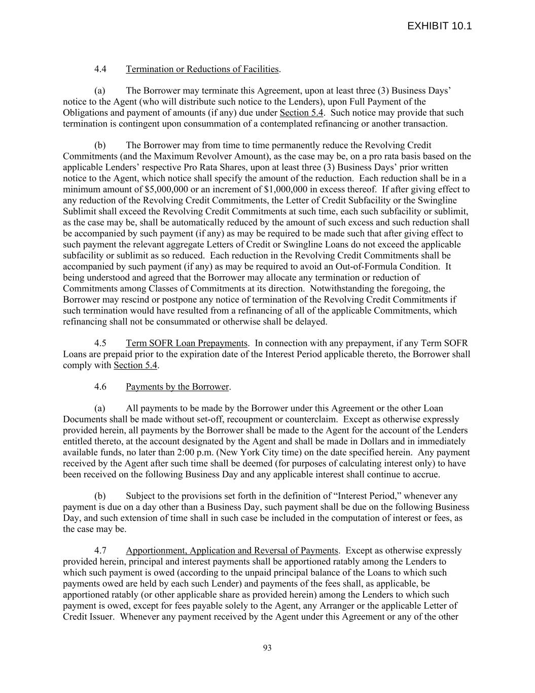 4.4 Termination or Reductions of Facilities. (a) The Borrower may terminate this Agreement, upon at least three (3) Business Days’ notice to the Agent (who will distribute such notice to the Lenders), upon Full Payment of the Obligations and payment of amounts (if any) due under Section 5.4. Such notice may provide that such termination is contingent upon consummation of a contemplated refinancing or another transaction. (b) The Borrower may from time to time permanently reduce the Revolving Credit Commitments (and the Maximum Revolver Amount), as the case may be, on a pro rata basis based on the applicable Lenders’ respective Pro Rata Shares, upon at least three (3) Business Days’ prior written notice to the Agent, which notice shall specify the amount of the reduction. Each reduction shall be in a minimum amount of $5,000,000 or an increment of $1,000,000 in excess thereof. If after giving effect to any reduction of the Revolving Credit Commitments, the Letter of Credit Subfacility or the Swingline Sublimit shall exceed the Revolving Credit Commitments at such time, each such subfacility or sublimit, as the case may be, shall be automatically reduced by the amount of such excess and such reduction shall be accompanied by such payment (if any) as may be required to be made such that after giving effect to such payment the relevant aggregate Letters of Credit or Swingline Loans do not exceed the applicable subfacility or sublimit as so reduced. Each reduction in the Revolving Credit Commitments shall be accompanied by such payment (if any) as may be required to avoid an Out-of-Formula Condition. It being understood and agreed that the Borrower may allocate any termination or reduction of Commitments among Classes of Commitments at its direction. Notwithstanding the foregoing, the Borrower may rescind or postpone any notice of termination of the Revolving Credit Commitments if such termination would have resulted from a refinancing of all of the applicable Commitments, which refinancing shall not be consummated or otherwise shall be delayed. 4.5 Term SOFR Loan Prepayments. In connection with any prepayment, if any Term SOFR Loans are prepaid prior to the expiration date of the Interest Period applicable thereto, the Borrower shall comply with Section 5.4. 4.6 Payments by the Borrower. (a) All payments to be made by the Borrower under this Agreement or the other Loan Documents shall be made without set-off, recoupment or counterclaim. Except as otherwise expressly provided herein, all payments by the Borrower shall be made to the Agent for the account of the Lenders entitled thereto, at the account designated by the Agent and shall be made in Dollars and in immediately available funds, no later than 2:00 p.m. (New York City time) on the date specified herein. Any payment received by the Agent after such time shall be deemed (for purposes of calculating interest only) to have been received on the following Business Day and any applicable interest shall continue to accrue. (b) Subject to the provisions set forth in the definition of “Interest Period,” whenever any payment is due on a day other than a Business Day, such payment shall be due on the following Business Day, and such extension of time shall in such case be included in the computation of interest or fees, as the case may be. 4.7 Apportionment, Application and Reversal of Payments. Except as otherwise expressly provided herein, principal and interest payments shall be apportioned ratably among the Lenders to which such payment is owed (according to the unpaid principal balance of the Loans to which such payments owed are held by each such Lender) and payments of the fees shall, as applicable, be apportioned ratably (or other applicable share as provided herein) among the Lenders to which such payment is owed, except for fees payable solely to the Agent, any Arranger or the applicable Letter of Credit Issuer. Whenever any payment received by the Agent under this Agreement or any of the other 93 EXHIBIT 10.1