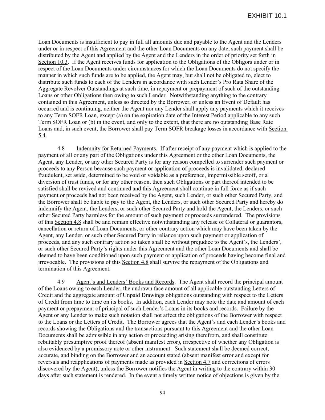 Loan Documents is insufficient to pay in full all amounts due and payable to the Agent and the Lenders under or in respect of this Agreement and the other Loan Documents on any date, such payment shall be distributed by the Agent and applied by the Agent and the Lenders in the order of priority set forth in Section 10.3. If the Agent receives funds for application to the Obligations of the Obligors under or in respect of the Loan Documents under circumstances for which the Loan Documents do not specify the manner in which such funds are to be applied, the Agent may, but shall not be obligated to, elect to distribute such funds to each of the Lenders in accordance with such Lender’s Pro Rata Share of the Aggregate Revolver Outstandings at such time, in repayment or prepayment of such of the outstanding Loans or other Obligations then owing to such Lender. Notwithstanding anything to the contrary contained in this Agreement, unless so directed by the Borrower, or unless an Event of Default has occurred and is continuing, neither the Agent nor any Lender shall apply any payments which it receives to any Term SOFR Loan, except (a) on the expiration date of the Interest Period applicable to any such Term SOFR Loan or (b) in the event, and only to the extent, that there are no outstanding Base Rate Loans and, in such event, the Borrower shall pay Term SOFR breakage losses in accordance with Section 5.4. 4.8 Indemnity for Returned Payments. If after receipt of any payment which is applied to the payment of all or any part of the Obligations under this Agreement or the other Loan Documents, the Agent, any Lender, or any other Secured Party is for any reason compelled to surrender such payment or proceeds to any Person because such payment or application of proceeds is invalidated, declared fraudulent, set aside, determined to be void or voidable as a preference, impermissible setoff, or a diversion of trust funds, or for any other reason, then such Obligations or part thereof intended to be satisfied shall be revived and continued and this Agreement shall continue in full force as if such payment or proceeds had not been received by the Agent, such Lender, or such other Secured Party, and the Borrower shall be liable to pay to the Agent, the Lenders, or such other Secured Party and hereby do indemnify the Agent, the Lenders, or such other Secured Party and hold the Agent, the Lenders, or such other Secured Party harmless for the amount of such payment or proceeds surrendered. The provisions of this Section 4.8 shall be and remain effective notwithstanding any release of Collateral or guarantors, cancellation or return of Loan Documents, or other contrary action which may have been taken by the Agent, any Lender, or such other Secured Party in reliance upon such payment or application of proceeds, and any such contrary action so taken shall be without prejudice to the Agent’s, the Lenders’, or such other Secured Party’s rights under this Agreement and the other Loan Documents and shall be deemed to have been conditioned upon such payment or application of proceeds having become final and irrevocable. The provisions of this Section 4.8 shall survive the repayment of the Obligations and termination of this Agreement. 4.9 Agent’s and Lenders’ Books and Records. The Agent shall record the principal amount of the Loans owing to each Lender, the undrawn face amount of all applicable outstanding Letters of Credit and the aggregate amount of Unpaid Drawings obligations outstanding with respect to the Letters of Credit from time to time on its books. In addition, each Lender may note the date and amount of each payment or prepayment of principal of such Lender’s Loans in its books and records. Failure by the Agent or any Lender to make such notation shall not affect the obligations of the Borrower with respect to the Loans or the Letters of Credit. The Borrower agrees that the Agent’s and each Lender’s books and records showing the Obligations and the transactions pursuant to this Agreement and the other Loan Documents shall be admissible in any action or proceeding arising therefrom, and shall constitute rebuttably presumptive proof thereof (absent manifest error), irrespective of whether any Obligation is also evidenced by a promissory note or other instrument. Such statement shall be deemed correct, accurate, and binding on the Borrower and an account stated (absent manifest error and except for reversals and reapplications of payments made as provided in Section 4.7 and corrections of errors discovered by the Agent), unless the Borrower notifies the Agent in writing to the contrary within 30 days after such statement is rendered. In the event a timely written notice of objections is given by the 94 EXHIBIT 10.1