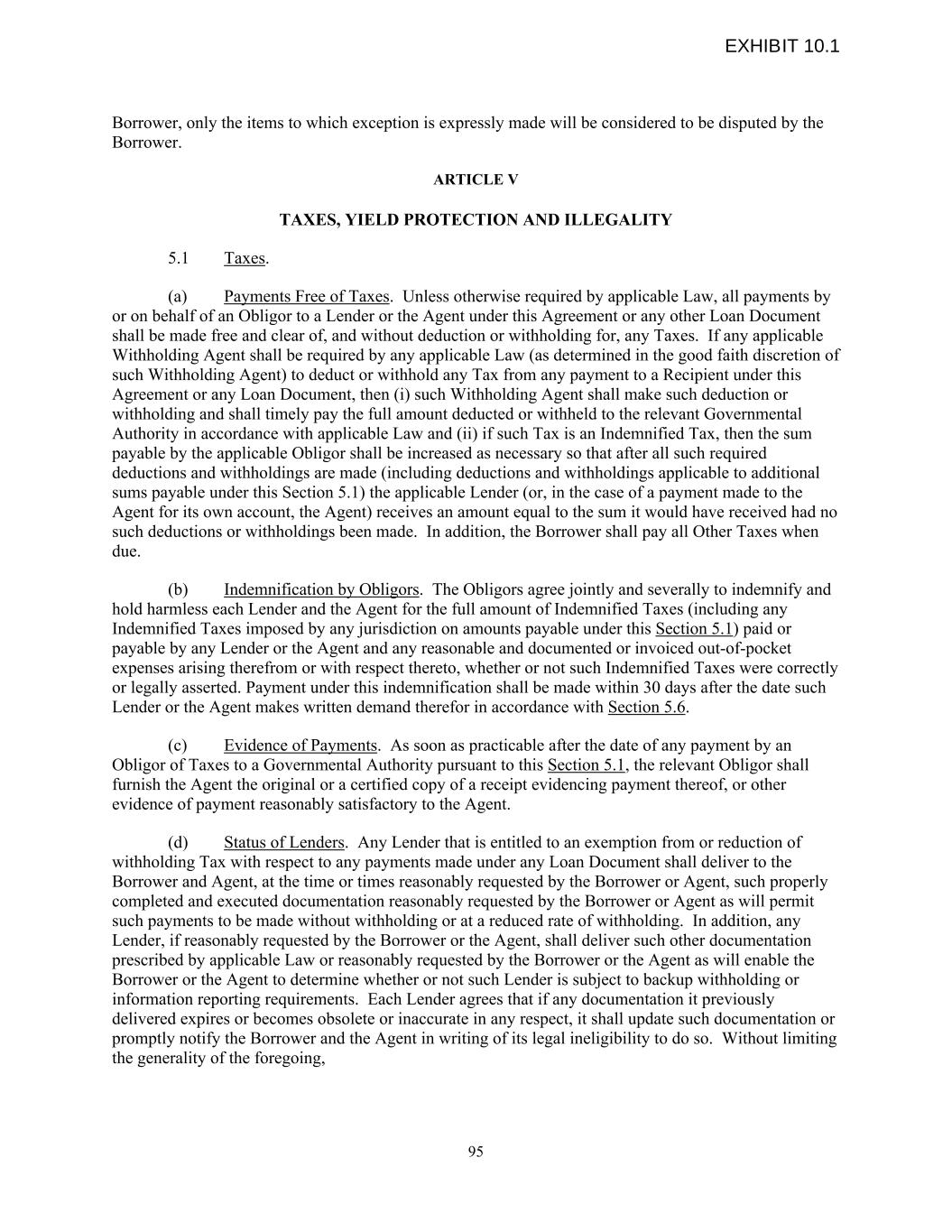 Borrower, only the items to which exception is expressly made will be considered to be disputed by the Borrower. ARTICLE V TAXES, YIELD PROTECTION AND ILLEGALITY 5.1 Taxes. (a) Payments Free of Taxes. Unless otherwise required by applicable Law, all payments by or on behalf of an Obligor to a Lender or the Agent under this Agreement or any other Loan Document shall be made free and clear of, and without deduction or withholding for, any Taxes. If any applicable Withholding Agent shall be required by any applicable Law (as determined in the good faith discretion of such Withholding Agent) to deduct or withhold any Tax from any payment to a Recipient under this Agreement or any Loan Document, then (i) such Withholding Agent shall make such deduction or withholding and shall timely pay the full amount deducted or withheld to the relevant Governmental Authority in accordance with applicable Law and (ii) if such Tax is an Indemnified Tax, then the sum payable by the applicable Obligor shall be increased as necessary so that after all such required deductions and withholdings are made (including deductions and withholdings applicable to additional sums payable under this Section 5.1) the applicable Lender (or, in the case of a payment made to the Agent for its own account, the Agent) receives an amount equal to the sum it would have received had no such deductions or withholdings been made. In addition, the Borrower shall pay all Other Taxes when due. (b) Indemnification by Obligors. The Obligors agree jointly and severally to indemnify and hold harmless each Lender and the Agent for the full amount of Indemnified Taxes (including any Indemnified Taxes imposed by any jurisdiction on amounts payable under this Section 5.1) paid or payable by any Lender or the Agent and any reasonable and documented or invoiced out-of-pocket expenses arising therefrom or with respect thereto, whether or not such Indemnified Taxes were correctly or legally asserted. Payment under this indemnification shall be made within 30 days after the date such Lender or the Agent makes written demand therefor in accordance with Section 5.6. (c) Evidence of Payments. As soon as practicable after the date of any payment by an Obligor of Taxes to a Governmental Authority pursuant to this Section 5.1, the relevant Obligor shall furnish the Agent the original or a certified copy of a receipt evidencing payment thereof, or other evidence of payment reasonably satisfactory to the Agent. (d) Status of Lenders. Any Lender that is entitled to an exemption from or reduction of withholding Tax with respect to any payments made under any Loan Document shall deliver to the Borrower and Agent, at the time or times reasonably requested by the Borrower or Agent, such properly completed and executed documentation reasonably requested by the Borrower or Agent as will permit such payments to be made without withholding or at a reduced rate of withholding. In addition, any Lender, if reasonably requested by the Borrower or the Agent, shall deliver such other documentation prescribed by applicable Law or reasonably requested by the Borrower or the Agent as will enable the Borrower or the Agent to determine whether or not such Lender is subject to backup withholding or information reporting requirements. Each Lender agrees that if any documentation it previously delivered expires or becomes obsolete or inaccurate in any respect, it shall update such documentation or promptly notify the Borrower and the Agent in writing of its legal ineligibility to do so. Without limiting the generality of the foregoing, 95 EXHIBIT 10.1