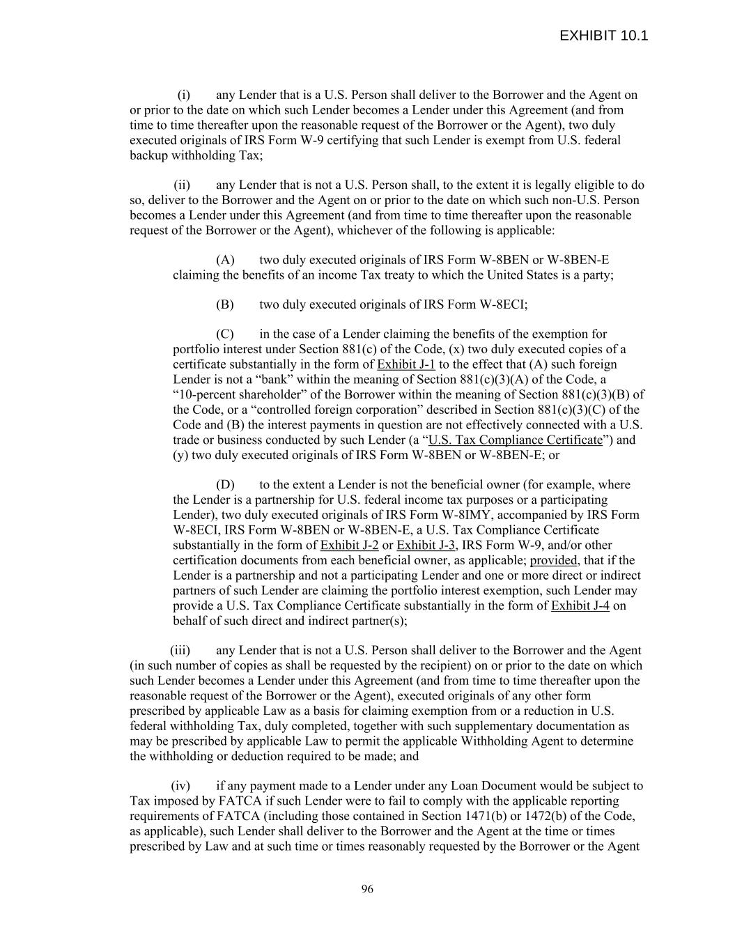 (i) any Lender that is a U.S. Person shall deliver to the Borrower and the Agent on or prior to the date on which such Lender becomes a Lender under this Agreement (and from time to time thereafter upon the reasonable request of the Borrower or the Agent), two duly executed originals of IRS Form W-9 certifying that such Lender is exempt from U.S. federal backup withholding Tax; (ii) any Lender that is not a U.S. Person shall, to the extent it is legally eligible to do so, deliver to the Borrower and the Agent on or prior to the date on which such non-U.S. Person becomes a Lender under this Agreement (and from time to time thereafter upon the reasonable request of the Borrower or the Agent), whichever of the following is applicable: (A) two duly executed originals of IRS Form W-8BEN or W-8BEN-E claiming the benefits of an income Tax treaty to which the United States is a party; (B) two duly executed originals of IRS Form W-8ECI; (C) in the case of a Lender claiming the benefits of the exemption for portfolio interest under Section 881(c) of the Code, (x) two duly executed copies of a certificate substantially in the form of Exhibit J-1 to the effect that (A) such foreign Lender is not a “bank” within the meaning of Section 881(c)(3)(A) of the Code, a “10-percent shareholder” of the Borrower within the meaning of Section 881(c)(3)(B) of the Code, or a “controlled foreign corporation” described in Section 881(c)(3)(C) of the Code and (B) the interest payments in question are not effectively connected with a U.S. trade or business conducted by such Lender (a “U.S. Tax Compliance Certificate”) and (y) two duly executed originals of IRS Form W-8BEN or W-8BEN-E; or (D) to the extent a Lender is not the beneficial owner (for example, where the Lender is a partnership for U.S. federal income tax purposes or a participating Lender), two duly executed originals of IRS Form W-8IMY, accompanied by IRS Form W-8ECI, IRS Form W-8BEN or W-8BEN-E, a U.S. Tax Compliance Certificate substantially in the form of Exhibit J-2 or Exhibit J-3, IRS Form W-9, and/or other certification documents from each beneficial owner, as applicable; provided, that if the Lender is a partnership and not a participating Lender and one or more direct or indirect partners of such Lender are claiming the portfolio interest exemption, such Lender may provide a U.S. Tax Compliance Certificate substantially in the form of Exhibit J-4 on behalf of such direct and indirect partner(s); (iii) any Lender that is not a U.S. Person shall deliver to the Borrower and the Agent (in such number of copies as shall be requested by the recipient) on or prior to the date on which such Lender becomes a Lender under this Agreement (and from time to time thereafter upon the reasonable request of the Borrower or the Agent), executed originals of any other form prescribed by applicable Law as a basis for claiming exemption from or a reduction in U.S. federal withholding Tax, duly completed, together with such supplementary documentation as may be prescribed by applicable Law to permit the applicable Withholding Agent to determine the withholding or deduction required to be made; and (iv) if any payment made to a Lender under any Loan Document would be subject to Tax imposed by FATCA if such Lender were to fail to comply with the applicable reporting requirements of FATCA (including those contained in Section 1471(b) or 1472(b) of the Code, as applicable), such Lender shall deliver to the Borrower and the Agent at the time or times prescribed by Law and at such time or times reasonably requested by the Borrower or the Agent 96 EXHIBIT 10.1