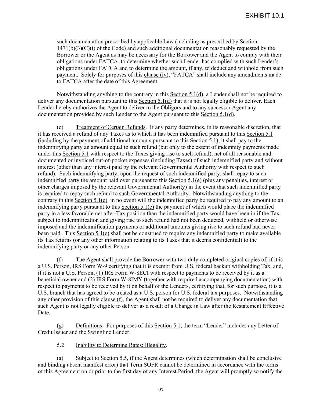 such documentation prescribed by applicable Law (including as prescribed by Section 1471(b)(3)(C)(i) of the Code) and such additional documentation reasonably requested by the Borrower or the Agent as may be necessary for the Borrower and the Agent to comply with their obligations under FATCA, to determine whether such Lender has complied with such Lender’s obligations under FATCA and to determine the amount, if any, to deduct and withhold from such payment. Solely for purposes of this clause (iv), “FATCA” shall include any amendments made to FATCA after the date of this Agreement. Notwithstanding anything to the contrary in this Section 5.1(d), a Lender shall not be required to deliver any documentation pursuant to this Section 5.1(d) that it is not legally eligible to deliver. Each Lender hereby authorizes the Agent to deliver to the Obligors and to any successor Agent any documentation provided by such Lender to the Agent pursuant to this Section 5.1(d). (e) Treatment of Certain Refunds. If any party determines, in its reasonable discretion, that it has received a refund of any Taxes as to which it has been indemnified pursuant to this Section 5.1 (including by the payment of additional amounts pursuant to this Section 5.1), it shall pay to the indemnifying party an amount equal to such refund (but only to the extent of indemnity payments made under this Section 5.1 with respect to the Taxes giving rise to such refund), net of all reasonable and documented or invoiced out-of-pocket expenses (including Taxes) of such indemnified party and without interest (other than any interest paid by the relevant Governmental Authority with respect to such refund). Such indemnifying party, upon the request of such indemnified party, shall repay to such indemnified party the amount paid over pursuant to this Section 5.1(e) (plus any penalties, interest or other charges imposed by the relevant Governmental Authority) in the event that such indemnified party is required to repay such refund to such Governmental Authority. Notwithstanding anything to the contrary in this Section 5.1(e), in no event will the indemnified party be required to pay any amount to an indemnifying party pursuant to this Section 5.1(e) the payment of which would place the indemnified party in a less favorable net after-Tax position than the indemnified party would have been in if the Tax subject to indemnification and giving rise to such refund had not been deducted, withheld or otherwise imposed and the indemnification payments or additional amounts giving rise to such refund had never been paid. This Section 5.1(e) shall not be construed to require any indemnified party to make available its Tax returns (or any other information relating to its Taxes that it deems confidential) to the indemnifying party or any other Person. (f) The Agent shall provide the Borrower with two duly completed original copies of, if it is a U.S. Person, IRS Form W-9 certifying that it is exempt from U.S. federal backup withholding Tax, and, if it is not a U.S. Person, (1) IRS Form W-8ECI with respect to payments to be received by it as a beneficial owner and (2) IRS Form W-8IMY (together with required accompanying documentation) with respect to payments to be received by it on behalf of the Lenders, certifying that, for such purpose, it is a U.S. branch that has agreed to be treated as a U.S. person for U.S. federal tax purposes. Notwithstanding any other provision of this clause (f), the Agent shall not be required to deliver any documentation that such Agent is not legally eligible to deliver as a result of a Change in Law after the Restatement Effective Date. (g) Definitions. For purposes of this Section 5.1, the term “Lender” includes any Letter of Credit Issuer and the Swingline Lender. 5.2 Inability to Determine Rates; Illegality. (a) Subject to Section 5.5, if the Agent determines (which determination shall be conclusive and binding absent manifest error) that Term SOFR cannot be determined in accordance with the terms of this Agreement on or prior to the first day of any Interest Period, the Agent will promptly so notify the 97 EXHIBIT 10.1