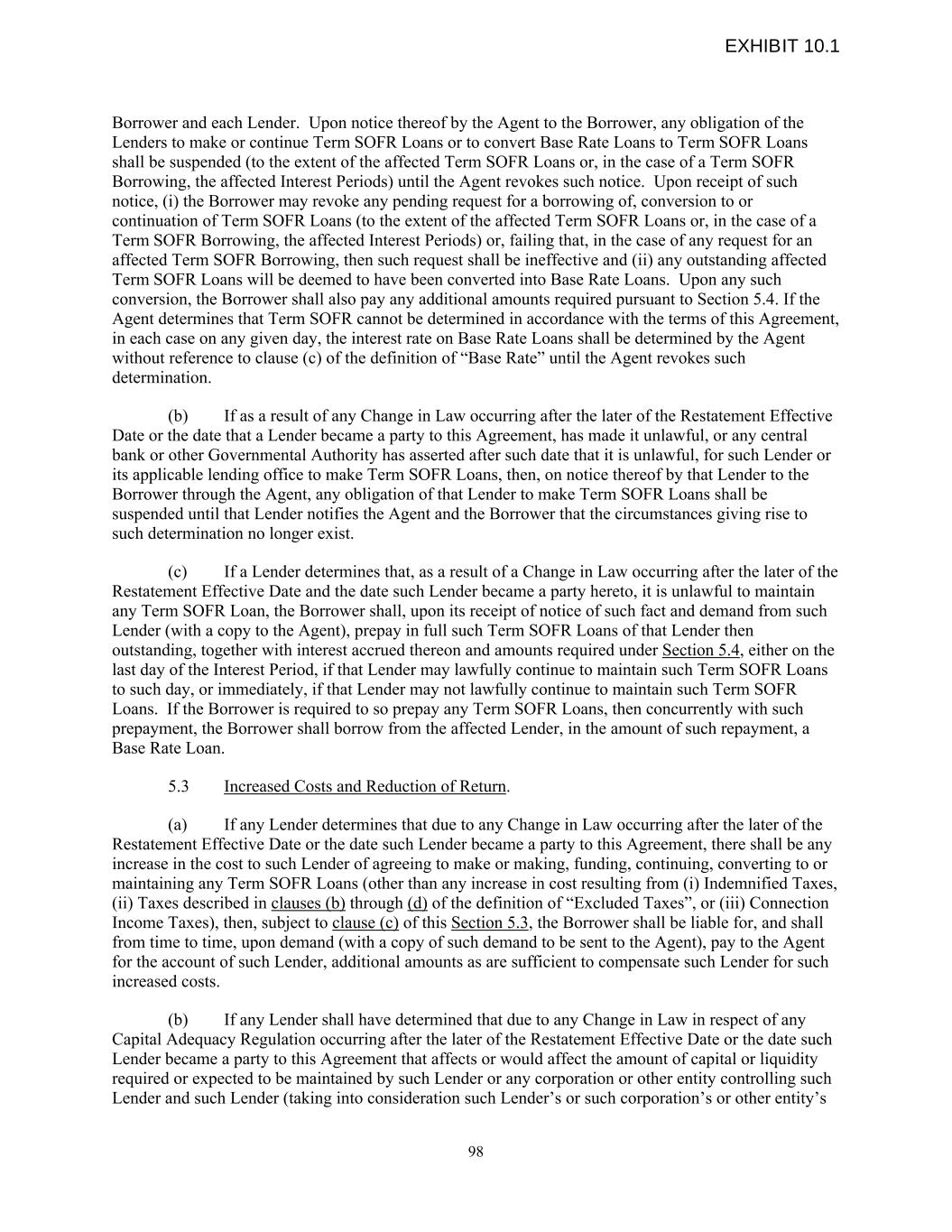 Borrower and each Lender. Upon notice thereof by the Agent to the Borrower, any obligation of the Lenders to make or continue Term SOFR Loans or to convert Base Rate Loans to Term SOFR Loans shall be suspended (to the extent of the affected Term SOFR Loans or, in the case of a Term SOFR Borrowing, the affected Interest Periods) until the Agent revokes such notice. Upon receipt of such notice, (i) the Borrower may revoke any pending request for a borrowing of, conversion to or continuation of Term SOFR Loans (to the extent of the affected Term SOFR Loans or, in the case of a Term SOFR Borrowing, the affected Interest Periods) or, failing that, in the case of any request for an affected Term SOFR Borrowing, then such request shall be ineffective and (ii) any outstanding affected Term SOFR Loans will be deemed to have been converted into Base Rate Loans. Upon any such conversion, the Borrower shall also pay any additional amounts required pursuant to Section 5.4. If the Agent determines that Term SOFR cannot be determined in accordance with the terms of this Agreement, in each case on any given day, the interest rate on Base Rate Loans shall be determined by the Agent without reference to clause (c) of the definition of “Base Rate” until the Agent revokes such determination. (b) If as a result of any Change in Law occurring after the later of the Restatement Effective Date or the date that a Lender became a party to this Agreement, has made it unlawful, or any central bank or other Governmental Authority has asserted after such date that it is unlawful, for such Lender or its applicable lending office to make Term SOFR Loans, then, on notice thereof by that Lender to the Borrower through the Agent, any obligation of that Lender to make Term SOFR Loans shall be suspended until that Lender notifies the Agent and the Borrower that the circumstances giving rise to such determination no longer exist. (c) If a Lender determines that, as a result of a Change in Law occurring after the later of the Restatement Effective Date and the date such Lender became a party hereto, it is unlawful to maintain any Term SOFR Loan, the Borrower shall, upon its receipt of notice of such fact and demand from such Lender (with a copy to the Agent), prepay in full such Term SOFR Loans of that Lender then outstanding, together with interest accrued thereon and amounts required under Section 5.4, either on the last day of the Interest Period, if that Lender may lawfully continue to maintain such Term SOFR Loans to such day, or immediately, if that Lender may not lawfully continue to maintain such Term SOFR Loans. If the Borrower is required to so prepay any Term SOFR Loans, then concurrently with such prepayment, the Borrower shall borrow from the affected Lender, in the amount of such repayment, a Base Rate Loan. 5.3 Increased Costs and Reduction of Return. (a) If any Lender determines that due to any Change in Law occurring after the later of the Restatement Effective Date or the date such Lender became a party to this Agreement, there shall be any increase in the cost to such Lender of agreeing to make or making, funding, continuing, converting to or maintaining any Term SOFR Loans (other than any increase in cost resulting from (i) Indemnified Taxes, (ii) Taxes described in clauses (b) through (d) of the definition of “Excluded Taxes”, or (iii) Connection Income Taxes), then, subject to clause (c) of this Section 5.3, the Borrower shall be liable for, and shall from time to time, upon demand (with a copy of such demand to be sent to the Agent), pay to the Agent for the account of such Lender, additional amounts as are sufficient to compensate such Lender for such increased costs. (b) If any Lender shall have determined that due to any Change in Law in respect of any Capital Adequacy Regulation occurring after the later of the Restatement Effective Date or the date such Lender became a party to this Agreement that affects or would affect the amount of capital or liquidity required or expected to be maintained by such Lender or any corporation or other entity controlling such Lender and such Lender (taking into consideration such Lender’s or such corporation’s or other entity’s 98 EXHIBIT 10.1