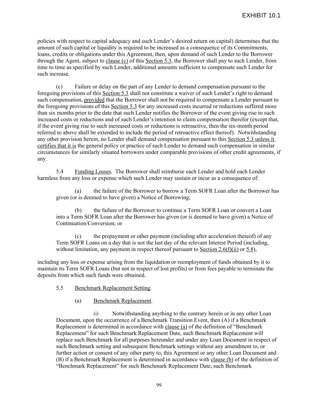policies with respect to capital adequacy and such Lender’s desired return on capital) determines that the amount of such capital or liquidity is required to be increased as a consequence of its Commitments, loans, credits or obligations under this Agreement, then, upon demand of such Lender to the Borrower through the Agent, subject to clause (c) of this Section 5.3, the Borrower shall pay to such Lender, from time to time as specified by such Lender, additional amounts sufficient to compensate such Lender for such increase. (c) Failure or delay on the part of any Lender to demand compensation pursuant to the foregoing provisions of this Section 5.3 shall not constitute a waiver of such Lender’s right to demand such compensation, provided that the Borrower shall not be required to compensate a Lender pursuant to the foregoing provisions of this Section 5.3 for any increased costs incurred or reductions suffered more than six months prior to the date that such Lender notifies the Borrower of the event giving rise to such increased costs or reductions and of such Lender’s intention to claim compensation therefor (except that, if the event giving rise to such increased costs or reductions is retroactive, then the six-month period referred to above shall be extended to include the period of retroactive effect thereof). Notwithstanding any other provision herein, no Lender shall demand compensation pursuant to this Section 5.3 unless it certifies that it is the general policy or practice of such Lender to demand such compensation in similar circumstances for similarly situated borrowers under comparable provisions of other credit agreements, if any. 5.4 Funding Losses. The Borrower shall reimburse each Lender and hold each Lender harmless from any loss or expense which such Lender may sustain or incur as a consequence of: (a) the failure of the Borrower to borrow a Term SOFR Loan after the Borrower has given (or is deemed to have given) a Notice of Borrowing; (b) the failure of the Borrower to continue a Term SOFR Loan or convert a Loan into a Term SOFR Loan after the Borrower has given (or is deemed to have given) a Notice of Continuation/Conversion; or (c) the prepayment or other payment (including after acceleration thereof) of any Term SOFR Loans on a day that is not the last day of the relevant Interest Period (including, without limitation, any payment in respect thereof pursuant to Section 2.6(f)(ii) or 5.8), including any loss or expense arising from the liquidation or reemployment of funds obtained by it to maintain its Term SOFR Loans (but not in respect of lost profits) or from fees payable to terminate the deposits from which such funds were obtained. 5.5 Benchmark Replacement Setting. (a) Benchmark Replacement. (i) Notwithstanding anything to the contrary herein or in any other Loan Document, upon the occurrence of a Benchmark Transition Event, then (A) if a Benchmark Replacement is determined in accordance with clause (a) of the definition of “Benchmark Replacement” for such Benchmark Replacement Date, such Benchmark Replacement will replace such Benchmark for all purposes hereunder and under any Loan Document in respect of such Benchmark setting and subsequent Benchmark settings without any amendment to, or further action or consent of any other party to, this Agreement or any other Loan Document and (B) if a Benchmark Replacement is determined in accordance with clause (b) of the definition of “Benchmark Replacement” for such Benchmark Replacement Date, such Benchmark 99 EXHIBIT 10.1