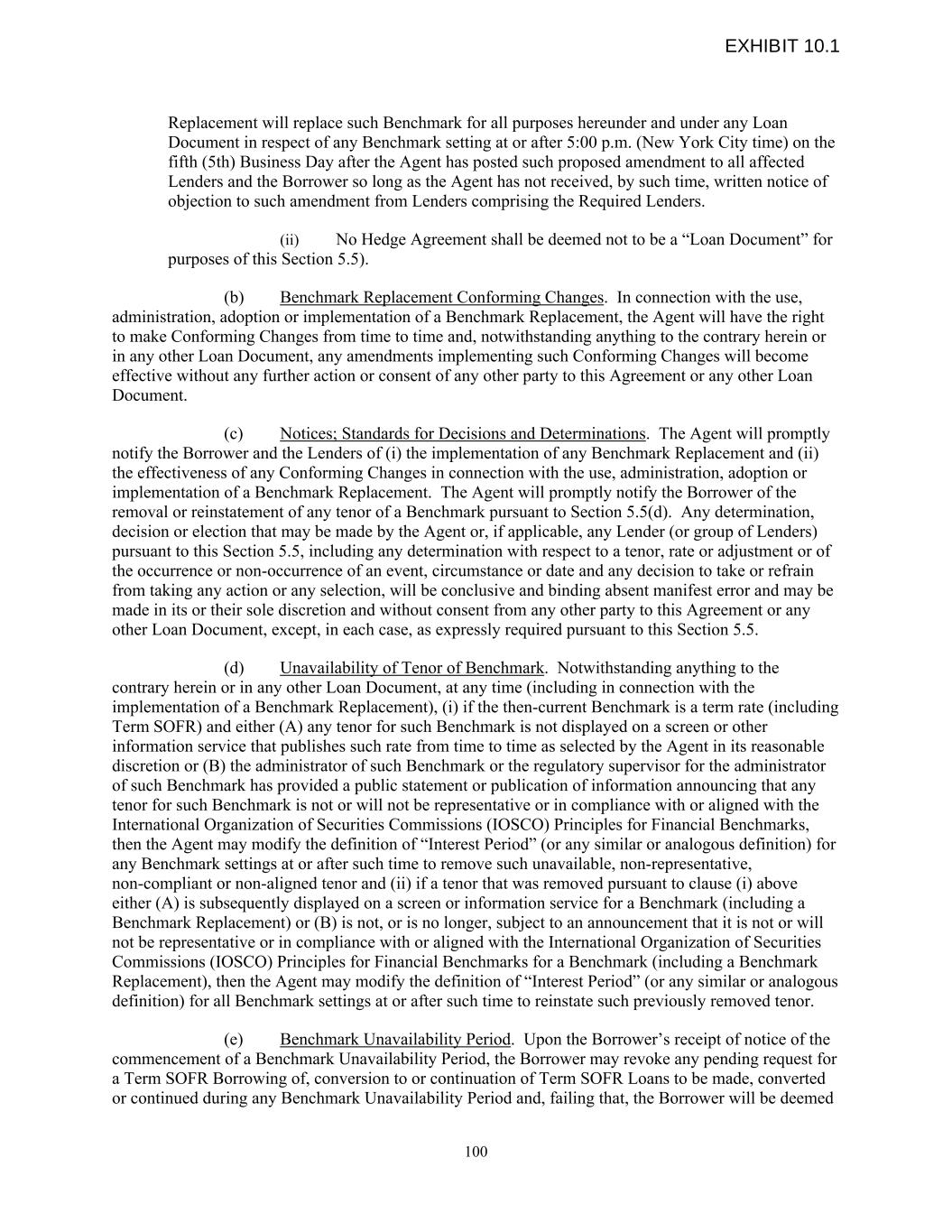 Replacement will replace such Benchmark for all purposes hereunder and under any Loan Document in respect of any Benchmark setting at or after 5:00 p.m. (New York City time) on the fifth (5th) Business Day after the Agent has posted such proposed amendment to all affected Lenders and the Borrower so long as the Agent has not received, by such time, written notice of objection to such amendment from Lenders comprising the Required Lenders. (ii) No Hedge Agreement shall be deemed not to be a “Loan Document” for purposes of this Section 5.5). (b) Benchmark Replacement Conforming Changes. In connection with the use, administration, adoption or implementation of a Benchmark Replacement, the Agent will have the right to make Conforming Changes from time to time and, notwithstanding anything to the contrary herein or in any other Loan Document, any amendments implementing such Conforming Changes will become effective without any further action or consent of any other party to this Agreement or any other Loan Document. (c) Notices; Standards for Decisions and Determinations. The Agent will promptly notify the Borrower and the Lenders of (i) the implementation of any Benchmark Replacement and (ii) the effectiveness of any Conforming Changes in connection with the use, administration, adoption or implementation of a Benchmark Replacement. The Agent will promptly notify the Borrower of the removal or reinstatement of any tenor of a Benchmark pursuant to Section 5.5(d). Any determination, decision or election that may be made by the Agent or, if applicable, any Lender (or group of Lenders) pursuant to this Section 5.5, including any determination with respect to a tenor, rate or adjustment or of the occurrence or non-occurrence of an event, circumstance or date and any decision to take or refrain from taking any action or any selection, will be conclusive and binding absent manifest error and may be made in its or their sole discretion and without consent from any other party to this Agreement or any other Loan Document, except, in each case, as expressly required pursuant to this Section 5.5. (d) Unavailability of Tenor of Benchmark. Notwithstanding anything to the contrary herein or in any other Loan Document, at any time (including in connection with the implementation of a Benchmark Replacement), (i) if the then-current Benchmark is a term rate (including Term SOFR) and either (A) any tenor for such Benchmark is not displayed on a screen or other information service that publishes such rate from time to time as selected by the Agent in its reasonable discretion or (B) the administrator of such Benchmark or the regulatory supervisor for the administrator of such Benchmark has provided a public statement or publication of information announcing that any tenor for such Benchmark is not or will not be representative or in compliance with or aligned with the International Organization of Securities Commissions (IOSCO) Principles for Financial Benchmarks, then the Agent may modify the definition of “Interest Period” (or any similar or analogous definition) for any Benchmark settings at or after such time to remove such unavailable, non-representative, non-compliant or non-aligned tenor and (ii) if a tenor that was removed pursuant to clause (i) above either (A) is subsequently displayed on a screen or information service for a Benchmark (including a Benchmark Replacement) or (B) is not, or is no longer, subject to an announcement that it is not or will not be representative or in compliance with or aligned with the International Organization of Securities Commissions (IOSCO) Principles for Financial Benchmarks for a Benchmark (including a Benchmark Replacement), then the Agent may modify the definition of “Interest Period” (or any similar or analogous definition) for all Benchmark settings at or after such time to reinstate such previously removed tenor. (e) Benchmark Unavailability Period. Upon the Borrower’s receipt of notice of the commencement of a Benchmark Unavailability Period, the Borrower may revoke any pending request for a Term SOFR Borrowing of, conversion to or continuation of Term SOFR Loans to be made, converted or continued during any Benchmark Unavailability Period and, failing that, the Borrower will be deemed 100 EXHIBIT 10.1