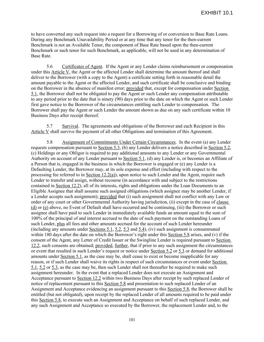 to have converted any such request into a request for a Borrowing of or conversion to Base Rate Loans. During any Benchmark Unavailability Period or at any time that any tenor for the then-current Benchmark is not an Available Tenor, the component of Base Rate based upon the then-current Benchmark or such tenor for such Benchmark, as applicable, will not be used in any determination of Base Rate. 5.6 Certificates of Agent. If the Agent or any Lender claims reimbursement or compensation under this Article V, the Agent or the affected Lender shall determine the amount thereof and shall deliver to the Borrower (with a copy to the Agent) a certificate setting forth in reasonable detail the amount payable to the Agent or the affected Lender, and such certificate shall be conclusive and binding on the Borrower in the absence of manifest error; provided that, except for compensation under Section 5.1, the Borrower shall not be obligated to pay the Agent or such Lender any compensation attributable to any period prior to the date that is ninety (90) days prior to the date on which the Agent or such Lender first gave notice to the Borrower of the circumstances entitling such Lender to compensation. The Borrower shall pay the Agent or such Lender the amount shown as due on any such certificate within 10 Business Days after receipt thereof. 5.7 Survival. The agreements and obligations of the Borrower and each Recipient in this Article V shall survive the payment of all other Obligations and termination of this Agreement. 5.8 Assignment of Commitments Under Certain Circumstances. In the event (a) any Lender requests compensation pursuant to Section 5.3, (b) any Lender delivers a notice described in Section 5.2, (c) Holdings or any Obligor is required to pay additional amounts to any Lender or any Governmental Authority on account of any Lender pursuant to Section 5.1, (d) any Lender is, or becomes an Affiliate of a Person that is, engaged in the business in which the Borrower is engaged or (e) any Lender is a Defaulting Lender, the Borrower may, at its sole expense and effort (including with respect to the processing fee referred to in Section 12.2(a)), upon notice to such Lender and the Agent, require such Lender to transfer and assign, without recourse (in accordance with and subject to the restrictions contained in Section 12.2), all of its interests, rights and obligations under the Loan Documents to an Eligible Assignee that shall assume such assigned obligations (which assignee may be another Lender, if a Lender accepts such assignment); provided that (i) such assignment shall not conflict with any Law or order of any court or other Governmental Authority having jurisdiction, (ii) except in the case of clause (d) or (e) above, no Event of Default shall have occurred and be continuing, (iii) the Borrower or such assignee shall have paid to such Lender in immediately available funds an amount equal to the sum of 100% of the principal of and interest accrued to the date of such payment on the outstanding Loans of such Lender, plus all fees and other amounts accrued for the account of such Lender hereunder (including any amounts under Sections 5.1, 5.2, 5.3 and 5.4), (iv) such assignment is consummated within 180 days after the date on which the Borrower’s right under this Section 5.8 arises, and (v) if the consent of the Agent, any Letter of Credit Issuer or the Swingline Lender is required pursuant to Section 12.2, such consents are obtained; provided, further, that if prior to any such assignment the circumstances or event that resulted in such Lender’s request or notice under Section 5.2 or 5.3 or demand for additional amounts under Section 5.1, as the case may be, shall cease to exist or become inapplicable for any reason, or if such Lender shall waive its rights in respect of such circumstances or event under Section 5.1, 5.2 or 5.3, as the case may be, then such Lender shall not thereafter be required to make such assignment hereunder. In the event that a replaced Lender does not execute an Assignment and Acceptance pursuant to Section 12.2 within two Business Days after receipt by such replaced Lender of notice of replacement pursuant to this Section 5.8 and presentation to such replaced Lender of an Assignment and Acceptance evidencing an assignment pursuant to this Section 5.8, the Borrower shall be entitled (but not obligated), upon receipt by the replaced Lender of all amounts required to be paid under this Section 5.8, to execute such an Assignment and Acceptance on behalf of such replaced Lender, and any such Assignment and Acceptance so executed by the Borrower, the replacement Lender and, to the 101 EXHIBIT 10.1