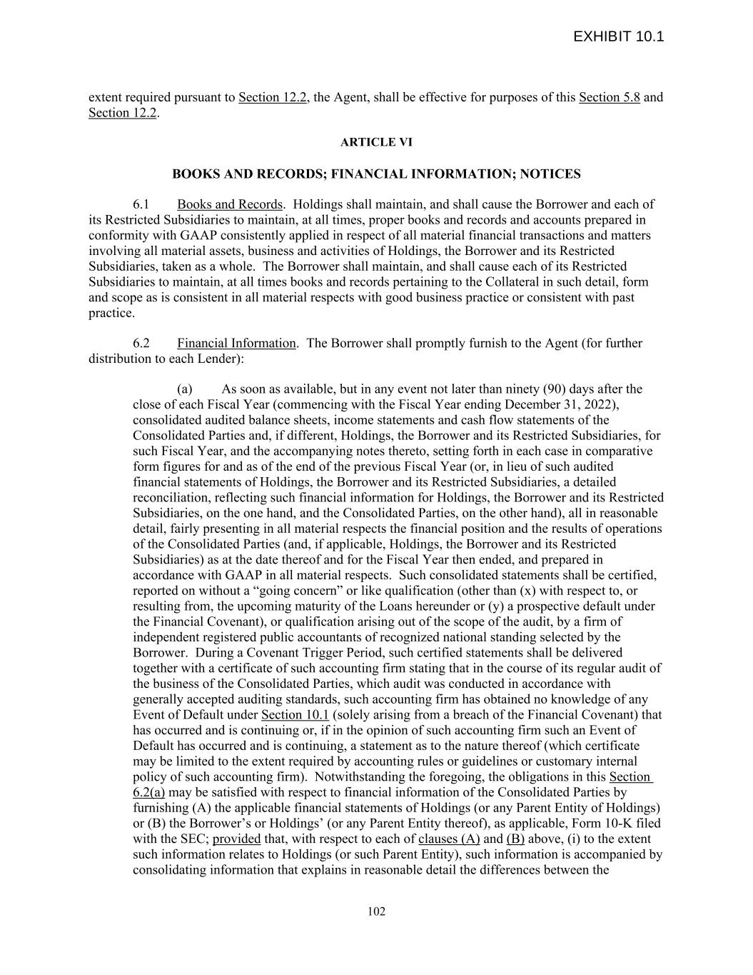 extent required pursuant to Section 12.2, the Agent, shall be effective for purposes of this Section 5.8 and Section 12.2. ARTICLE VI BOOKS AND RECORDS; FINANCIAL INFORMATION; NOTICES 6.1 Books and Records. Holdings shall maintain, and shall cause the Borrower and each of its Restricted Subsidiaries to maintain, at all times, proper books and records and accounts prepared in conformity with GAAP consistently applied in respect of all material financial transactions and matters involving all material assets, business and activities of Holdings, the Borrower and its Restricted Subsidiaries, taken as a whole. The Borrower shall maintain, and shall cause each of its Restricted Subsidiaries to maintain, at all times books and records pertaining to the Collateral in such detail, form and scope as is consistent in all material respects with good business practice or consistent with past practice. 6.2 Financial Information. The Borrower shall promptly furnish to the Agent (for further distribution to each Lender): (a) As soon as available, but in any event not later than ninety (90) days after the close of each Fiscal Year (commencing with the Fiscal Year ending December 31, 2022), consolidated audited balance sheets, income statements and cash flow statements of the Consolidated Parties and, if different, Holdings, the Borrower and its Restricted Subsidiaries, for such Fiscal Year, and the accompanying notes thereto, setting forth in each case in comparative form figures for and as of the end of the previous Fiscal Year (or, in lieu of such audited financial statements of Holdings, the Borrower and its Restricted Subsidiaries, a detailed reconciliation, reflecting such financial information for Holdings, the Borrower and its Restricted Subsidiaries, on the one hand, and the Consolidated Parties, on the other hand), all in reasonable detail, fairly presenting in all material respects the financial position and the results of operations of the Consolidated Parties (and, if applicable, Holdings, the Borrower and its Restricted Subsidiaries) as at the date thereof and for the Fiscal Year then ended, and prepared in accordance with GAAP in all material respects. Such consolidated statements shall be certified, reported on without a “going concern” or like qualification (other than (x) with respect to, or resulting from, the upcoming maturity of the Loans hereunder or (y) a prospective default under the Financial Covenant), or qualification arising out of the scope of the audit, by a firm of independent registered public accountants of recognized national standing selected by the Borrower. During a Covenant Trigger Period, such certified statements shall be delivered together with a certificate of such accounting firm stating that in the course of its regular audit of the business of the Consolidated Parties, which audit was conducted in accordance with generally accepted auditing standards, such accounting firm has obtained no knowledge of any Event of Default under Section 10.1 (solely arising from a breach of the Financial Covenant) that has occurred and is continuing or, if in the opinion of such accounting firm such an Event of Default has occurred and is continuing, a statement as to the nature thereof (which certificate may be limited to the extent required by accounting rules or guidelines or customary internal policy of such accounting firm). Notwithstanding the foregoing, the obligations in this Section 6.2(a) may be satisfied with respect to financial information of the Consolidated Parties by furnishing (A) the applicable financial statements of Holdings (or any Parent Entity of Holdings) or (B) the Borrower’s or Holdings’ (or any Parent Entity thereof), as applicable, Form 10-K filed with the SEC; provided that, with respect to each of clauses (A) and (B) above, (i) to the extent such information relates to Holdings (or such Parent Entity), such information is accompanied by consolidating information that explains in reasonable detail the differences between the 102 EXHIBIT 10.1