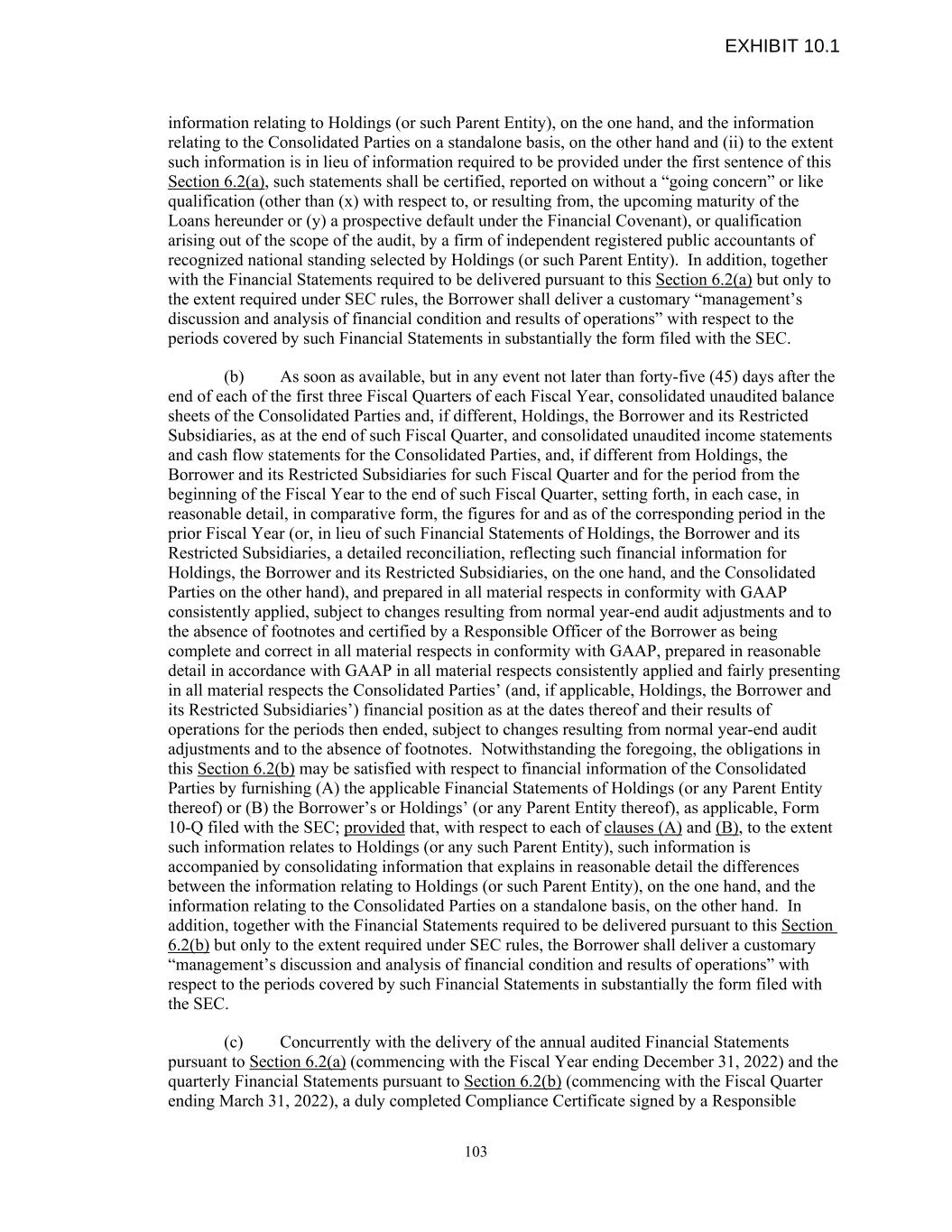 information relating to Holdings (or such Parent Entity), on the one hand, and the information relating to the Consolidated Parties on a standalone basis, on the other hand and (ii) to the extent such information is in lieu of information required to be provided under the first sentence of this Section 6.2(a), such statements shall be certified, reported on without a “going concern” or like qualification (other than (x) with respect to, or resulting from, the upcoming maturity of the Loans hereunder or (y) a prospective default under the Financial Covenant), or qualification arising out of the scope of the audit, by a firm of independent registered public accountants of recognized national standing selected by Holdings (or such Parent Entity). In addition, together with the Financial Statements required to be delivered pursuant to this Section 6.2(a) but only to the extent required under SEC rules, the Borrower shall deliver a customary “management’s discussion and analysis of financial condition and results of operations” with respect to the periods covered by such Financial Statements in substantially the form filed with the SEC. (b) As soon as available, but in any event not later than forty-five (45) days after the end of each of the first three Fiscal Quarters of each Fiscal Year, consolidated unaudited balance sheets of the Consolidated Parties and, if different, Holdings, the Borrower and its Restricted Subsidiaries, as at the end of such Fiscal Quarter, and consolidated unaudited income statements and cash flow statements for the Consolidated Parties, and, if different from Holdings, the Borrower and its Restricted Subsidiaries for such Fiscal Quarter and for the period from the beginning of the Fiscal Year to the end of such Fiscal Quarter, setting forth, in each case, in reasonable detail, in comparative form, the figures for and as of the corresponding period in the prior Fiscal Year (or, in lieu of such Financial Statements of Holdings, the Borrower and its Restricted Subsidiaries, a detailed reconciliation, reflecting such financial information for Holdings, the Borrower and its Restricted Subsidiaries, on the one hand, and the Consolidated Parties on the other hand), and prepared in all material respects in conformity with GAAP consistently applied, subject to changes resulting from normal year-end audit adjustments and to the absence of footnotes and certified by a Responsible Officer of the Borrower as being complete and correct in all material respects in conformity with GAAP, prepared in reasonable detail in accordance with GAAP in all material respects consistently applied and fairly presenting in all material respects the Consolidated Parties’ (and, if applicable, Holdings, the Borrower and its Restricted Subsidiaries’) financial position as at the dates thereof and their results of operations for the periods then ended, subject to changes resulting from normal year-end audit adjustments and to the absence of footnotes. Notwithstanding the foregoing, the obligations in this Section 6.2(b) may be satisfied with respect to financial information of the Consolidated Parties by furnishing (A) the applicable Financial Statements of Holdings (or any Parent Entity thereof) or (B) the Borrower’s or Holdings’ (or any Parent Entity thereof), as applicable, Form 10-Q filed with the SEC; provided that, with respect to each of clauses (A) and (B), to the extent such information relates to Holdings (or any such Parent Entity), such information is accompanied by consolidating information that explains in reasonable detail the differences between the information relating to Holdings (or such Parent Entity), on the one hand, and the information relating to the Consolidated Parties on a standalone basis, on the other hand. In addition, together with the Financial Statements required to be delivered pursuant to this Section 6.2(b) but only to the extent required under SEC rules, the Borrower shall deliver a customary “management’s discussion and analysis of financial condition and results of operations” with respect to the periods covered by such Financial Statements in substantially the form filed with the SEC. (c) Concurrently with the delivery of the annual audited Financial Statements pursuant to Section 6.2(a) (commencing with the Fiscal Year ending December 31, 2022) and the quarterly Financial Statements pursuant to Section 6.2(b) (commencing with the Fiscal Quarter ending March 31, 2022), a duly completed Compliance Certificate signed by a Responsible 103 EXHIBIT 10.1