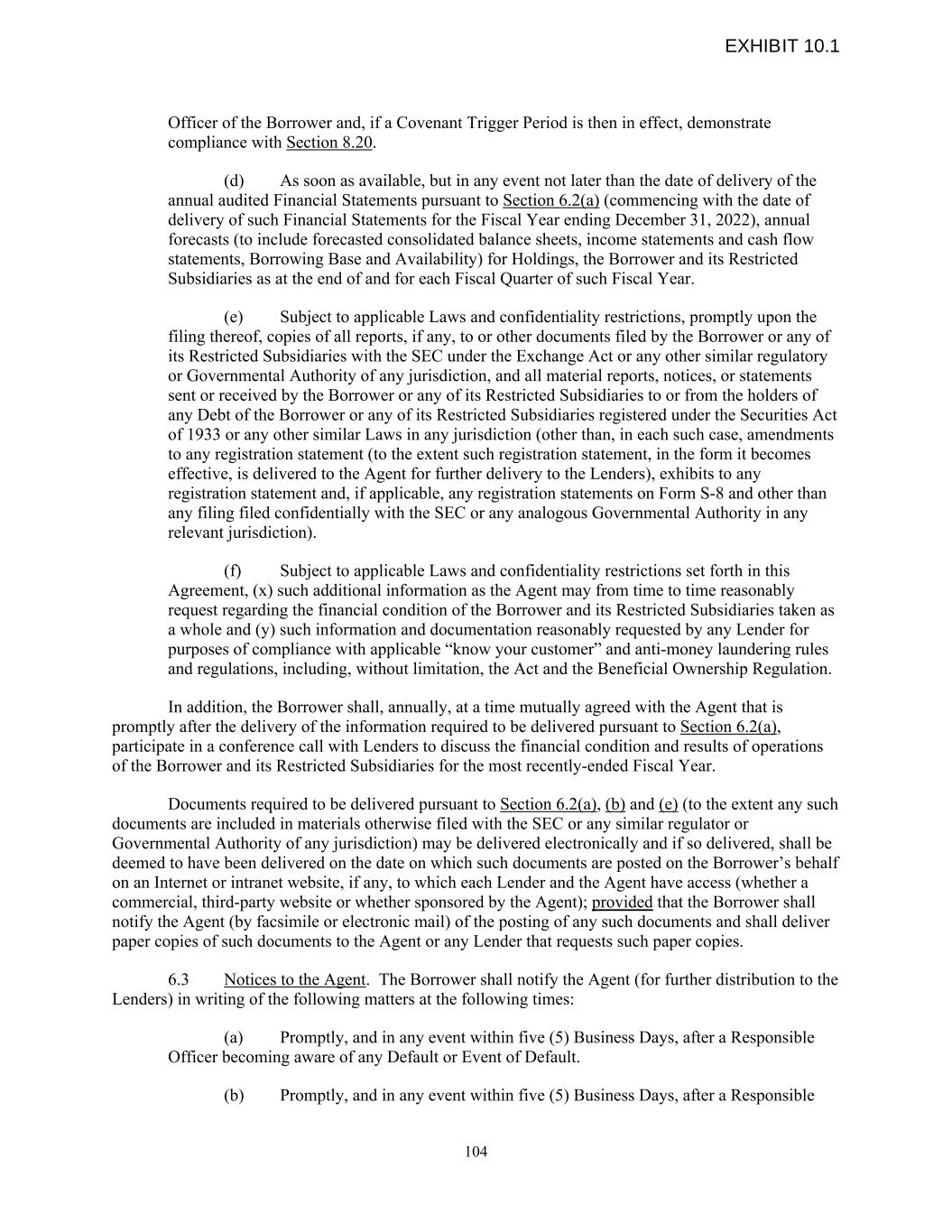 Officer of the Borrower and, if a Covenant Trigger Period is then in effect, demonstrate compliance with Section 8.20. (d) As soon as available, but in any event not later than the date of delivery of the annual audited Financial Statements pursuant to Section 6.2(a) (commencing with the date of delivery of such Financial Statements for the Fiscal Year ending December 31, 2022), annual forecasts (to include forecasted consolidated balance sheets, income statements and cash flow statements, Borrowing Base and Availability) for Holdings, the Borrower and its Restricted Subsidiaries as at the end of and for each Fiscal Quarter of such Fiscal Year. (e) Subject to applicable Laws and confidentiality restrictions, promptly upon the filing thereof, copies of all reports, if any, to or other documents filed by the Borrower or any of its Restricted Subsidiaries with the SEC under the Exchange Act or any other similar regulatory or Governmental Authority of any jurisdiction, and all material reports, notices, or statements sent or received by the Borrower or any of its Restricted Subsidiaries to or from the holders of any Debt of the Borrower or any of its Restricted Subsidiaries registered under the Securities Act of 1933 or any other similar Laws in any jurisdiction (other than, in each such case, amendments to any registration statement (to the extent such registration statement, in the form it becomes effective, is delivered to the Agent for further delivery to the Lenders), exhibits to any registration statement and, if applicable, any registration statements on Form S-8 and other than any filing filed confidentially with the SEC or any analogous Governmental Authority in any relevant jurisdiction). (f) Subject to applicable Laws and confidentiality restrictions set forth in this Agreement, (x) such additional information as the Agent may from time to time reasonably request regarding the financial condition of the Borrower and its Restricted Subsidiaries taken as a whole and (y) such information and documentation reasonably requested by any Lender for purposes of compliance with applicable “know your customer” and anti-money laundering rules and regulations, including, without limitation, the Act and the Beneficial Ownership Regulation. In addition, the Borrower shall, annually, at a time mutually agreed with the Agent that is promptly after the delivery of the information required to be delivered pursuant to Section 6.2(a), participate in a conference call with Lenders to discuss the financial condition and results of operations of the Borrower and its Restricted Subsidiaries for the most recently-ended Fiscal Year. Documents required to be delivered pursuant to Section 6.2(a), (b) and (e) (to the extent any such documents are included in materials otherwise filed with the SEC or any similar regulator or Governmental Authority of any jurisdiction) may be delivered electronically and if so delivered, shall be deemed to have been delivered on the date on which such documents are posted on the Borrower’s behalf on an Internet or intranet website, if any, to which each Lender and the Agent have access (whether a commercial, third-party website or whether sponsored by the Agent); provided that the Borrower shall notify the Agent (by facsimile or electronic mail) of the posting of any such documents and shall deliver paper copies of such documents to the Agent or any Lender that requests such paper copies. 6.3 Notices to the Agent. The Borrower shall notify the Agent (for further distribution to the Lenders) in writing of the following matters at the following times: (a) Promptly, and in any event within five (5) Business Days, after a Responsible Officer becoming aware of any Default or Event of Default. (b) Promptly, and in any event within five (5) Business Days, after a Responsible 104 EXHIBIT 10.1
