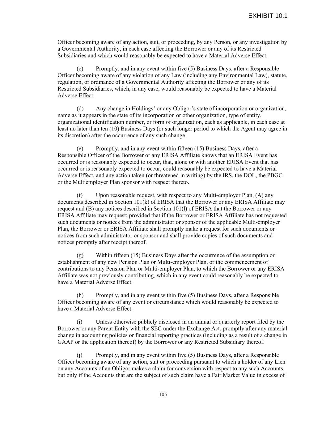 Officer becoming aware of any action, suit, or proceeding, by any Person, or any investigation by a Governmental Authority, in each case affecting the Borrower or any of its Restricted Subsidiaries and which would reasonably be expected to have a Material Adverse Effect. (c) Promptly, and in any event within five (5) Business Days, after a Responsible Officer becoming aware of any violation of any Law (including any Environmental Law), statute, regulation, or ordinance of a Governmental Authority affecting the Borrower or any of its Restricted Subsidiaries, which, in any case, would reasonably be expected to have a Material Adverse Effect. (d) Any change in Holdings’ or any Obligor’s state of incorporation or organization, name as it appears in the state of its incorporation or other organization, type of entity, organizational identification number, or form of organization, each as applicable, in each case at least no later than ten (10) Business Days (or such longer period to which the Agent may agree in its discretion) after the occurrence of any such change. (e) Promptly, and in any event within fifteen (15) Business Days, after a Responsible Officer of the Borrower or any ERISA Affiliate knows that an ERISA Event has occurred or is reasonably expected to occur, that, alone or with another ERISA Event that has occurred or is reasonably expected to occur, could reasonably be expected to have a Material Adverse Effect, and any action taken (or threatened in writing) by the IRS, the DOL, the PBGC or the Multiemployer Plan sponsor with respect thereto. (f) Upon reasonable request, with respect to any Multi-employer Plan, (A) any documents described in Section 101(k) of ERISA that the Borrower or any ERISA Affiliate may request and (B) any notices described in Section 101(l) of ERISA that the Borrower or any ERISA Affiliate may request; provided that if the Borrower or ERISA Affiliate has not requested such documents or notices from the administrator or sponsor of the applicable Multi-employer Plan, the Borrower or ERISA Affiliate shall promptly make a request for such documents or notices from such administrator or sponsor and shall provide copies of such documents and notices promptly after receipt thereof. (g) Within fifteen (15) Business Days after the occurrence of the assumption or establishment of any new Pension Plan or Multi-employer Plan, or the commencement of contributions to any Pension Plan or Multi-employer Plan, to which the Borrower or any ERISA Affiliate was not previously contributing, which in any event could reasonably be expected to have a Material Adverse Effect. (h) Promptly, and in any event within five (5) Business Days, after a Responsible Officer becoming aware of any event or circumstance which would reasonably be expected to have a Material Adverse Effect. (i) Unless otherwise publicly disclosed in an annual or quarterly report filed by the Borrower or any Parent Entity with the SEC under the Exchange Act, promptly after any material change in accounting policies or financial reporting practices (including as a result of a change in GAAP or the application thereof) by the Borrower or any Restricted Subsidiary thereof. (j) Promptly, and in any event within five (5) Business Days, after a Responsible Officer becoming aware of any action, suit or proceeding pursuant to which a holder of any Lien on any Accounts of an Obligor makes a claim for conversion with respect to any such Accounts but only if the Accounts that are the subject of such claim have a Fair Market Value in excess of 105 EXHIBIT 10.1