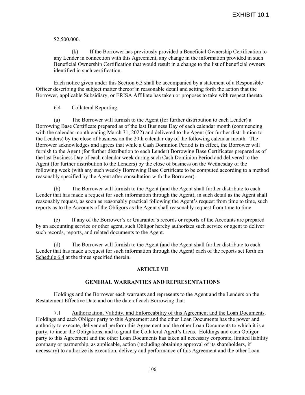 $2,500,000. (k) If the Borrower has previously provided a Beneficial Ownership Certification to any Lender in connection with this Agreement, any change in the information provided in such Beneficial Ownership Certification that would result in a change to the list of beneficial owners identified in such certification. Each notice given under this Section 6.3 shall be accompanied by a statement of a Responsible Officer describing the subject matter thereof in reasonable detail and setting forth the action that the Borrower, applicable Subsidiary, or ERISA Affiliate has taken or proposes to take with respect thereto. 6.4 Collateral Reporting. (a) The Borrower will furnish to the Agent (for further distribution to each Lender) a Borrowing Base Certificate prepared as of the last Business Day of each calendar month (commencing with the calendar month ending March 31, 2022) and delivered to the Agent (for further distribution to the Lenders) by the close of business on the 20th calendar day of the following calendar month. The Borrower acknowledges and agrees that while a Cash Dominion Period is in effect, the Borrower will furnish to the Agent (for further distribution to each Lender) Borrowing Base Certificates prepared as of the last Business Day of each calendar week during such Cash Dominion Period and delivered to the Agent (for further distribution to the Lenders) by the close of business on the Wednesday of the following week (with any such weekly Borrowing Base Certificate to be computed according to a method reasonably specified by the Agent after consultation with the Borrower). (b) The Borrower will furnish to the Agent (and the Agent shall further distribute to each Lender that has made a request for such information through the Agent), in such detail as the Agent shall reasonably request, as soon as reasonably practical following the Agent’s request from time to time, such reports as to the Accounts of the Obligors as the Agent shall reasonably request from time to time. (c) If any of the Borrower’s or Guarantor’s records or reports of the Accounts are prepared by an accounting service or other agent, such Obligor hereby authorizes such service or agent to deliver such records, reports, and related documents to the Agent. (d) The Borrower will furnish to the Agent (and the Agent shall further distribute to each Lender that has made a request for such information through the Agent) each of the reports set forth on Schedule 6.4 at the times specified therein. ARTICLE VII GENERAL WARRANTIES AND REPRESENTATIONS Holdings and the Borrower each warrants and represents to the Agent and the Lenders on the Restatement Effective Date and on the date of each Borrowing that: 7.1 Authorization, Validity, and Enforceability of this Agreement and the Loan Documents. Holdings and each Obligor party to this Agreement and the other Loan Documents has the power and authority to execute, deliver and perform this Agreement and the other Loan Documents to which it is a party, to incur the Obligations, and to grant the Collateral Agent’s Liens. Holdings and each Obligor party to this Agreement and the other Loan Documents has taken all necessary corporate, limited liability company or partnership, as applicable, action (including obtaining approval of its shareholders, if necessary) to authorize its execution, delivery and performance of this Agreement and the other Loan 106 EXHIBIT 10.1