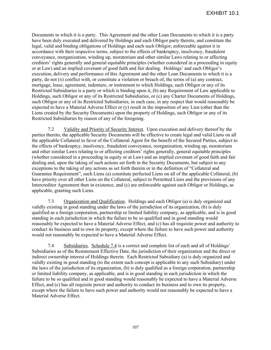 Documents to which it is a party. This Agreement and the other Loan Documents to which it is a party have been duly executed and delivered by Holdings and each Obligor party thereto, and constitute the legal, valid and binding obligations of Holdings and each such Obligor, enforceable against it in accordance with their respective terms, subject to the effects of bankruptcy, insolvency, fraudulent conveyance, reorganization, winding up, moratorium and other similar Laws relating to or affecting creditors’ rights generally and general equitable principles (whether considered in a proceeding in equity or at Law) and an implied covenant of good faith and fair dealing. Holdings’ and each Obligor’s execution, delivery and performance of this Agreement and the other Loan Documents to which it is a party, do not (x) conflict with, or constitute a violation or breach of, the terms of (a) any contract, mortgage, lease, agreement, indenture, or instrument to which Holdings, such Obligor or any of its Restricted Subsidiaries is a party or which is binding upon it, (b) any Requirement of Law applicable to Holdings, such Obligor or any of its Restricted Subsidiaries, or (c) any Charter Documents of Holdings, such Obligor or any of its Restricted Subsidiaries, in each case, in any respect that would reasonably be expected to have a Material Adverse Effect or (y) result in the imposition of any Lien (other than the Liens created by the Security Documents) upon the property of Holdings, such Obligor or any of its Restricted Subsidiaries by reason of any of the foregoing. 7.2 Validity and Priority of Security Interest. Upon execution and delivery thereof by the parties thereto, the applicable Security Documents will be effective to create legal and valid Liens on all the applicable Collateral in favor of the Collateral Agent for the benefit of the Secured Parties, subject to the effects of bankruptcy, insolvency, fraudulent conveyance, reorganization, winding up, moratorium and other similar Laws relating to or affecting creditors’ rights generally, general equitable principles (whether considered in a proceeding in equity or at Law) and an implied covenant of good faith and fair dealing and, upon the taking of such actions set forth in the Security Documents, but subject to any exceptions to the taking of any actions as set forth therein or in the definition of “Collateral and Guarantee Requirement”, such Liens (a) constitute perfected Liens on all of the applicable Collateral, (b) have priority over all other Liens on the Collateral, subject to Permitted Liens and the provisions of any Intercreditor Agreement then in existence, and (c) are enforceable against each Obligor or Holdings, as applicable, granting such Liens. 7.3 Organization and Qualification. Holdings and each Obligor (a) is duly organized and validly existing in good standing under the laws of the jurisdiction of its organization, (b) is duly qualified as a foreign corporation, partnership or limited liability company, as applicable, and is in good standing in each jurisdiction in which the failure to be so qualified and in good standing would reasonably be expected to have a Material Adverse Effect, and (c) has all requisite power and authority to conduct its business and to own its property, except where the failure to have such power and authority would not reasonably be expected to have a Material Adverse Effect. 7.4 Subsidiaries. Schedule 7.4 is a correct and complete list of each and all of Holdings’ Subsidiaries as of the Restatement Effective Date, the jurisdiction of their organization and the direct or indirect ownership interest of Holdings therein. Each Restricted Subsidiary (a) is duly organized and validly existing in good standing (to the extent such concept is applicable to any such Subsidiary) under the laws of the jurisdiction of its organization, (b) is duly qualified as a foreign corporation, partnership or limited liability company, as applicable, and is in good standing in each jurisdiction in which the failure to be so qualified and in good standing would reasonably be expected to have a Material Adverse Effect, and (c) has all requisite power and authority to conduct its business and to own its property, except where the failure to have such power and authority would not reasonably be expected to have a Material Adverse Effect. 107 EXHIBIT 10.1